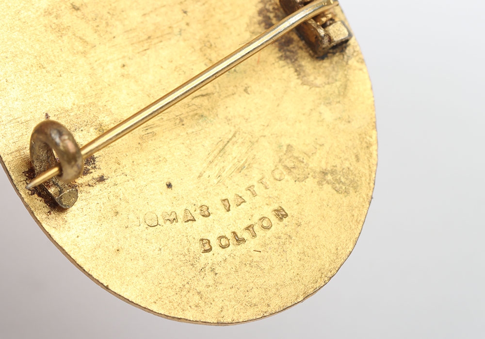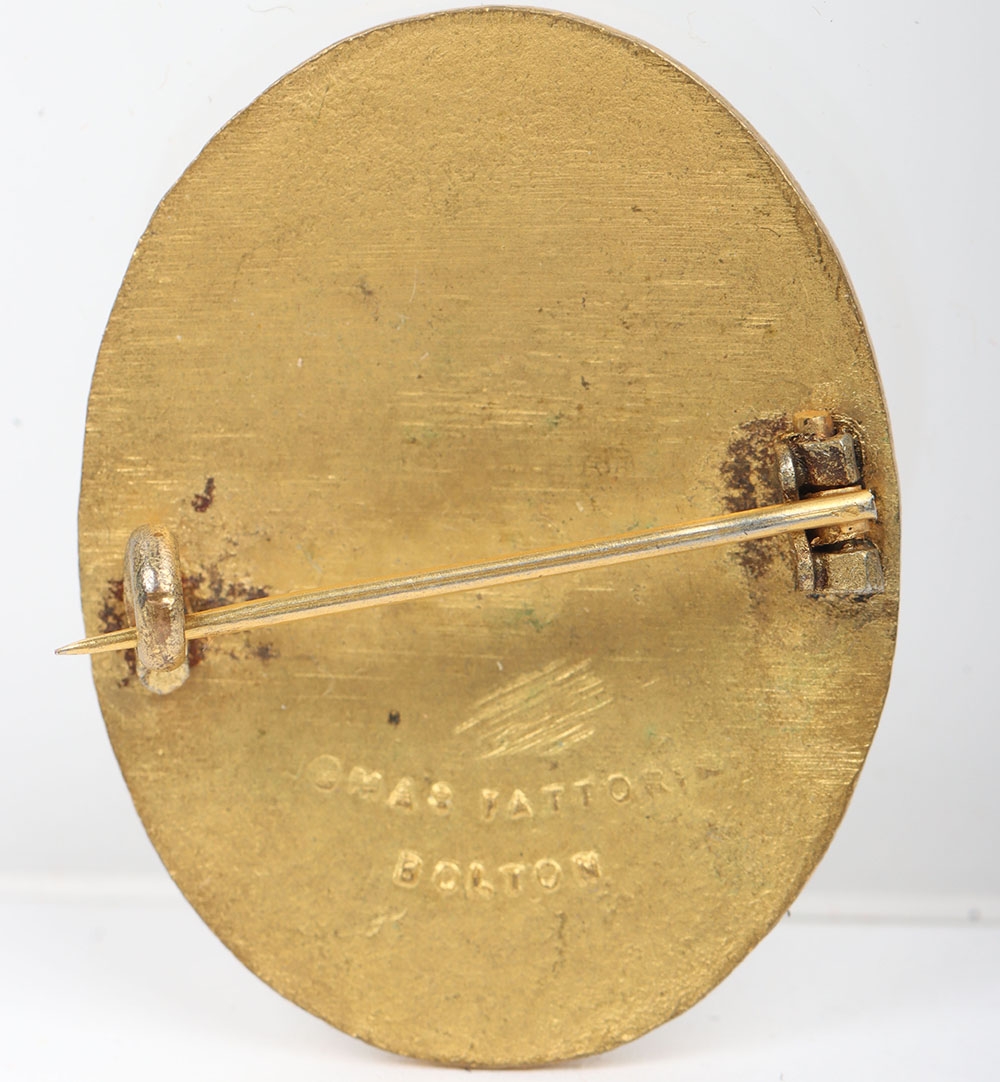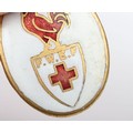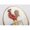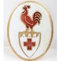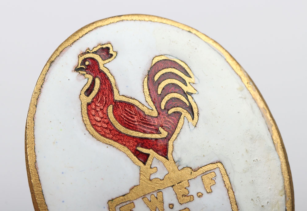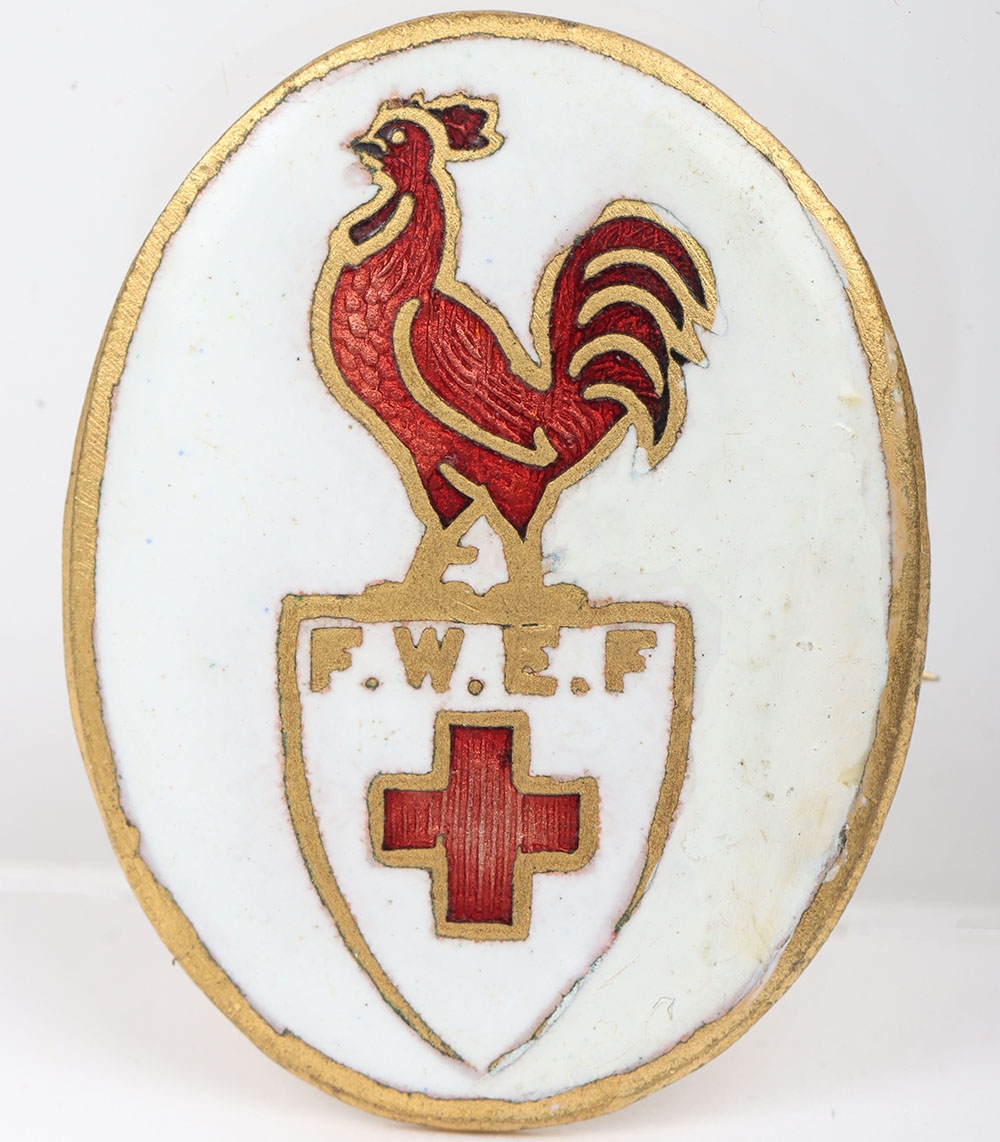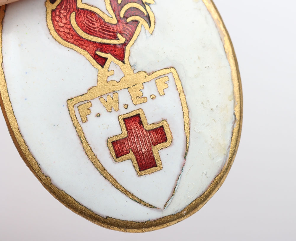 Scarce WW1 French Wounded Emergency Fund Badge, fine example of a gilt brass oval badge with white enamel front, shield with red cross and lettering ‘F.W.E.F’ surmounted by red Cockerel. Made by Thomas Fattorini, Bolton. Pin fitting to the reverse of the bade.