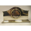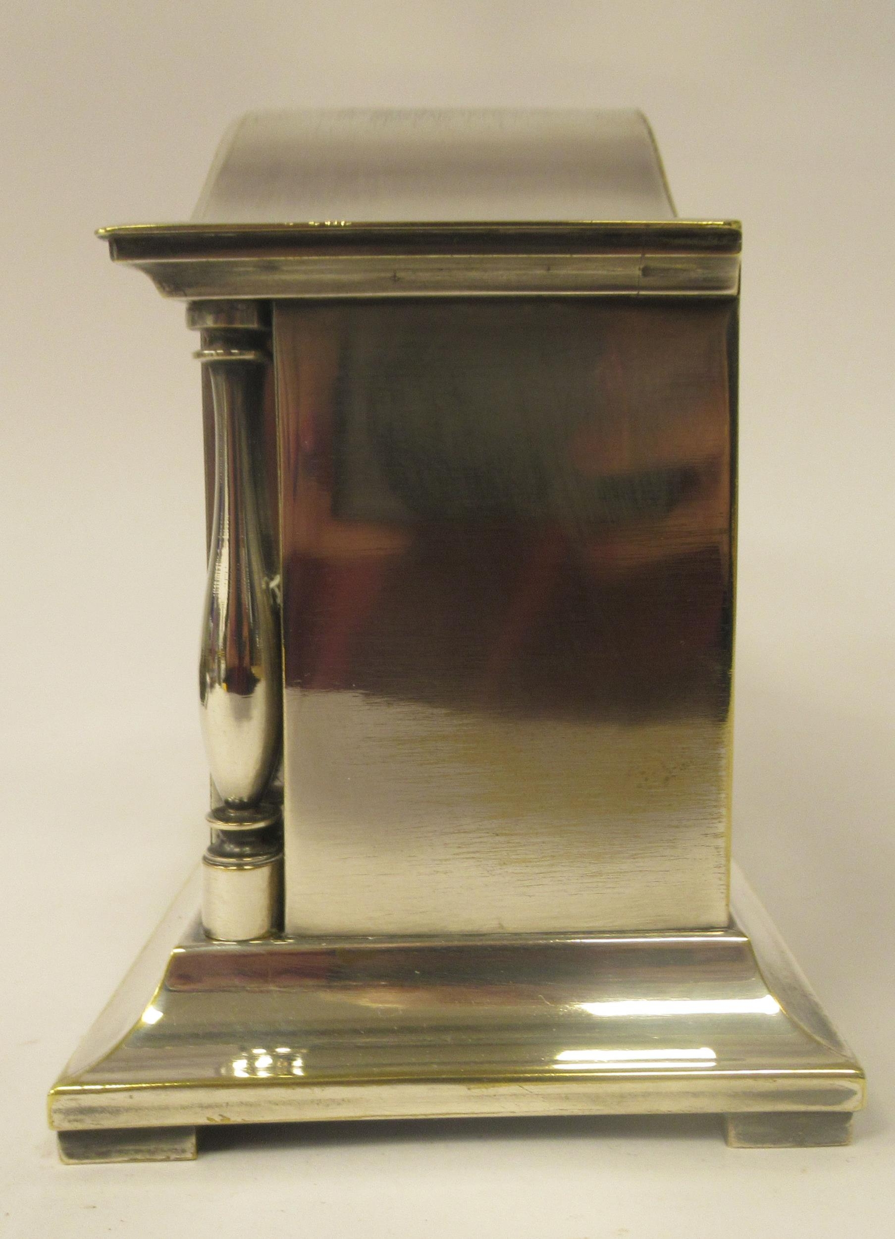 A 1930s elecroplated brass mantel timepiece with a low arched case and spindled baluster flank pillars, on a plinth; the French movement faced by a convex white enamel Roman dial 6"h