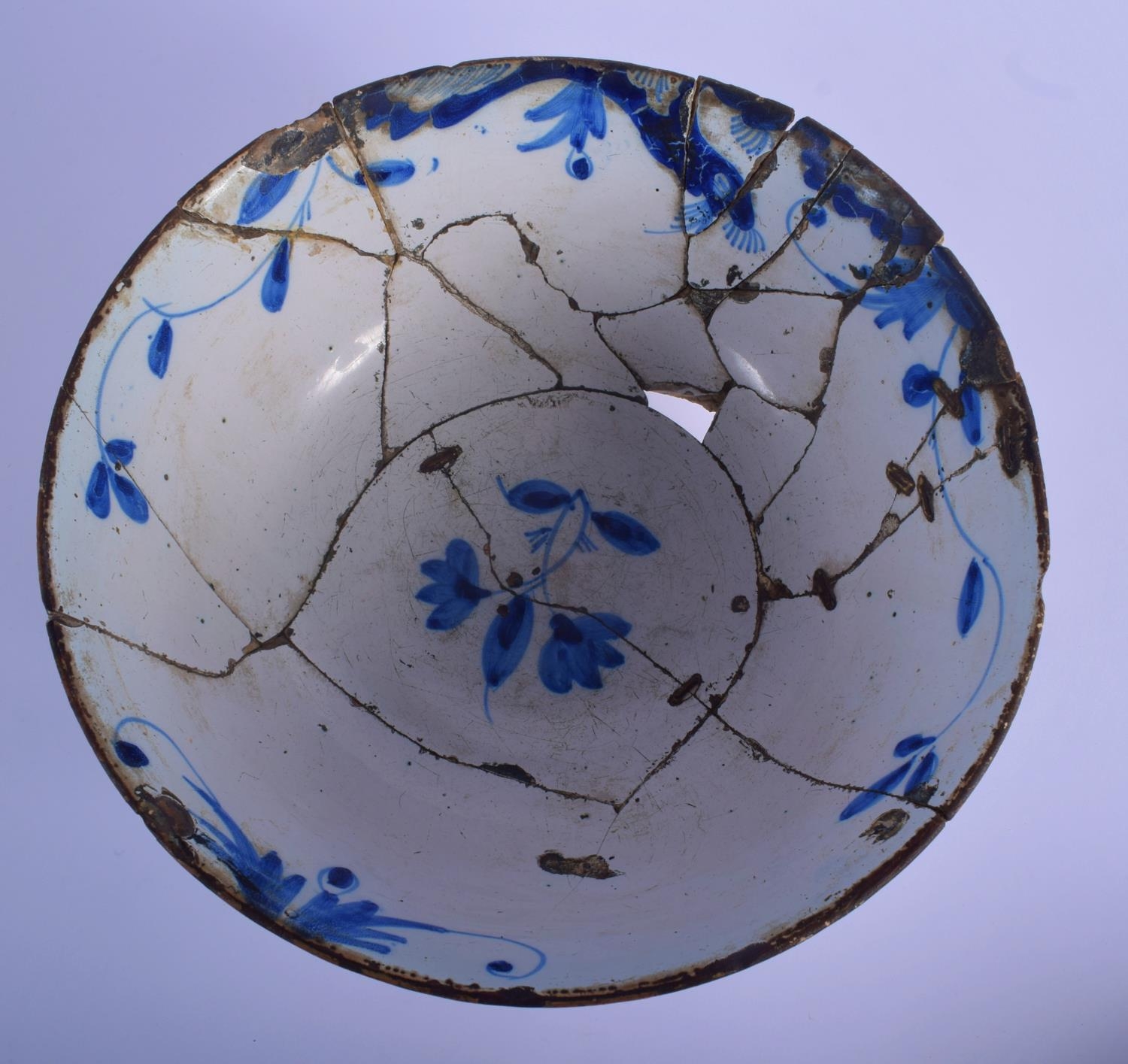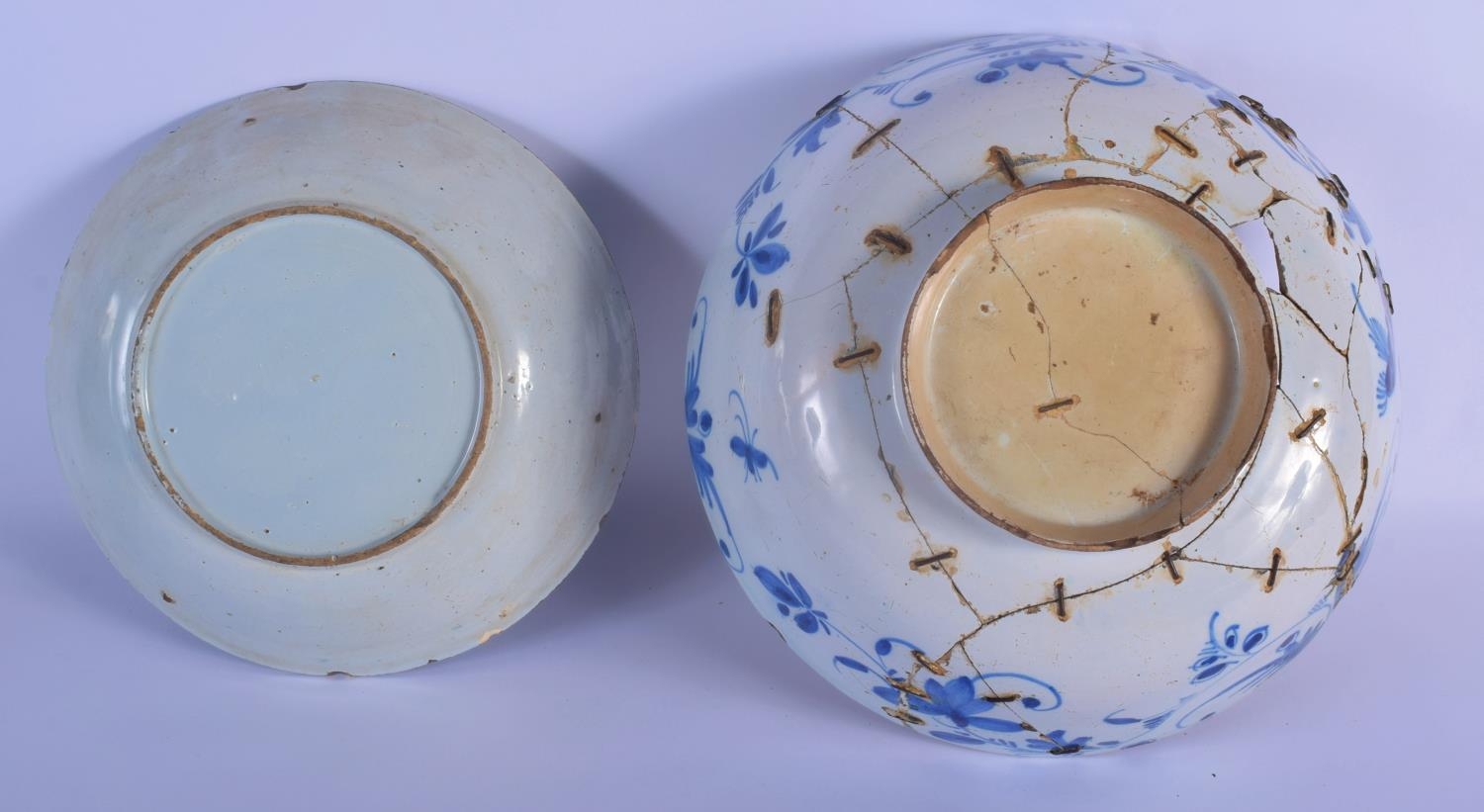A LARGE 18TH CENTURY DELFT BLUE AND WHITE BOWL together with a similar shallow dish. Largest 22 cm x 12 cm. (2)