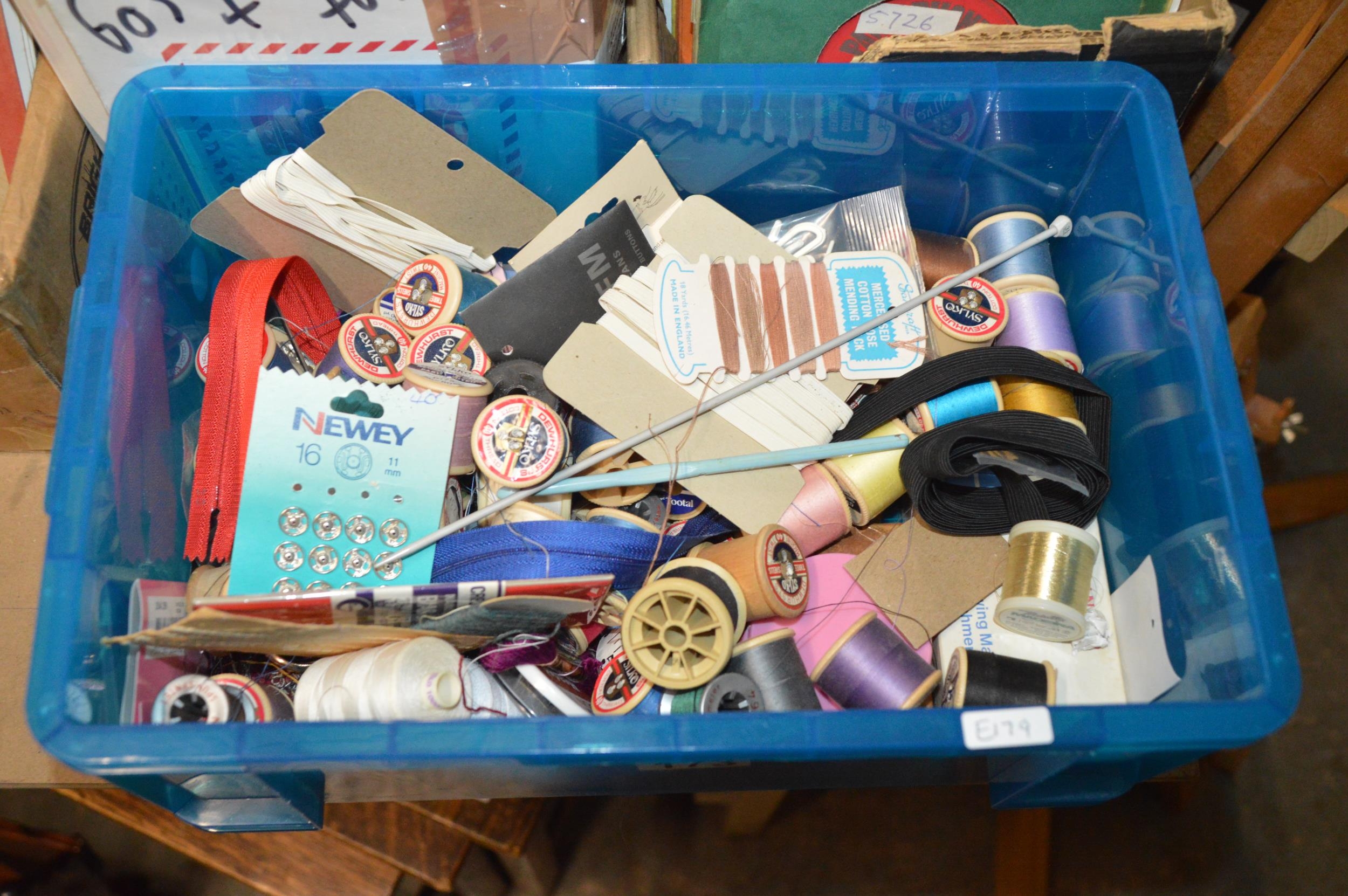 tub of knitting accessories