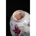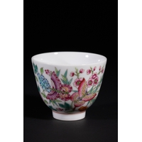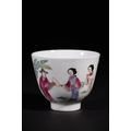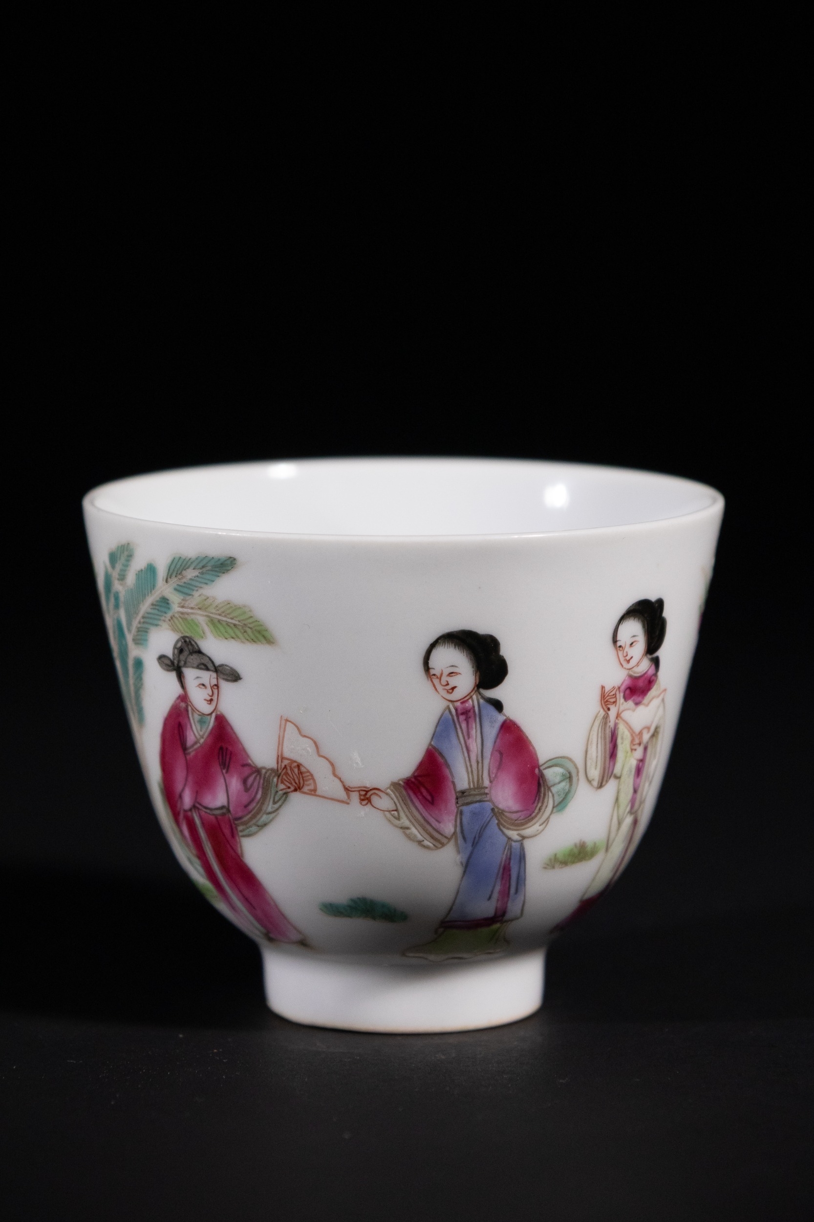A Chinese Famille Rose Porcelain Cup with Ladies, Qianlong Mark - A Chinese Famille Rose porcelain cup, decorated with polychrome overglaze enamels. The exterior features a vibrant scene depicting elegant female figures (likely *meiren*) in traditional attire, interacting within a sparse landscape with foliage. The base bears a four-character iron-red seal mark, "大清乾隆年製" (Da Qing Qianlong Nian Zhi), which translates to "Made in the Qianlong reign of the Great Qing dynasty."