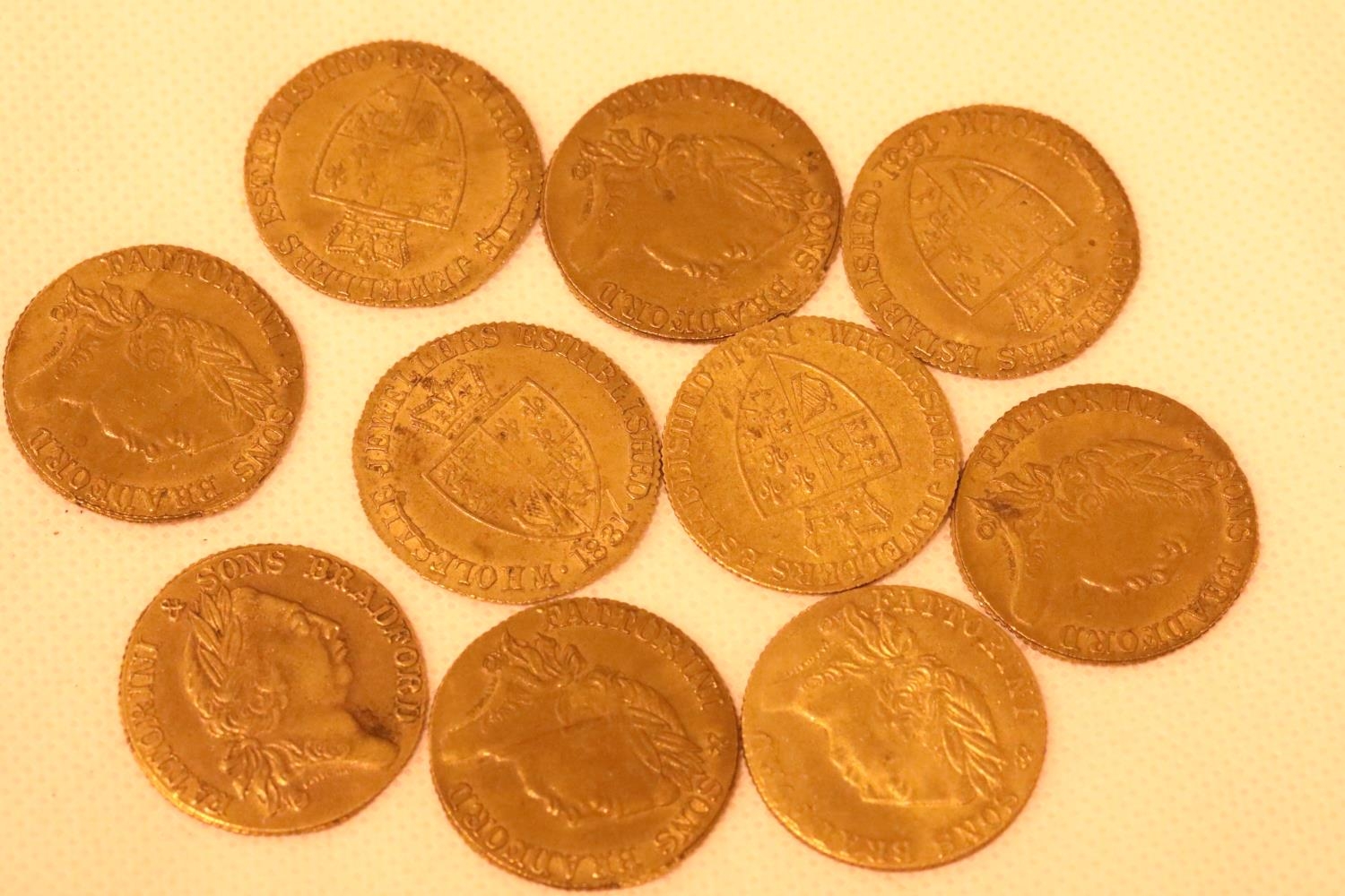 Ten Guinea gaming tokens. P&P Group 1 (£14+VAT for the first lot and £1+VAT for subsequent lots)