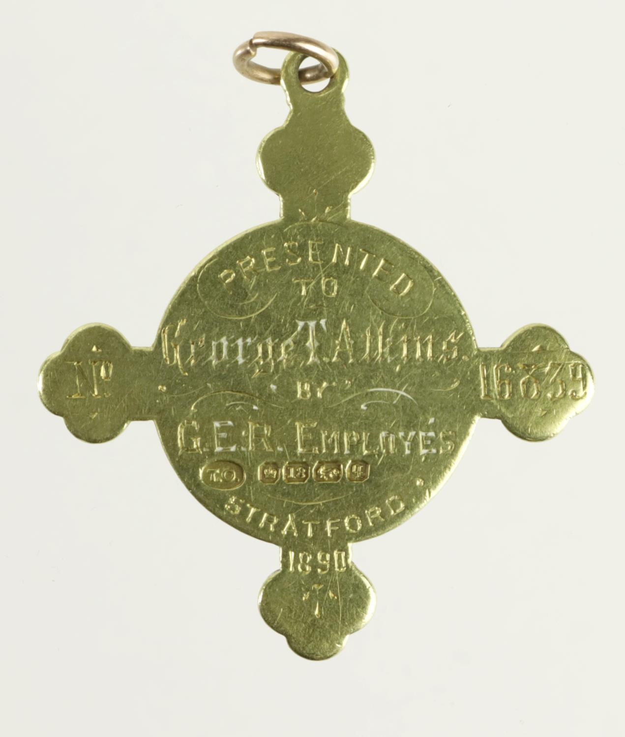 Great Eastern Railway 18ct. Gold St. John Ambulance Association medal hallmarked T.O. Crown, 18, Birmingham 1890 - reads on the back "Presented to George T. Atkins by G.E.R. Employees, Stratford, 1890, No. 16839". Weighs 10.8gms