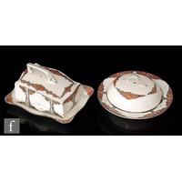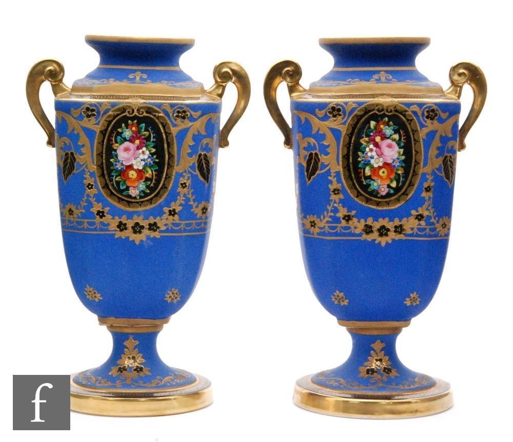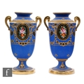 A pair of Noritake pedestal vases each decorated with sprays of flowers against a matt blue ground with gilt and matt black scrolls, garlands and flowers, printed marks, height 25cm, one S/D