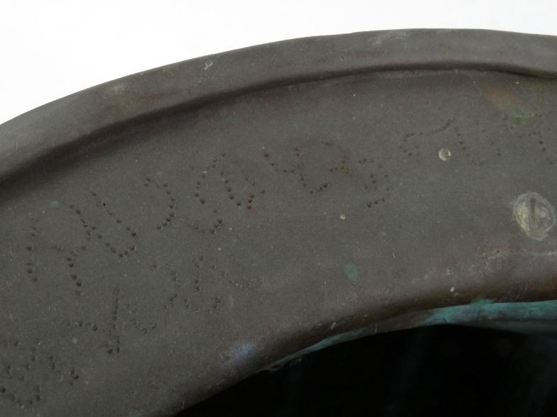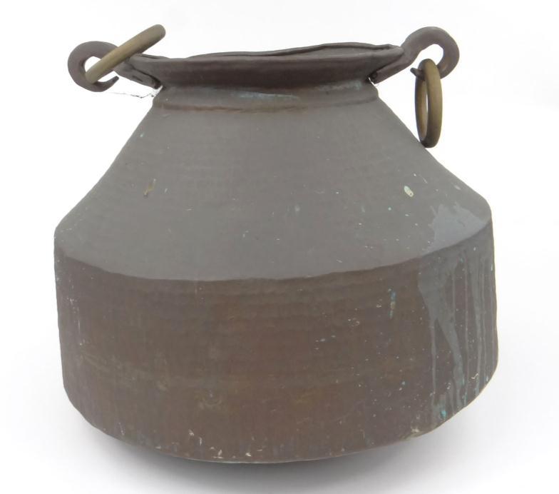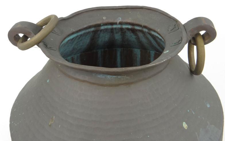 Large Indian hammered copper vessel with brass loop handles,...