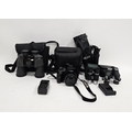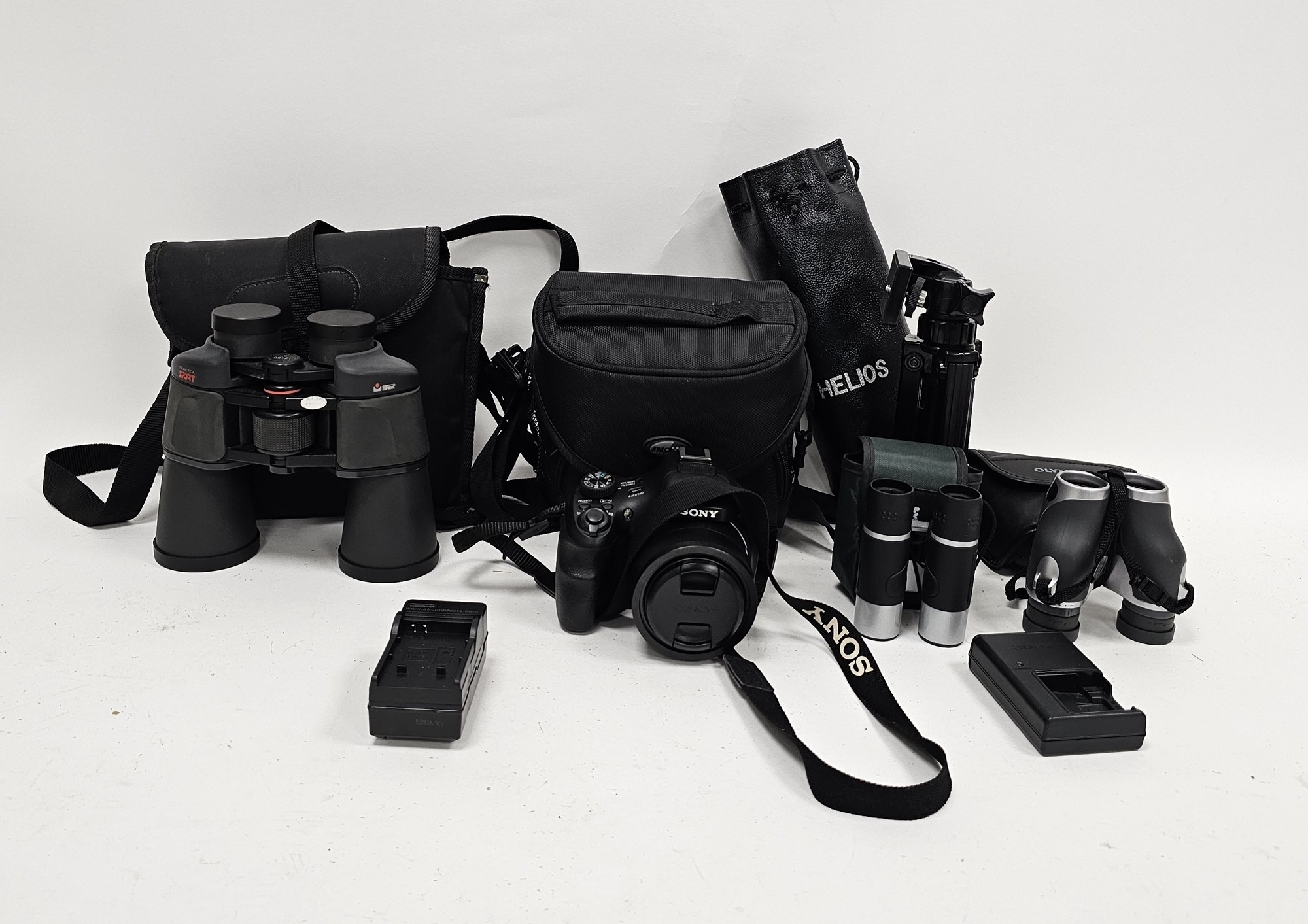 Sony Cyber-shop GPS camera with soft case together with a folding camera tripod and three sets of binoculars including Praktica sport 12x50, National Trust 8x21 and Olympus 10x25 PC 1, all in soft cases