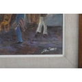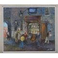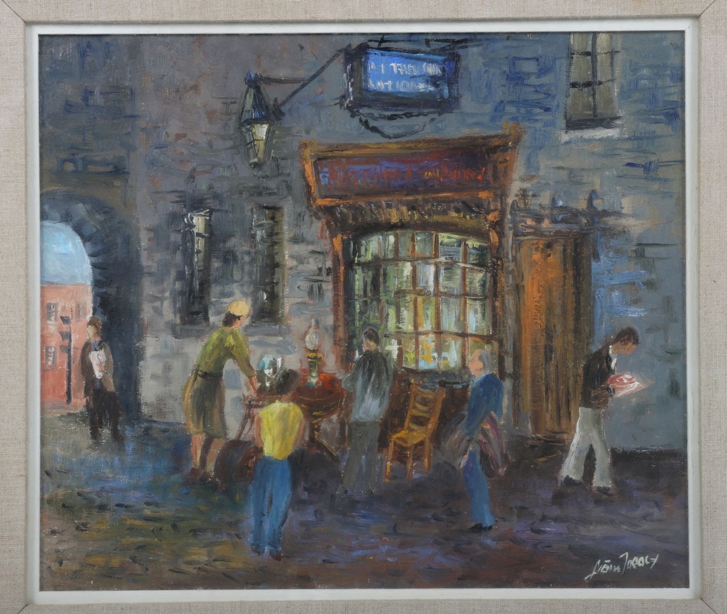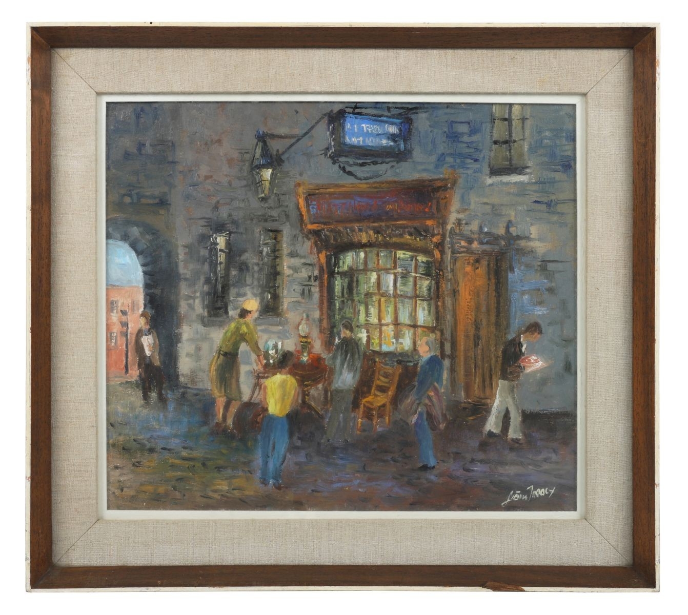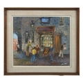 Oil on board depicting figures gathered outside a warmly lit shopfront at night, titled The Antique Shop. Signed lower right. Image: 34 x 39 cm. Framed: 47 x 52 cm. PICTURES AND PRINTS Thursday 11th December 2025 21:14:08