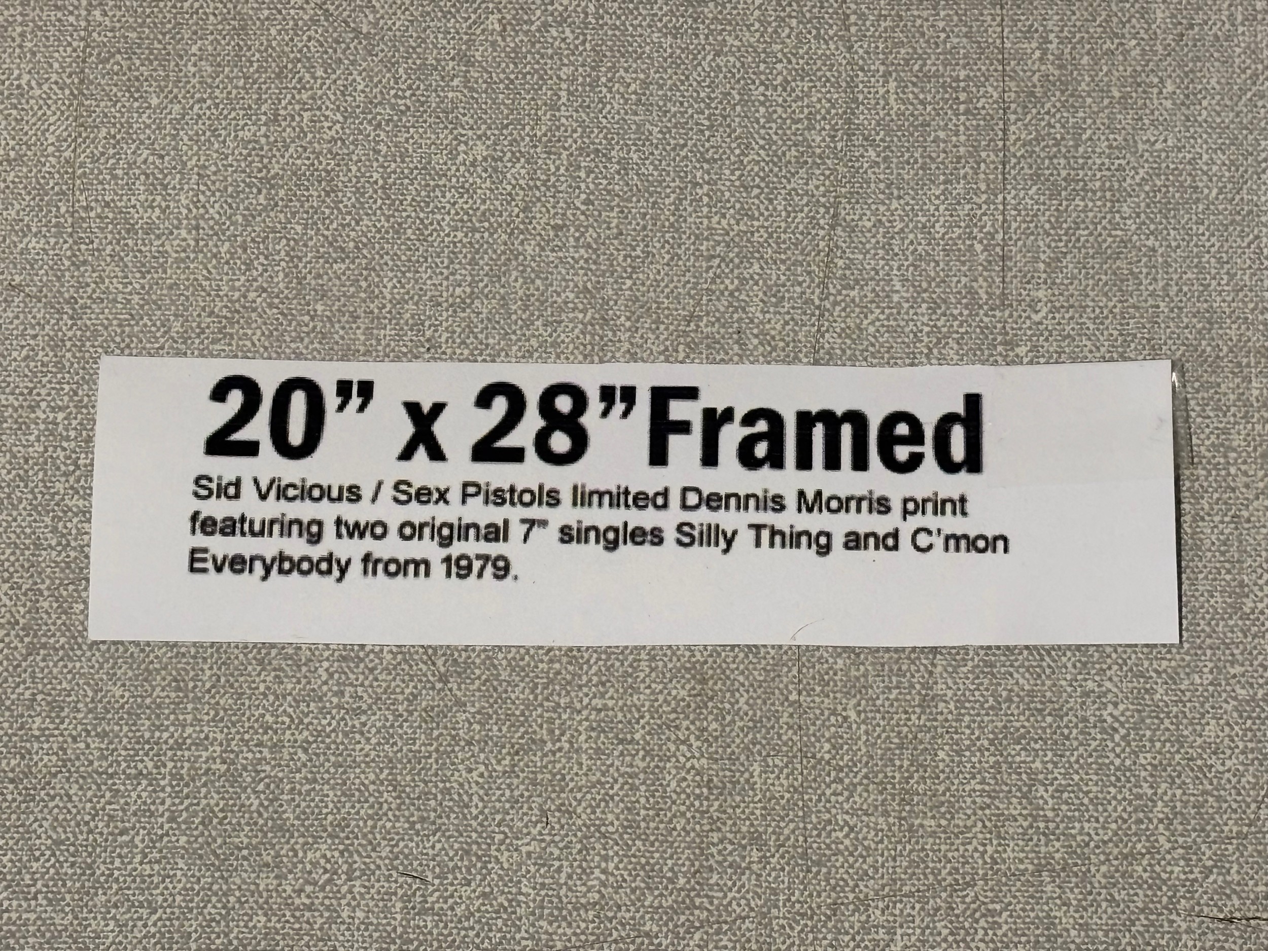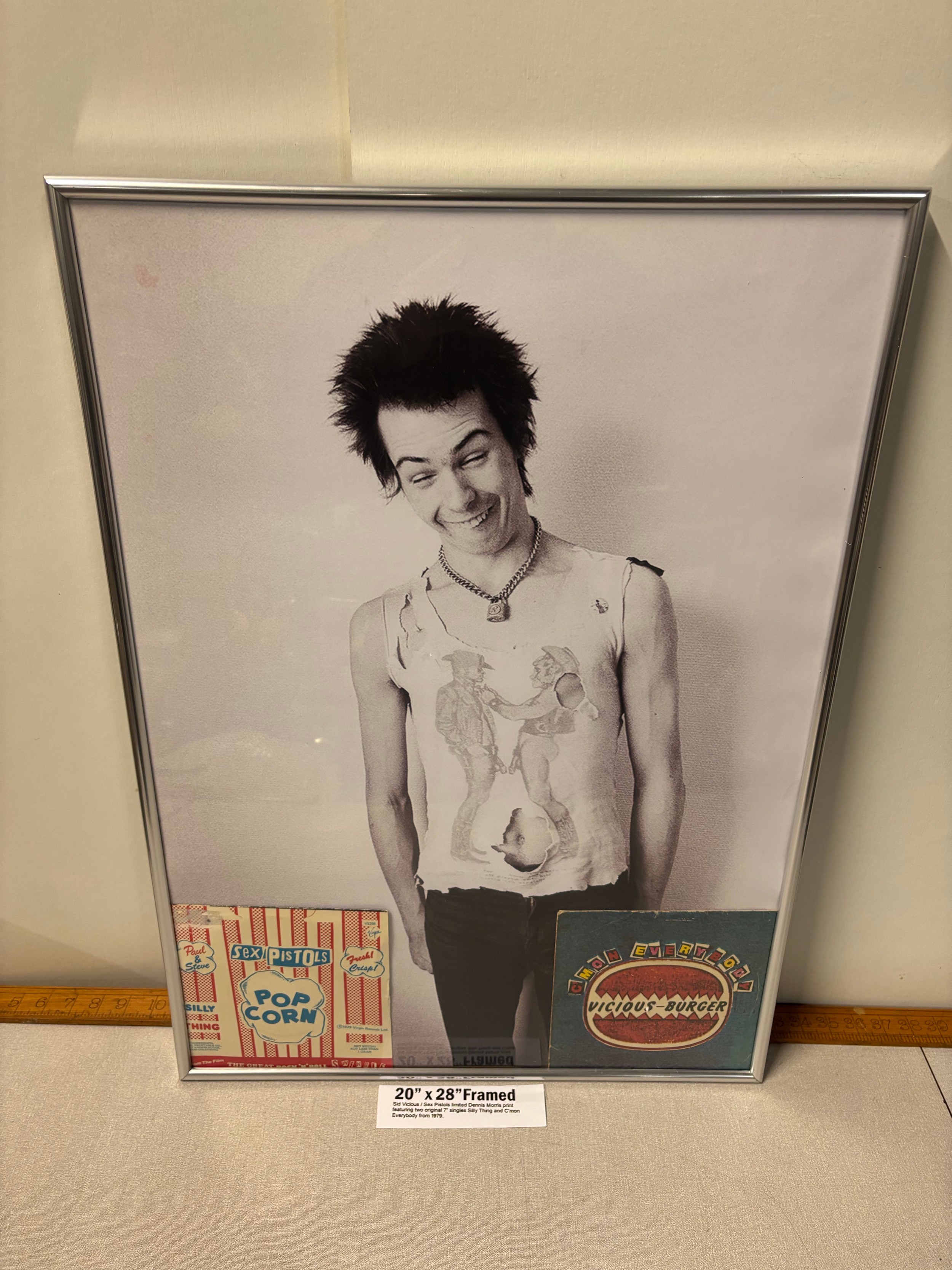 Framed Sid Vicious/ Sex Pistols limited Dennis Morris print featuring 2 7" singles Silly Thing and C'mon everybody from 1979 20x28" (info in pictures)