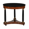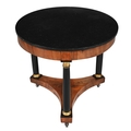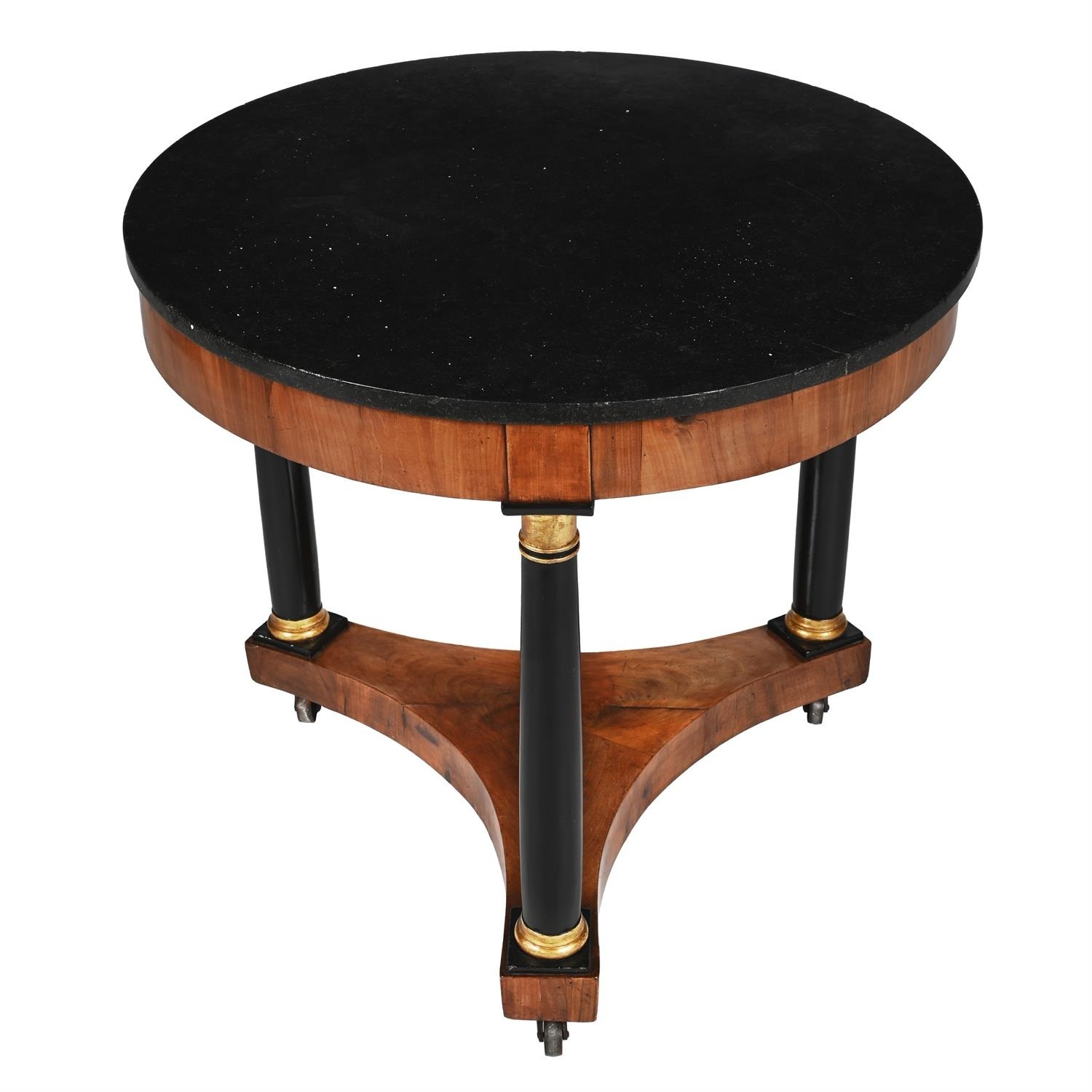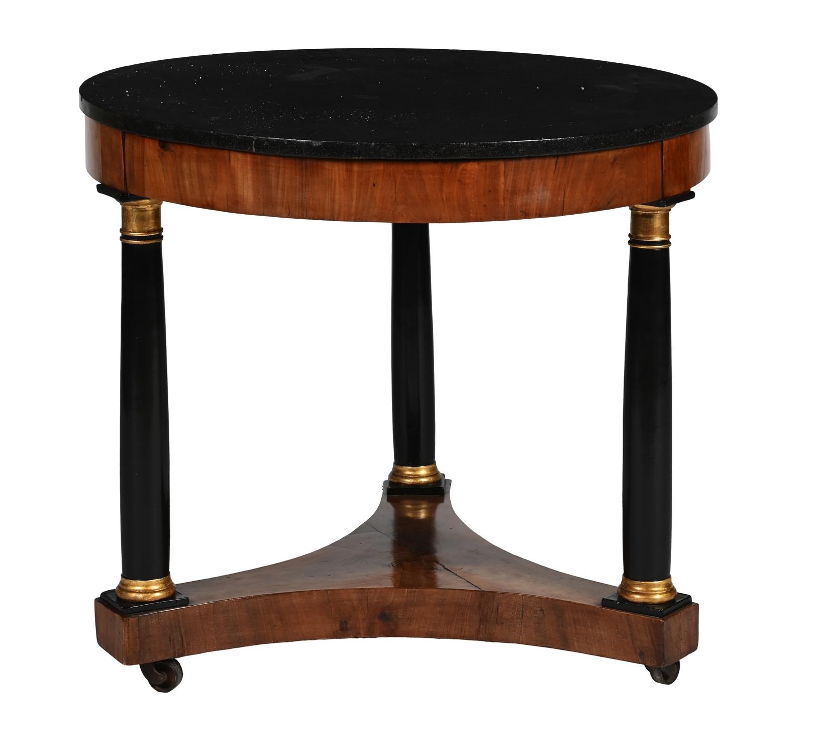 A MAHOGANY EBONISED AND PARCEL GILT GUERIDON OR CENTRE TABLEIN EMPIRE STYLE, LATE 19TH CENTURYWith a black marble top74.5cm high, 81cm diameterProvenance:Property of a Lady, Eaton Square, London