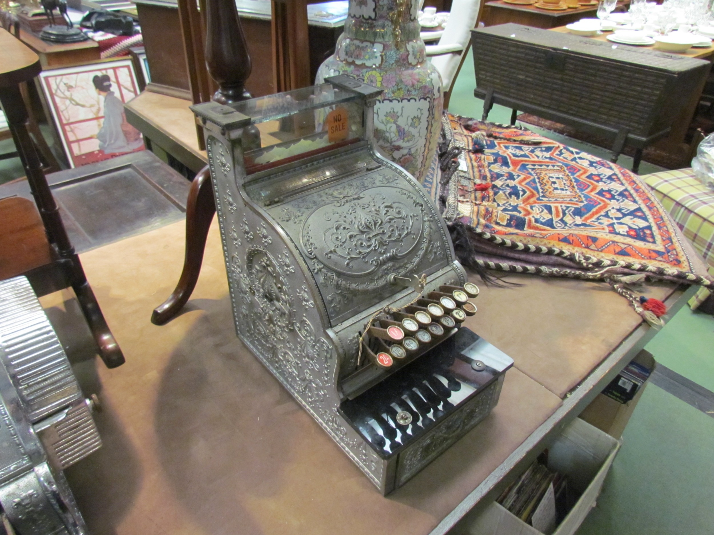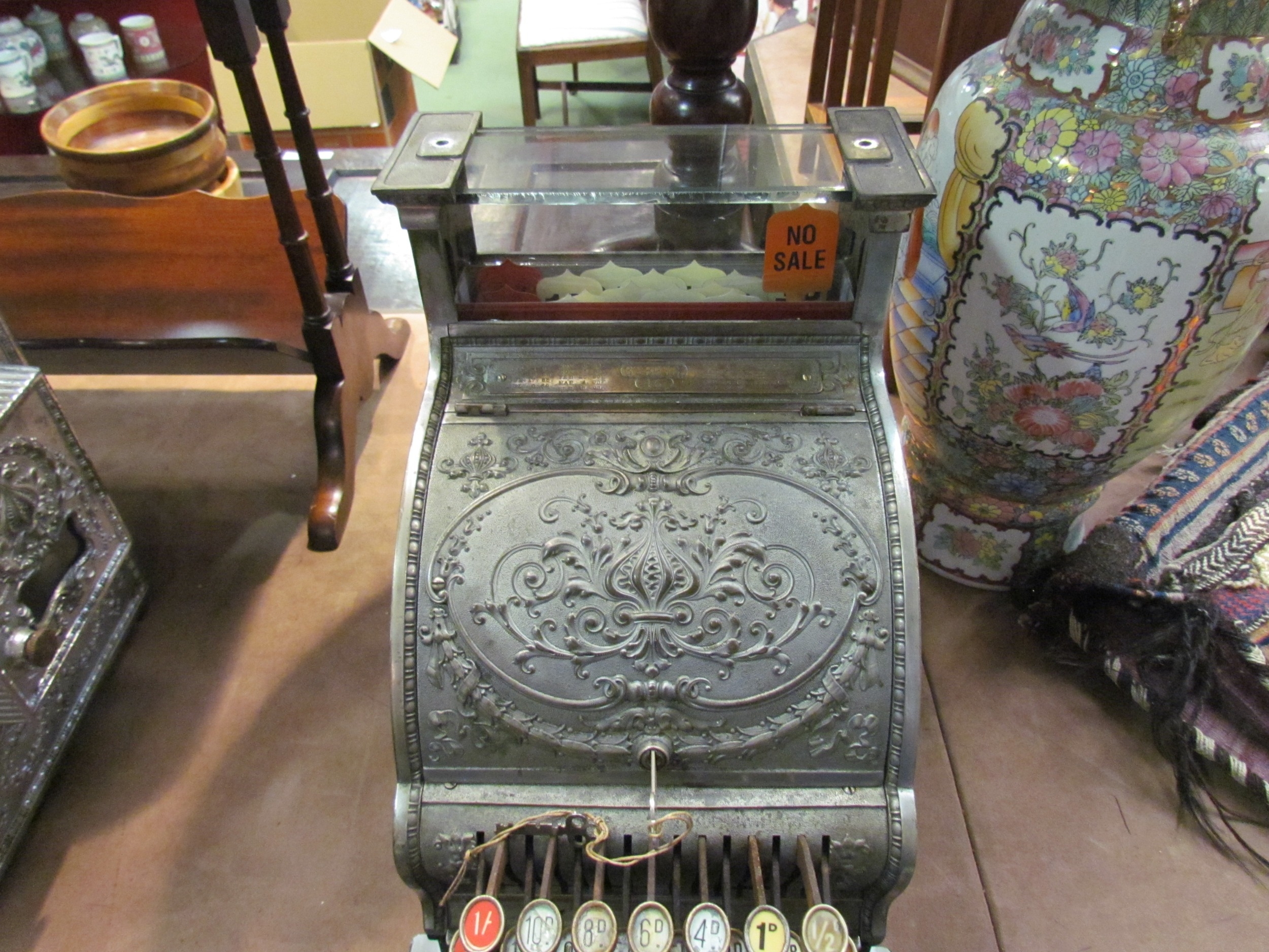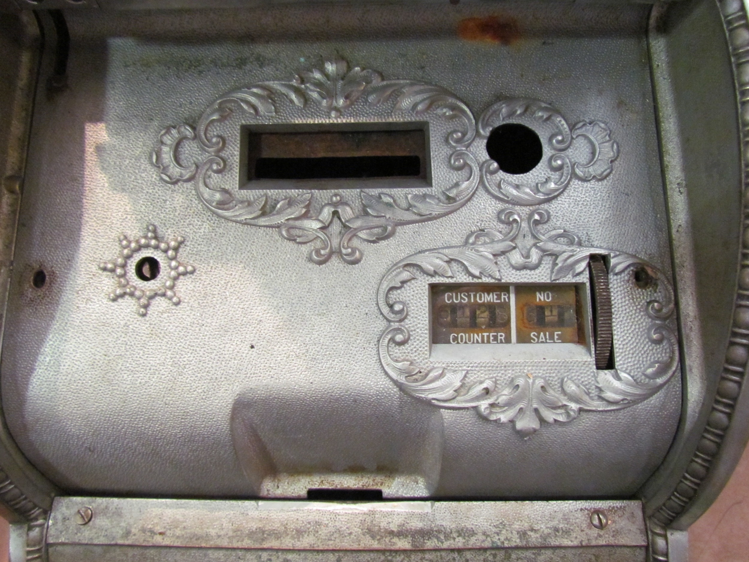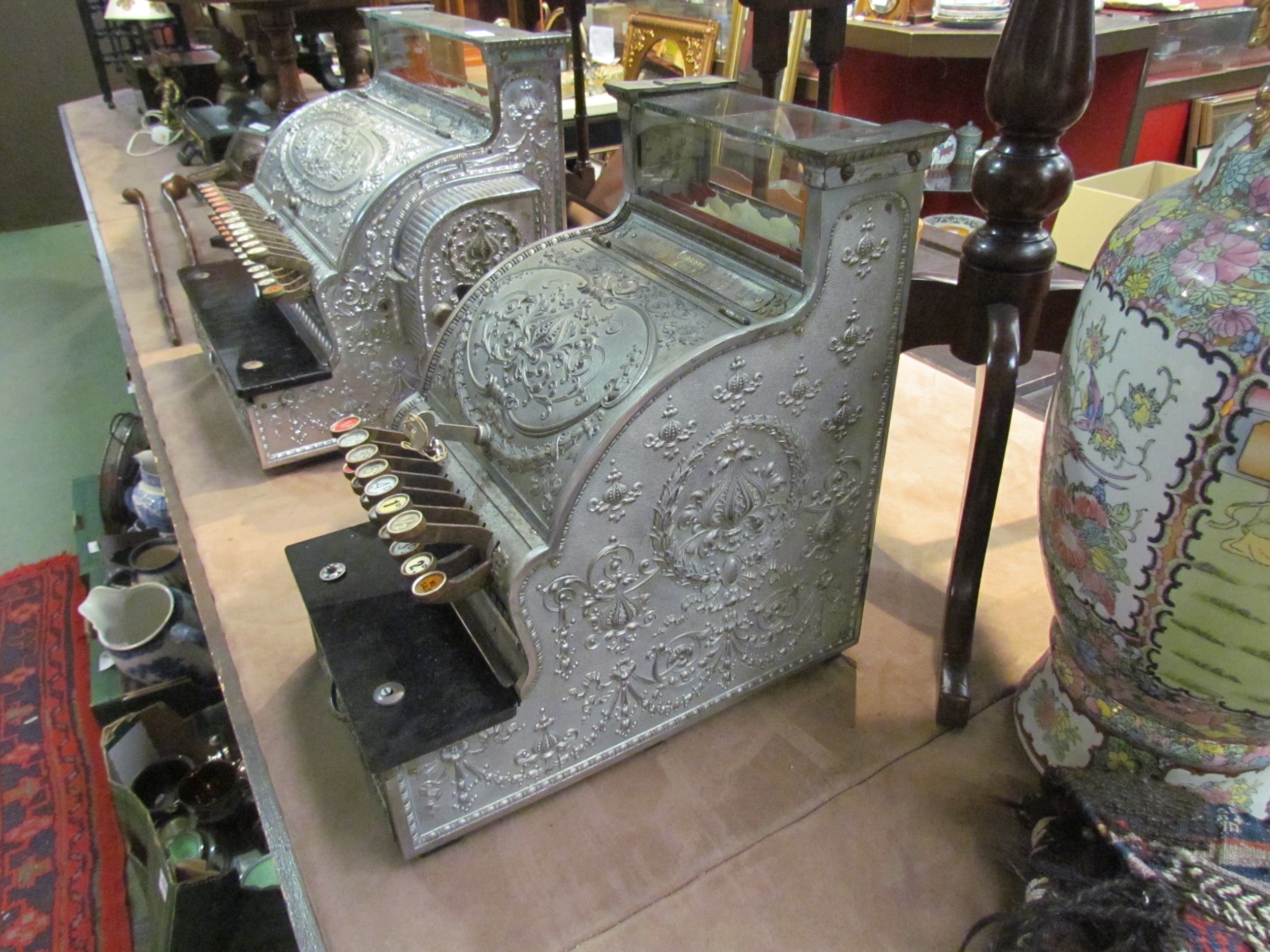 NCR cash register; model 46, serial No. 328976 (made in 1902). Small "candy shop" machine, 15 levers, several with original glass keychecks. Nickel plated case, Dolphin pattern, 42cm tall x 38.5cm deep