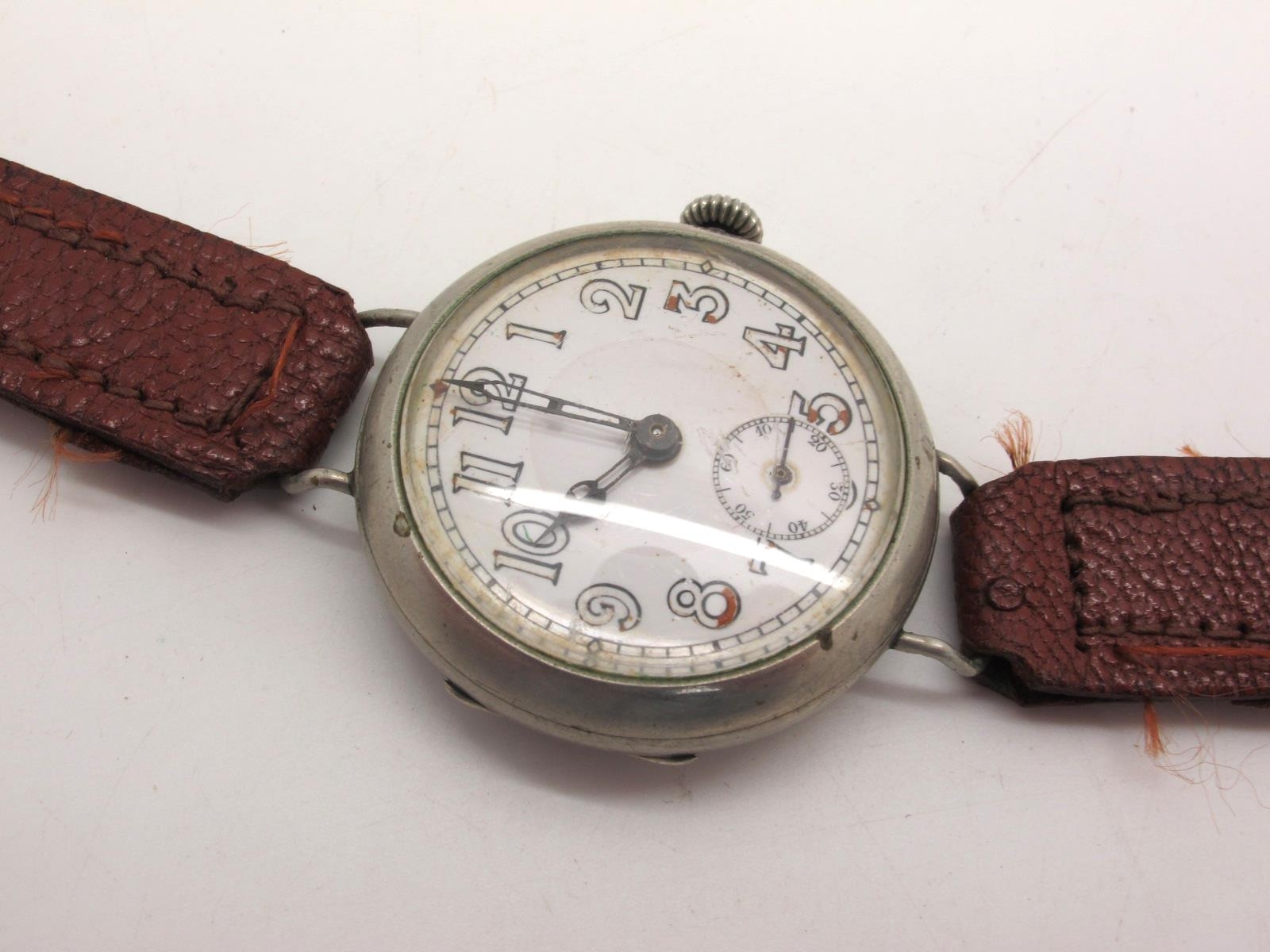A Vintage Trench Style Gent's Wristwatch, the white dial with Arabic numerals and seconds subsidiary dial, the movement numbered "2005744", within plain case, on a strap.