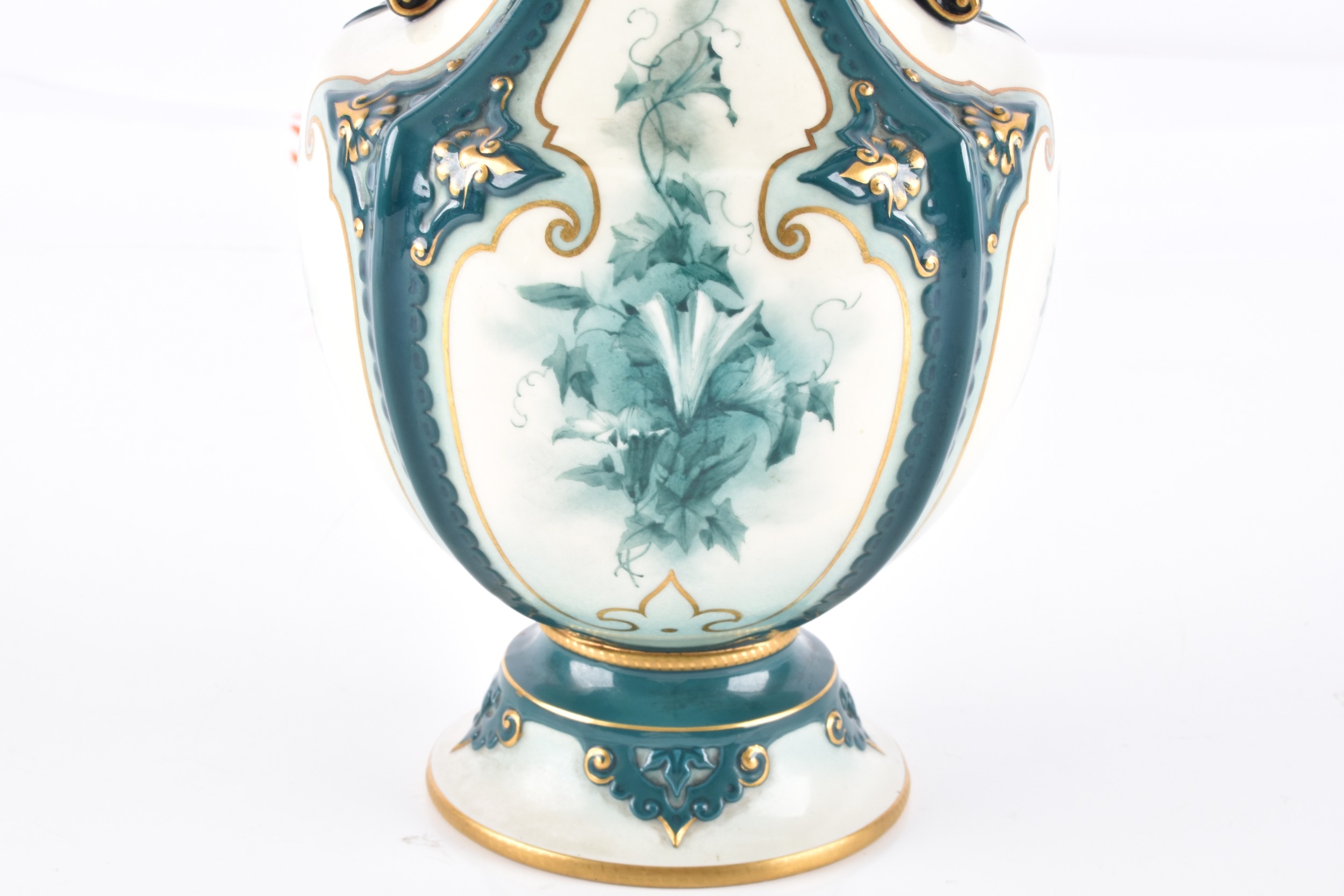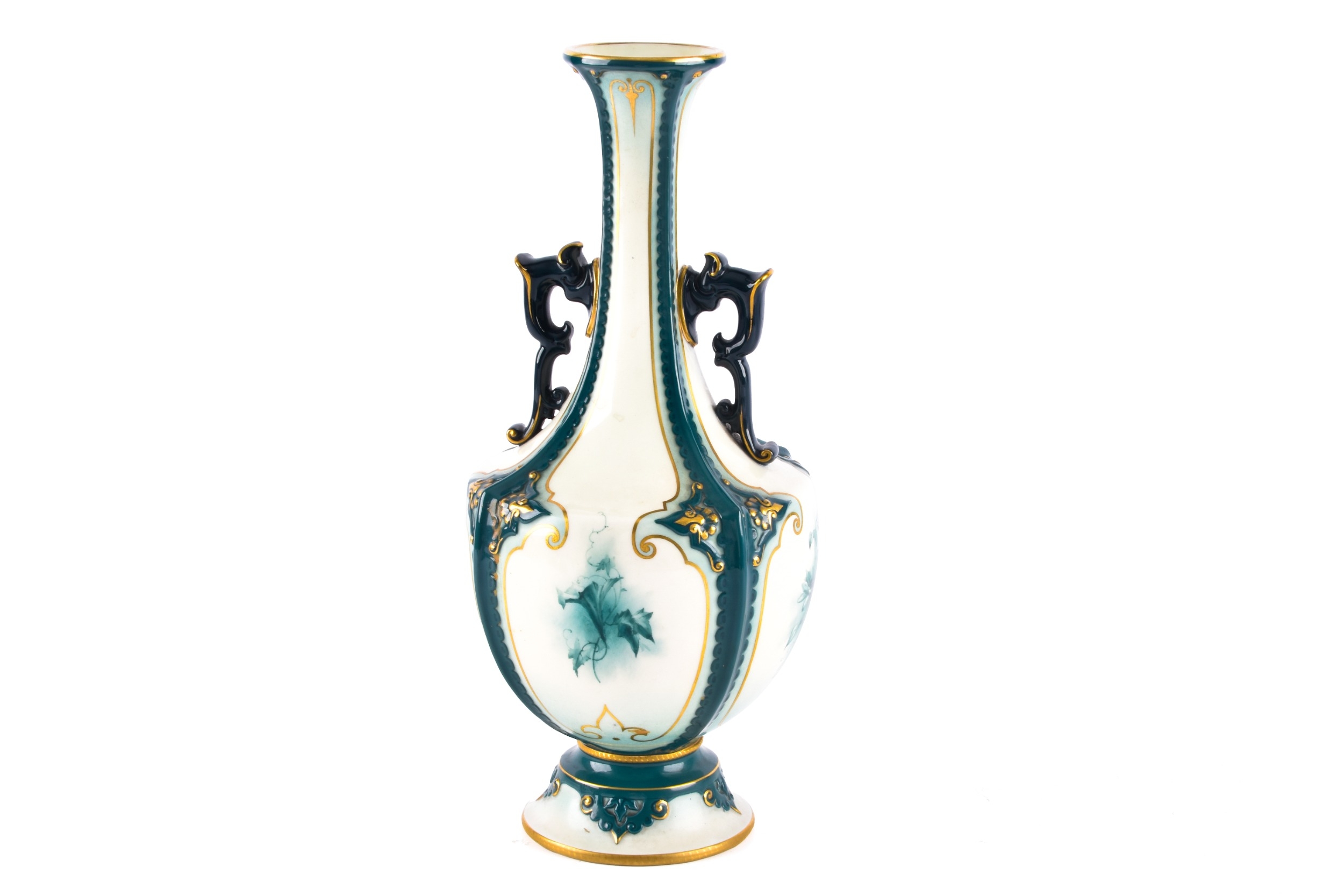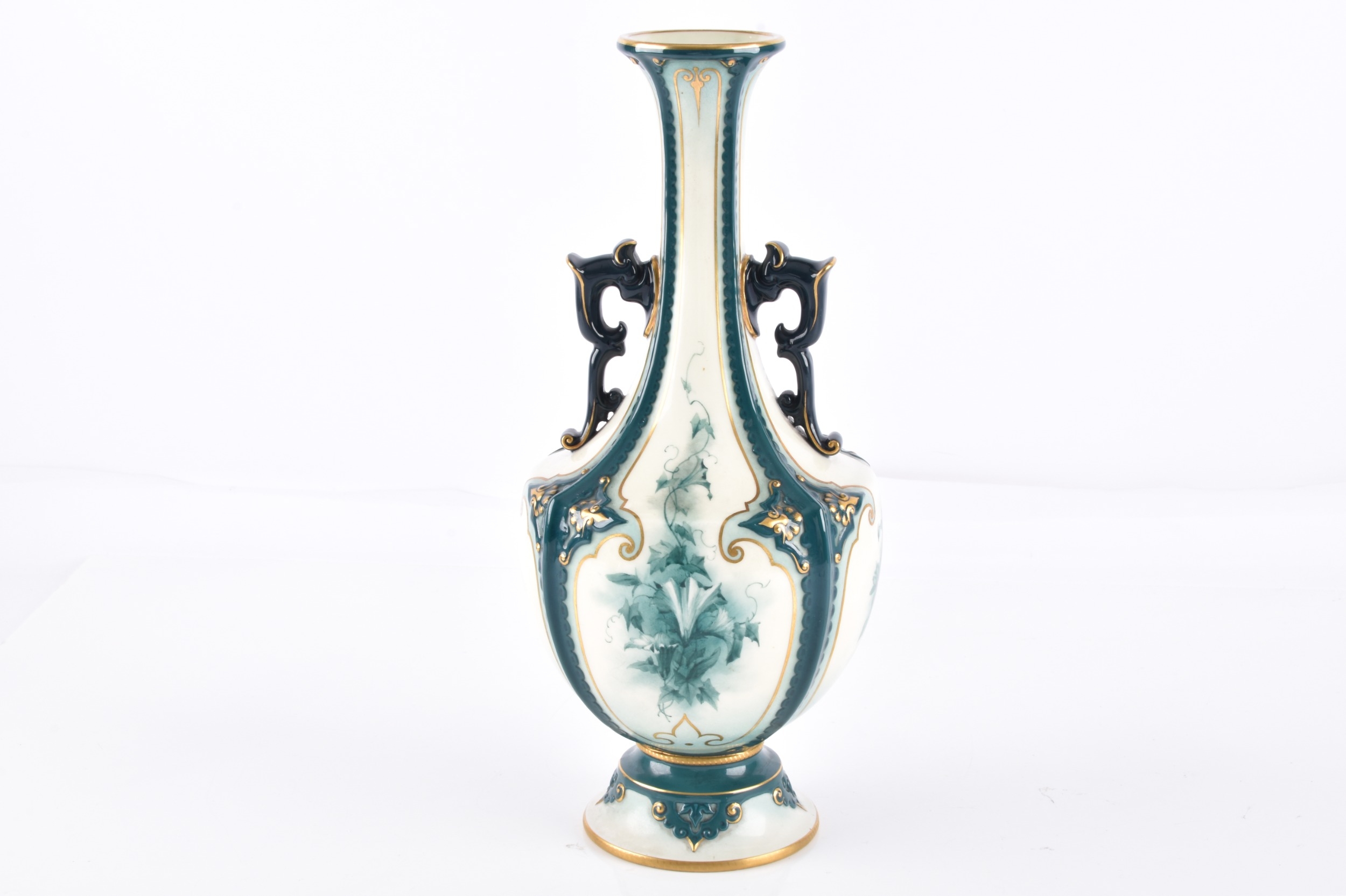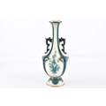 A Hadley's Worcester Faience vase, the U-shaped body with extended waisted neck decorated with cream ground panels of green flowers within dark green glazed moulded borders enriched with gilt detail, the neck flanked by dark blue glazed scroll handles, factory mark to base, 27 cm high.