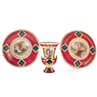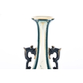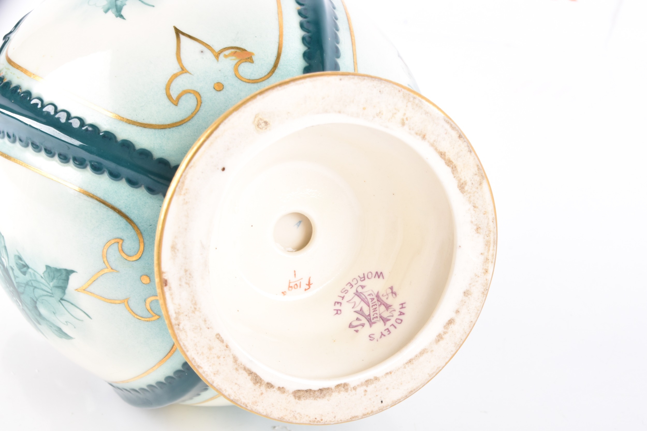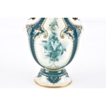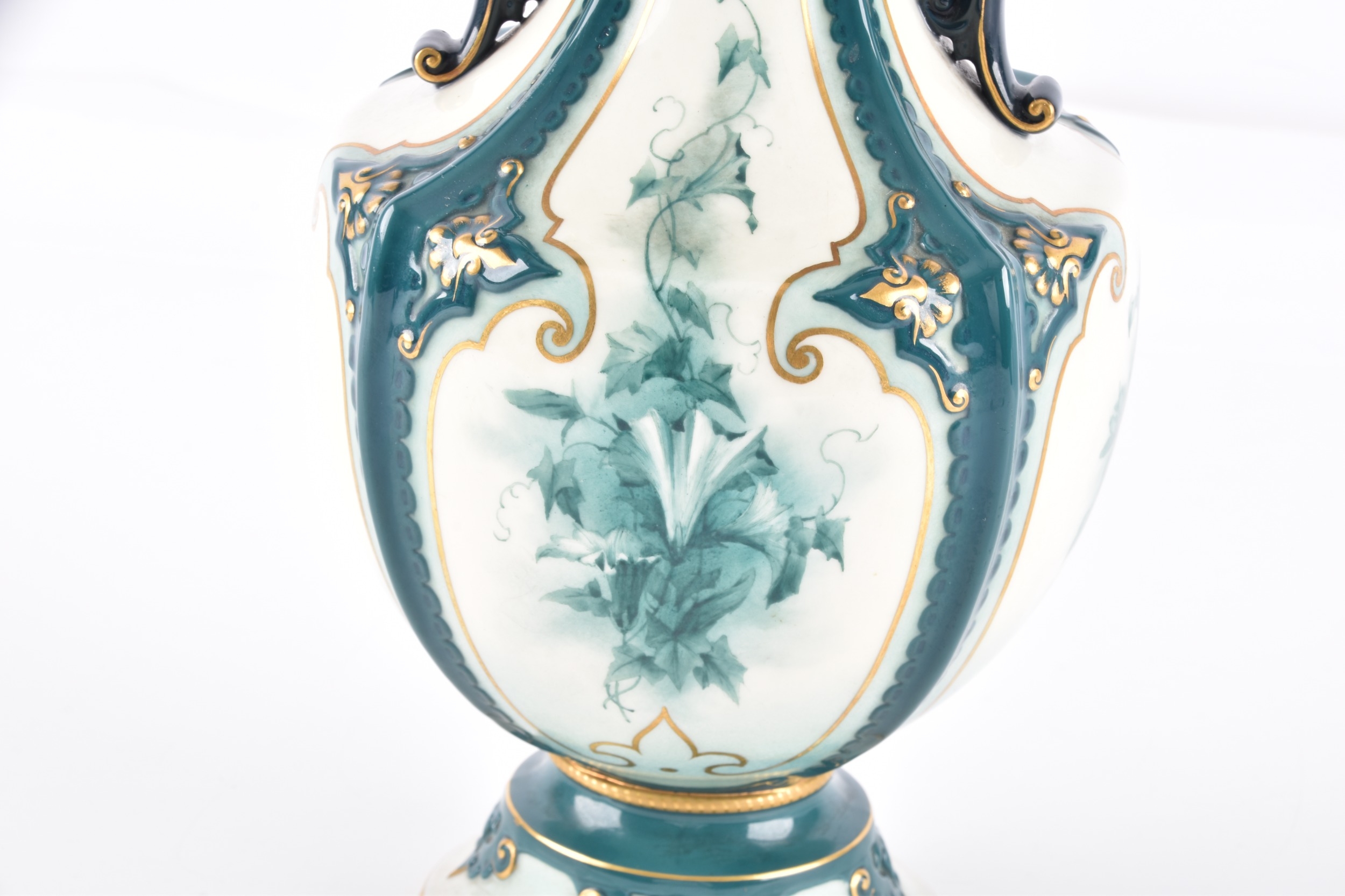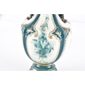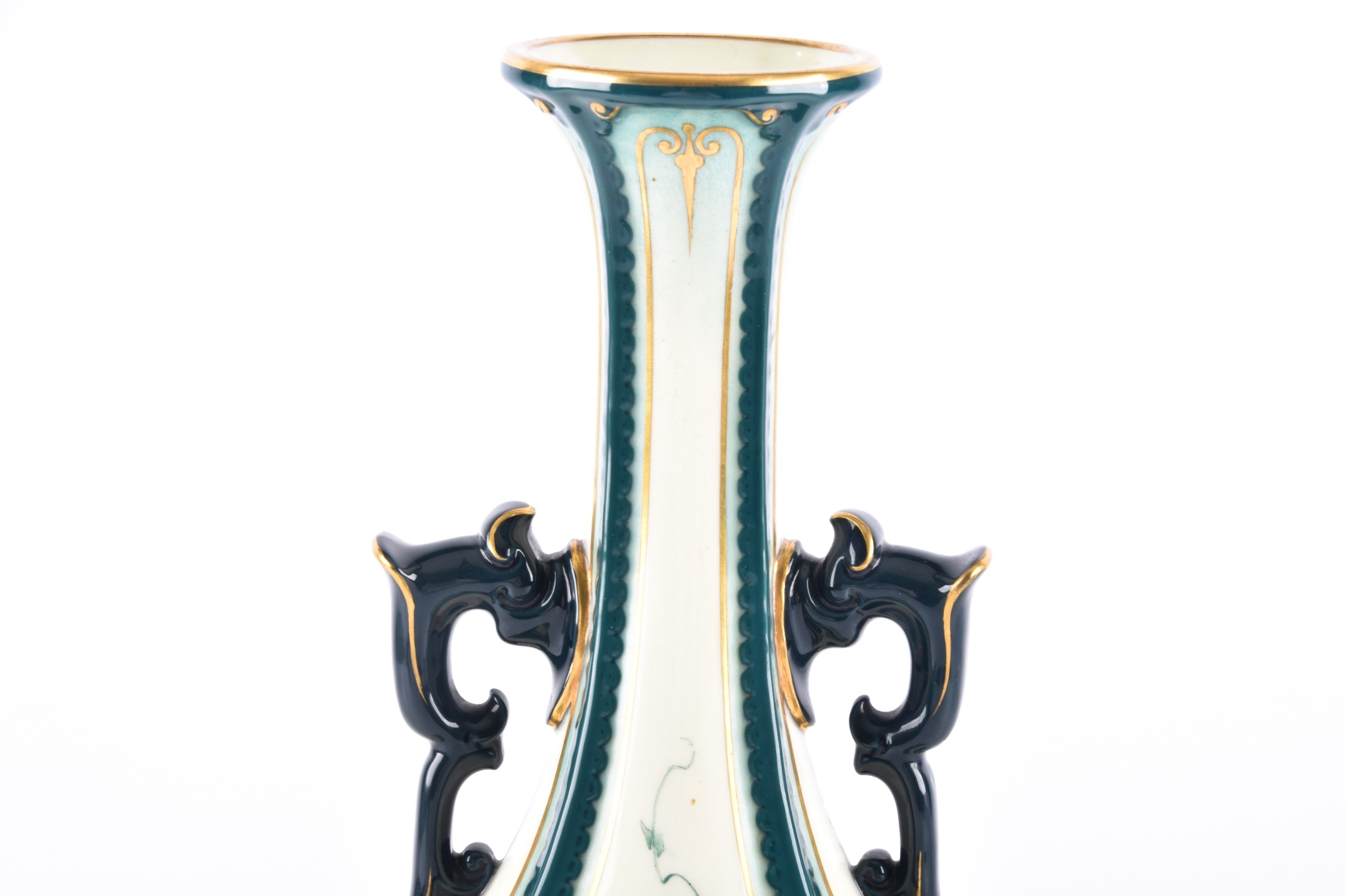 A Hadley's Worcester Faience vase, the U-shaped body with extended waisted neck decorated with cream ground panels of green flowers within dark green glazed moulded borders enriched with gilt detail, the neck flanked by dark blue glazed scroll handles, factory mark to base, 27 cm high.
