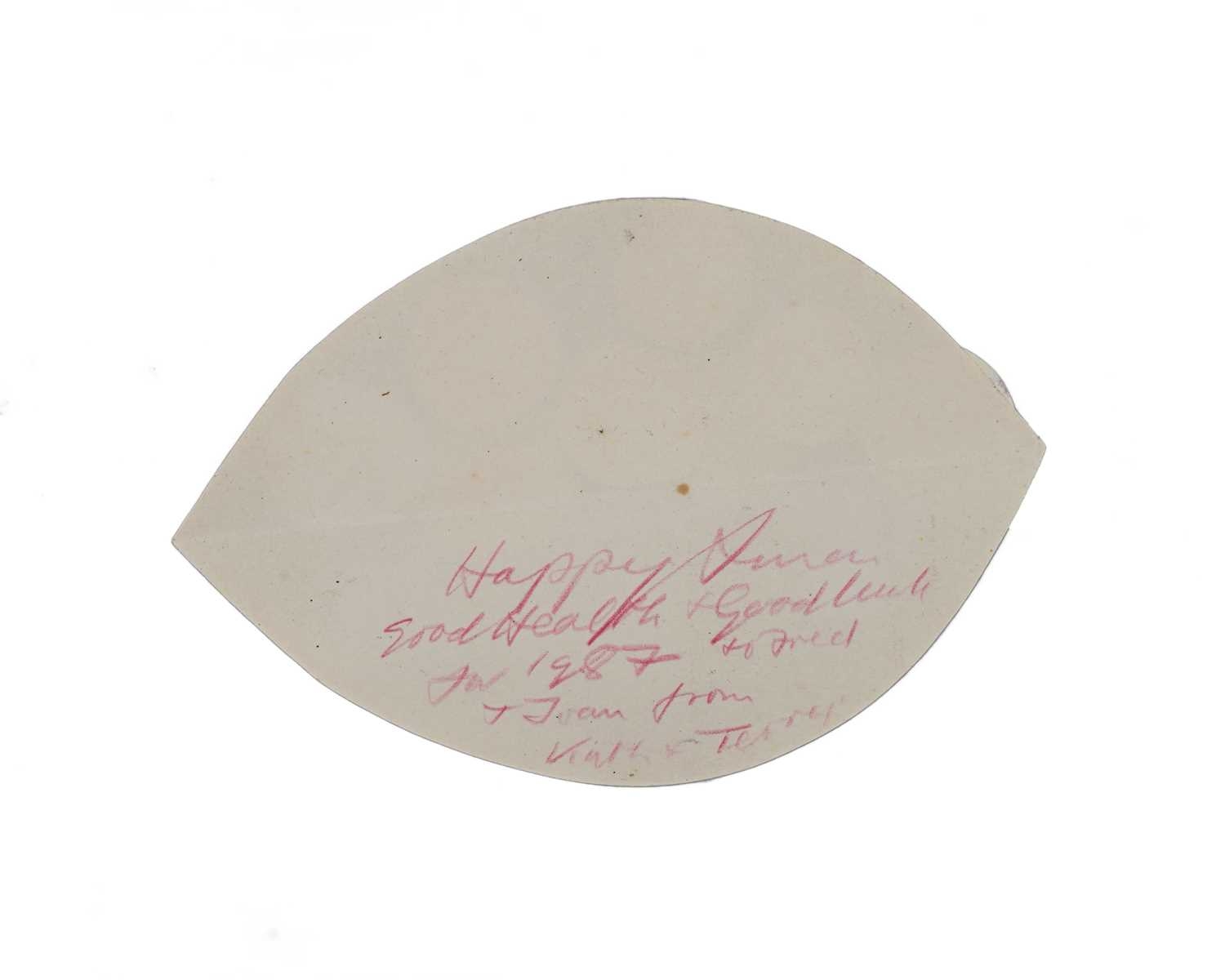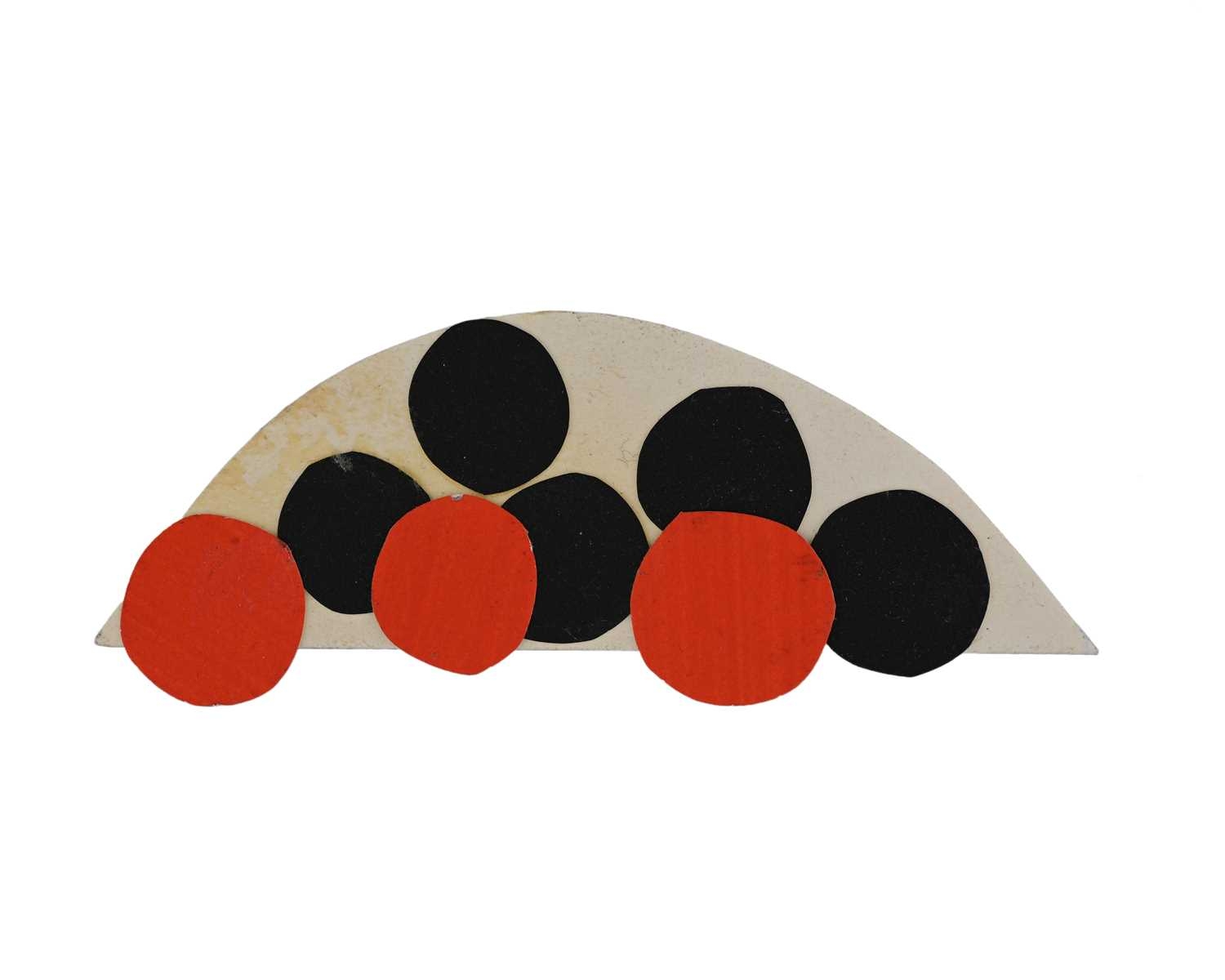 Sir Terry Frost R.A. (British, 1915-2003), Untitled Christmas card, red and black circles mounted on a segment, inscribed 'Happy Xmas, Good Health & Good Luck for 1987, to Fred & Joan from Kath & Terry', collage, 13 by 4.5cm. Note: the card recipient is British Labour Party politician, barrister-at-law, and economist Lord Fred Mulley (1918-1995) and his wife Joan. Mulley along with Terry Frost hail from the Warwickshire town of Leamington Spa. Note: Artist Resale Rights apply