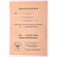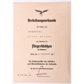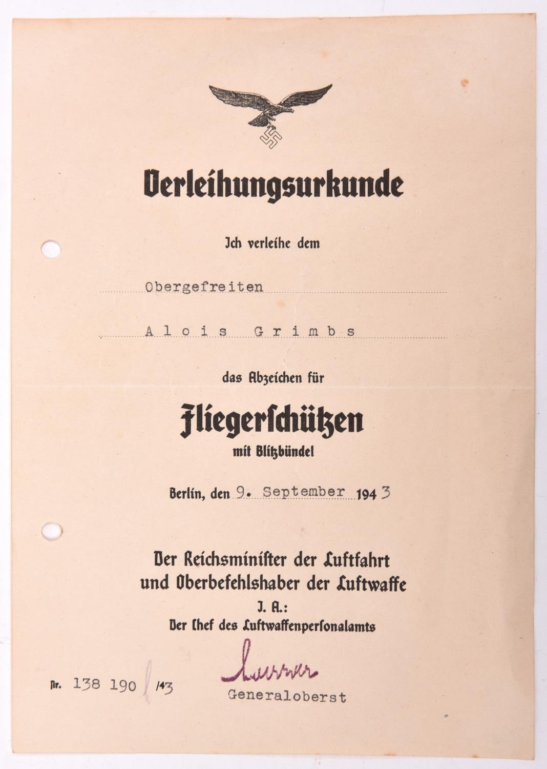 A Third Reich Award Certificate for a Luftwaffe Air Gunner/Wireless Operator’s badge, to Obergefreiter Alois Grimbs, dated September 1943. GC (single fold crease across the middle). Purchased by the vendor from Klaus Butschek of Regensburg. £60-80