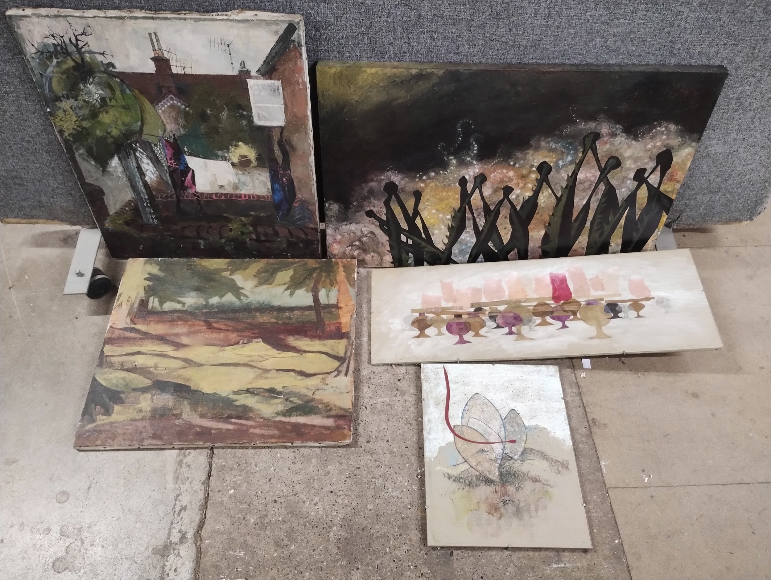 British Modernist School, five abstracts, oils, unframed