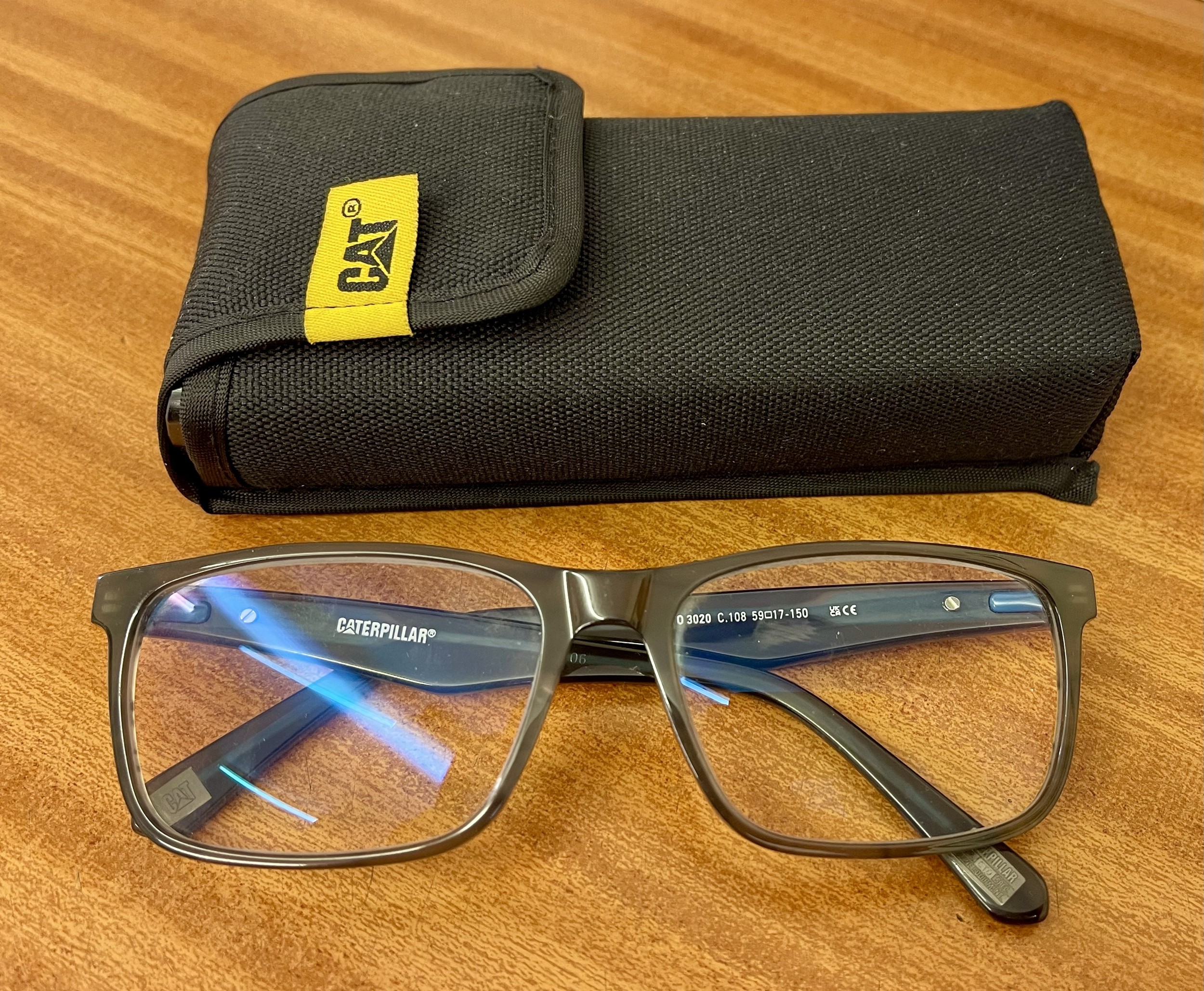 A PAIR OF CATERPILLAR -CAT CT03020 SPECTACLE FRAMES (WITH PRESCRIPTION LENSES ALREADY INSERTED) AND A CAT GLASSES CASE