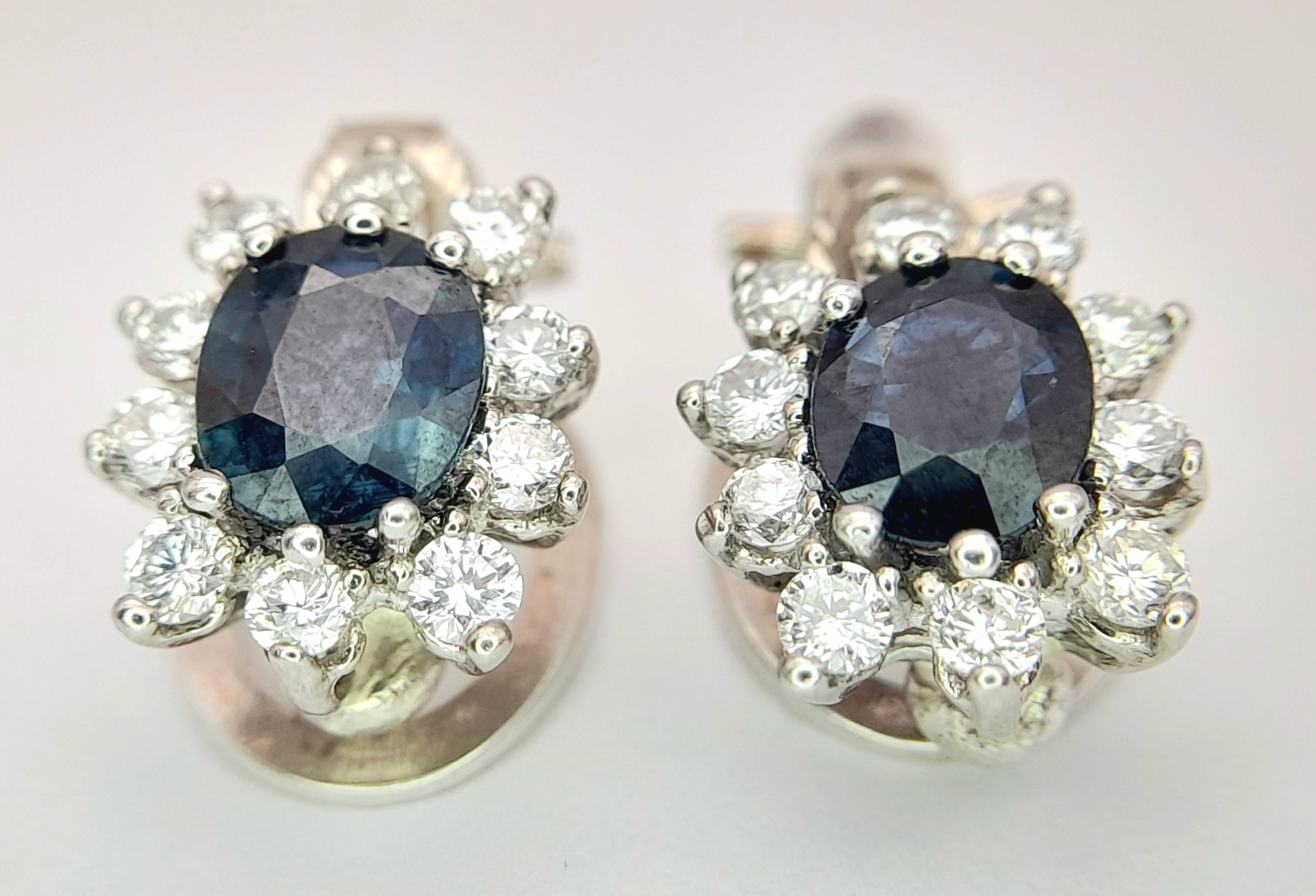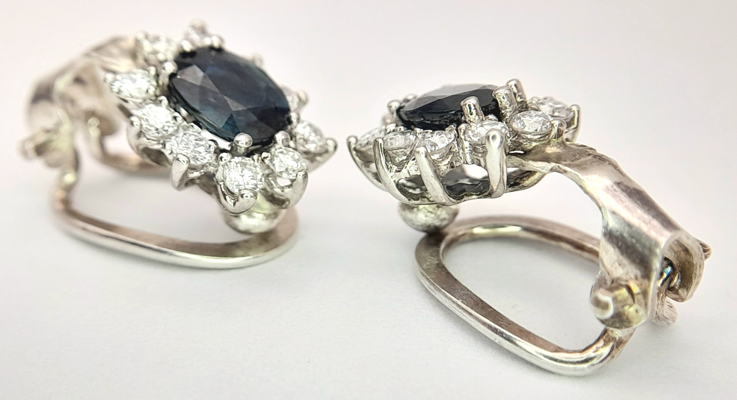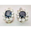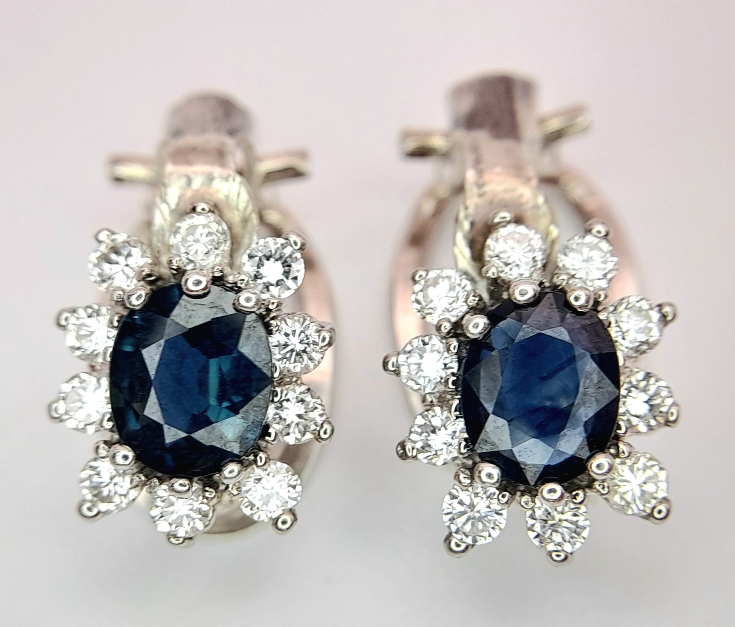 A Pair of 14K Gold, Diamond and Sapphire Earrings. 2 x 1ct oval cut sapphires 2 x 10 round brilliant cut diamond surrounds - 0.80ctw. Note: Back clasp attachments are made of silver. 3.55g total weight. NL-43505.