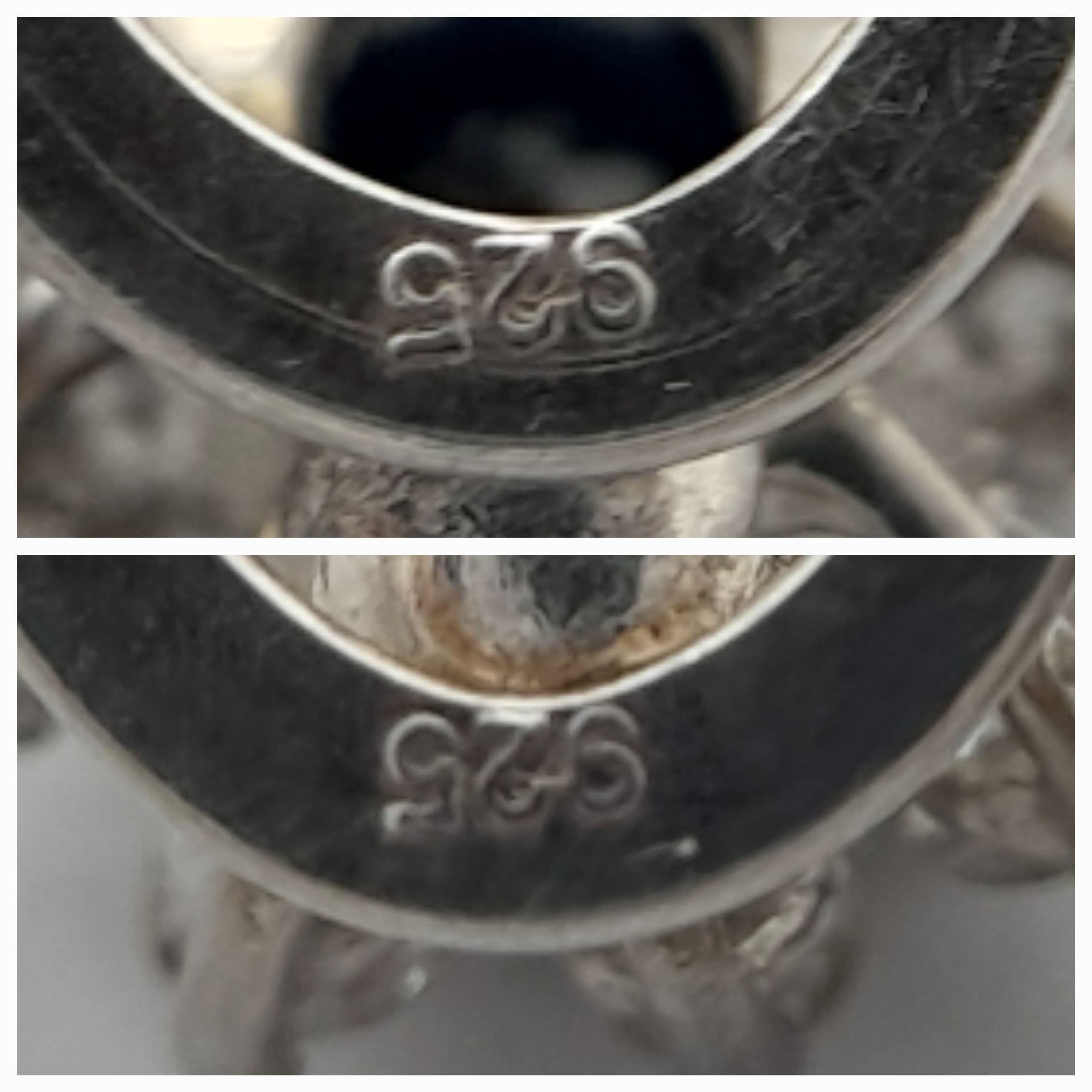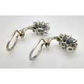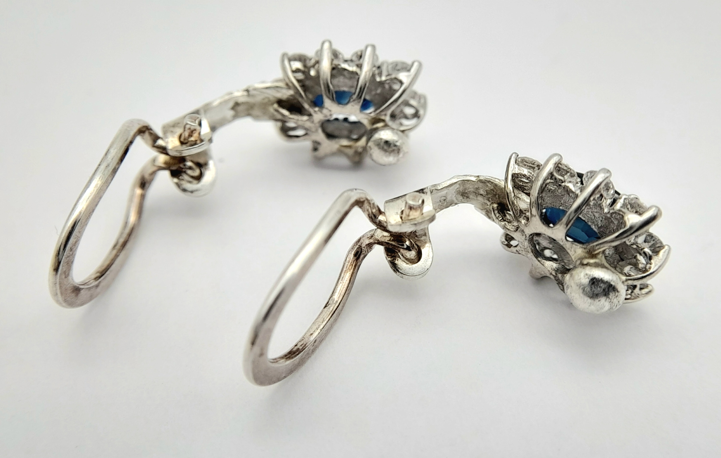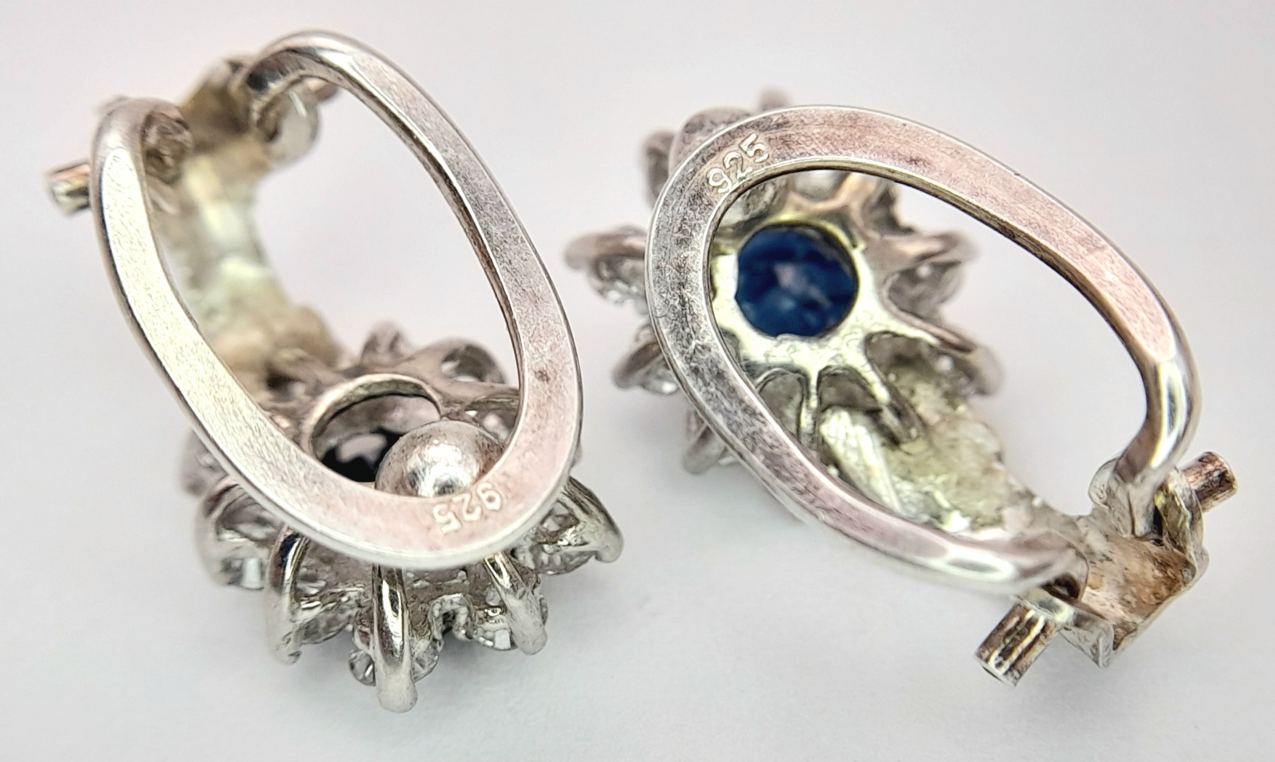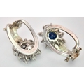 A Pair of 14K Gold, Diamond and Sapphire Earrings. 2 x 1ct oval cut sapphires 2 x 10 round brilliant cut diamond surrounds - 0.80ctw. Note: Back clasp attachments are made of silver. 3.55g total weight. NL-43505.