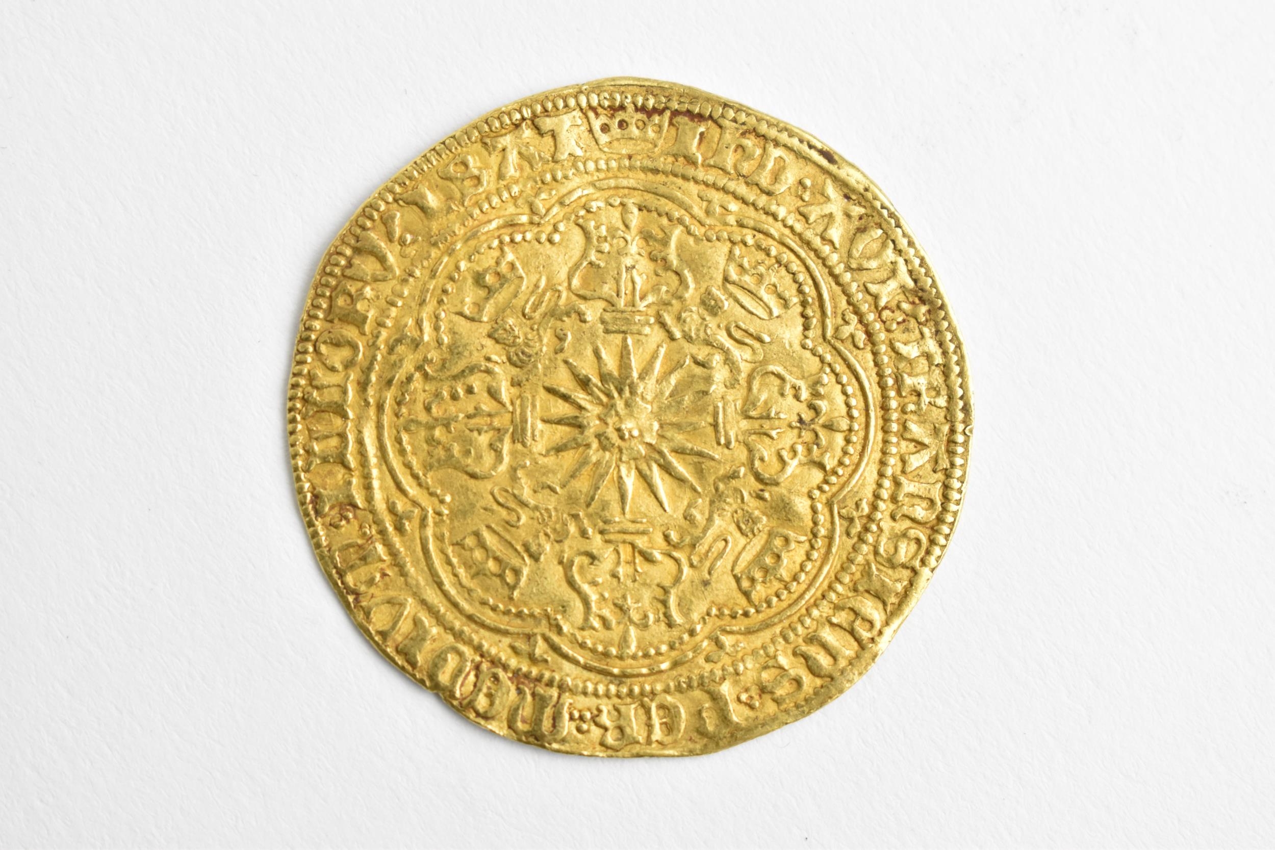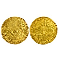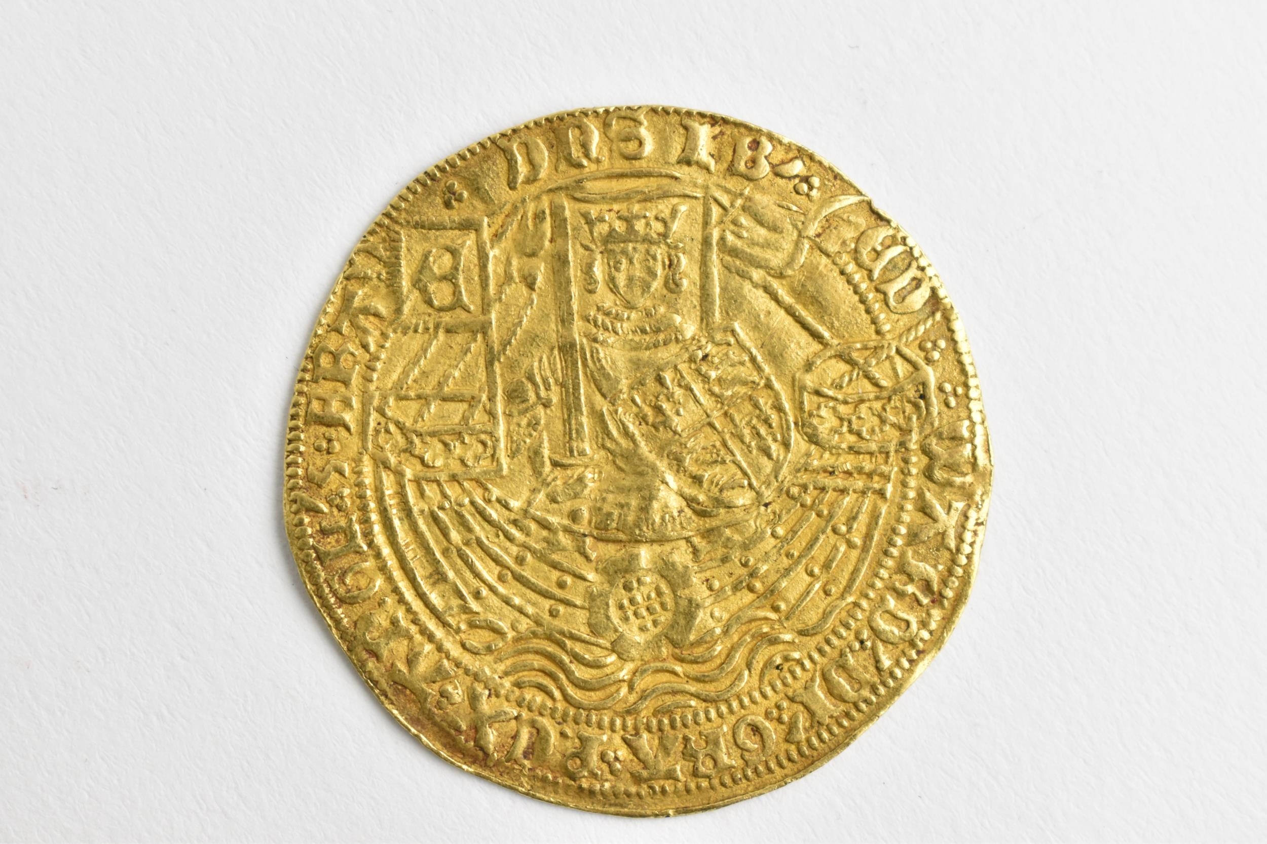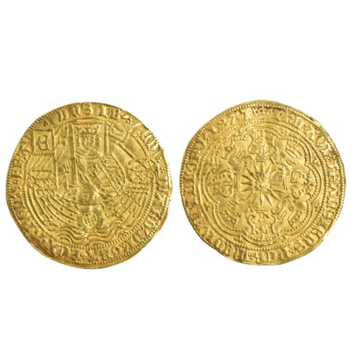 Kingdom of England - Edward IV (1461-1470/1471-1483), First Reign, light coinage (1464-1470) gold Ryal mm. crown, King Edward IV, facing, holding sword and shield on ship, 'E' on banner and rose to hull, 'ED..WARD.DI.GRA.REX.ANGL'.Z.FRAn.DNS.IB' ./. a rose over a sun with fleur-de-lis crowns and leopards, 'IHD AVT' RANSIENS.PER.MEDIVM.ILLOR.VM:I.BAT