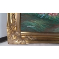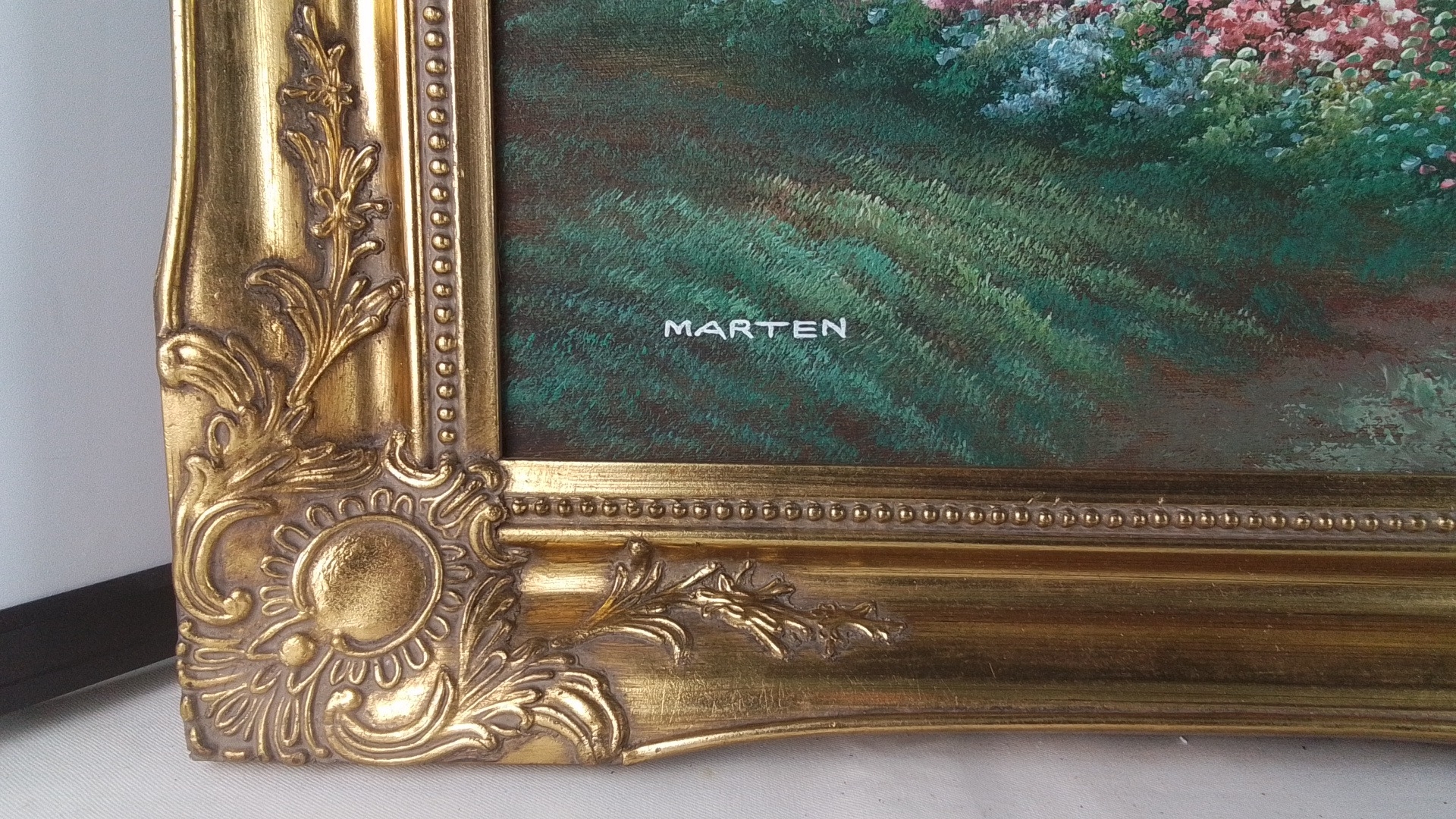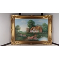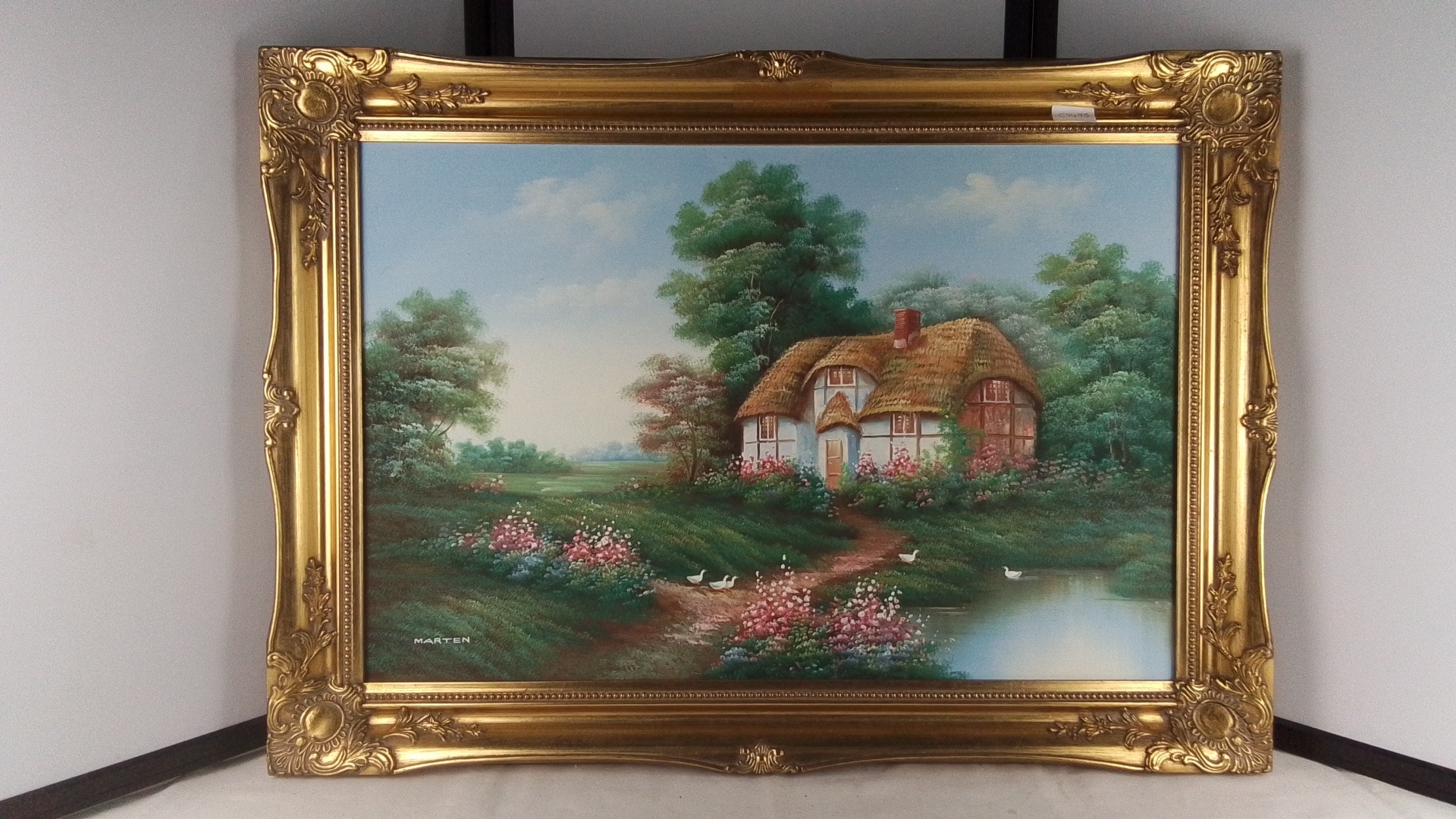 A framed canvas landscape depicting a thatched cottage beside a pond with ducks, signed lower left 'Marten', in an ornate gilt foliate swept frame, 90cm x 65cm.