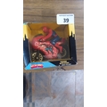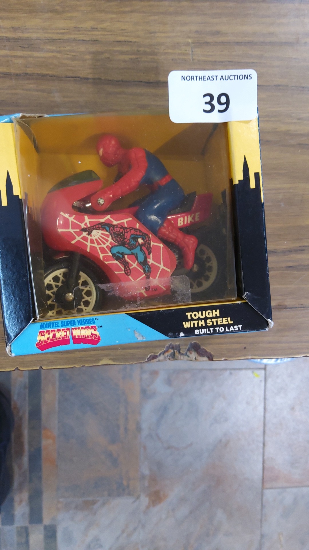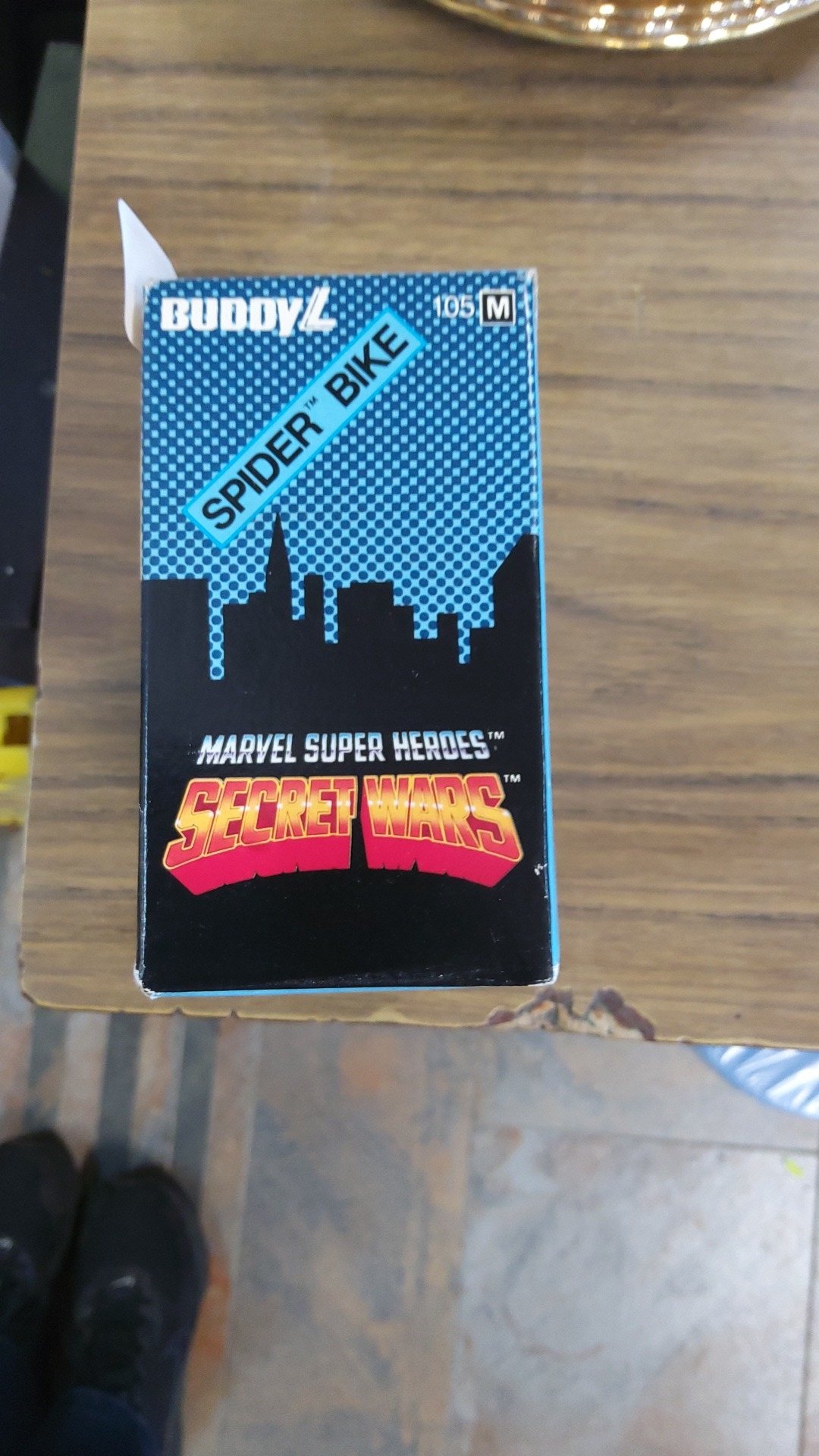 A boxed Buddy L “Spider Bike” tinplate motorcycle toy, “Marvel Super Heroes Secret Wars”, with Spider-Man rider and lithographed red fairing, in original window display packaging.