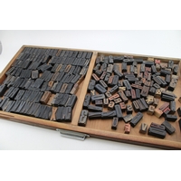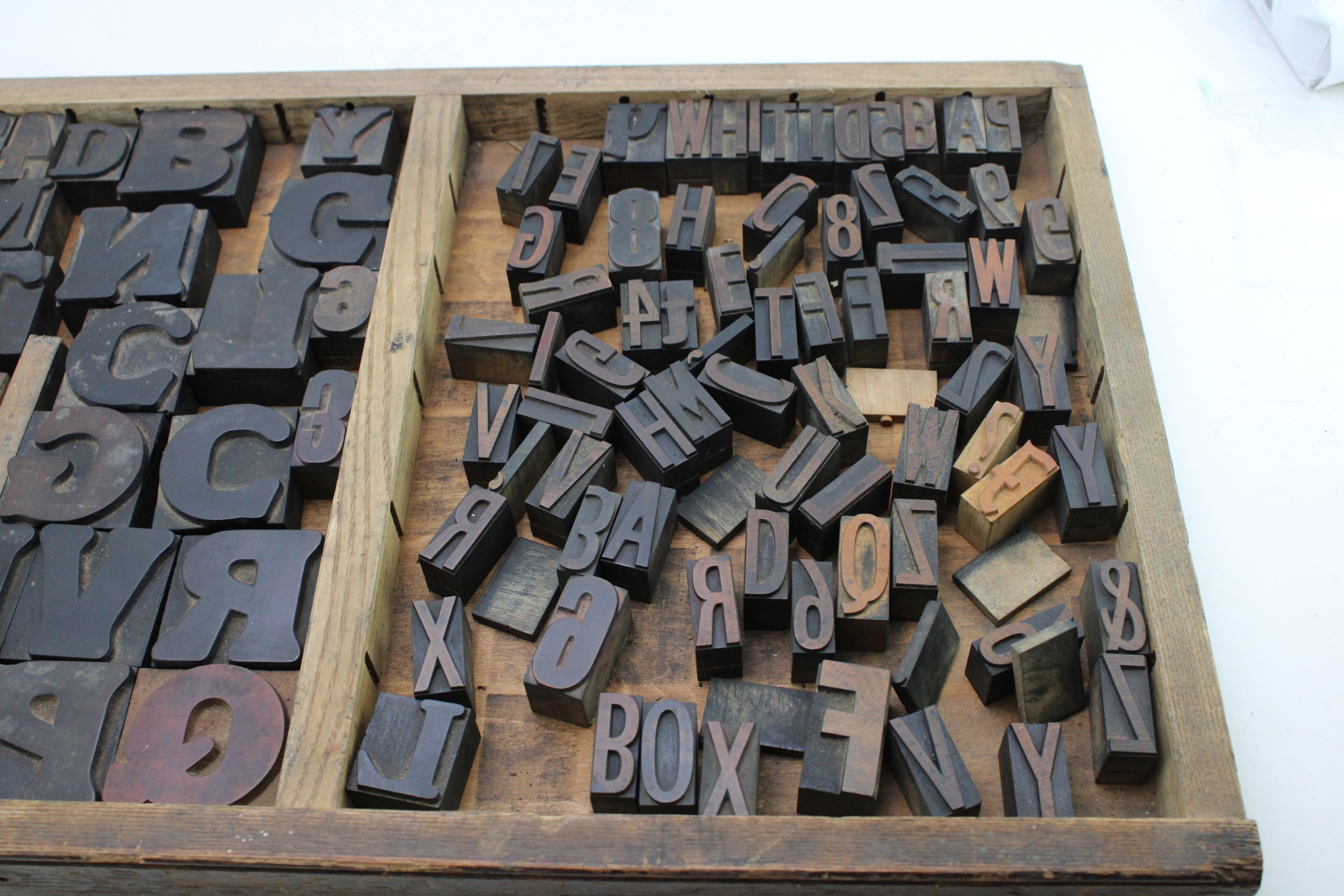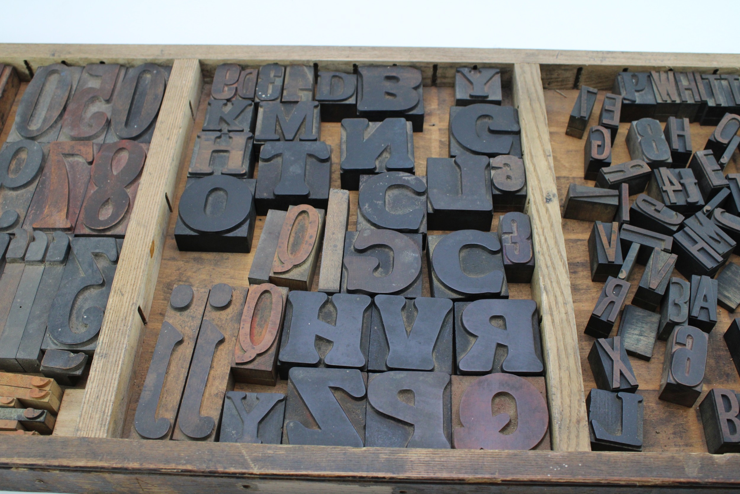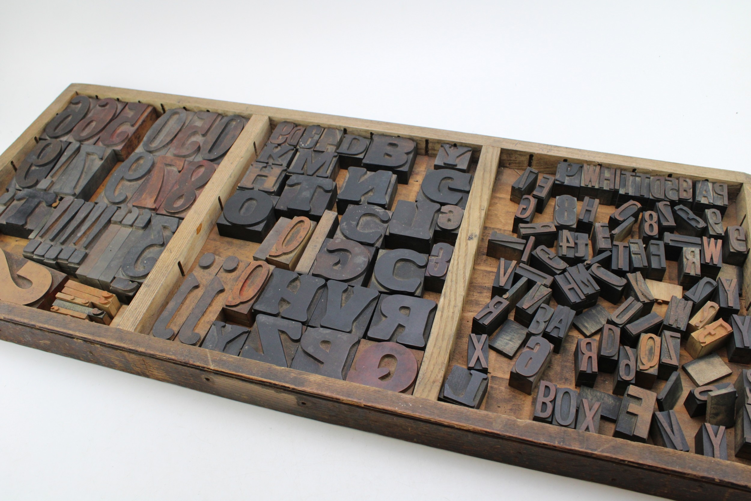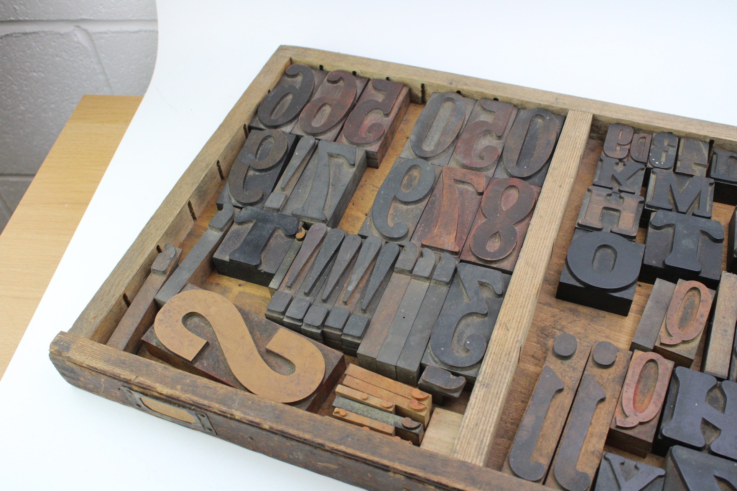 Vintage printers drawer complete with a number of printing blocks, 83cm x 36cm, (Qty).
