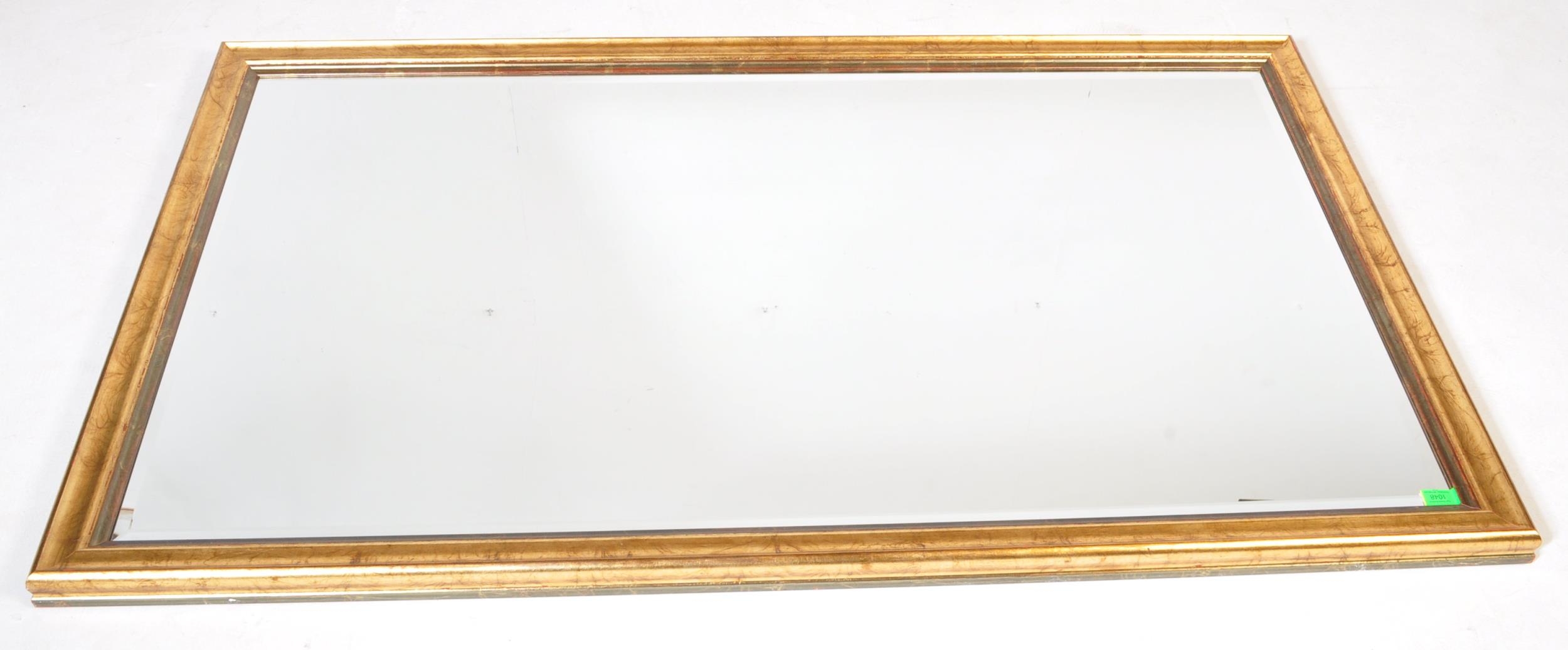 A large early 20th Century gilt over mantel mirror. Of rectangular form with gilt wood with bevelled edge. Measures approx.