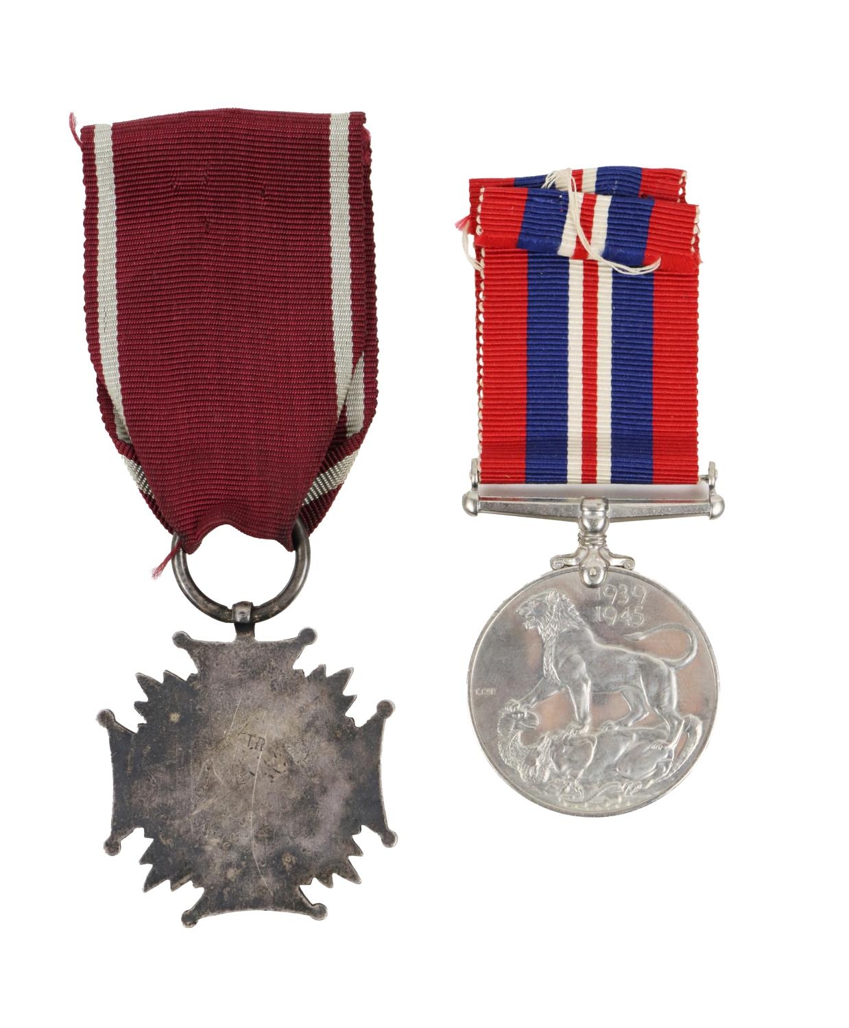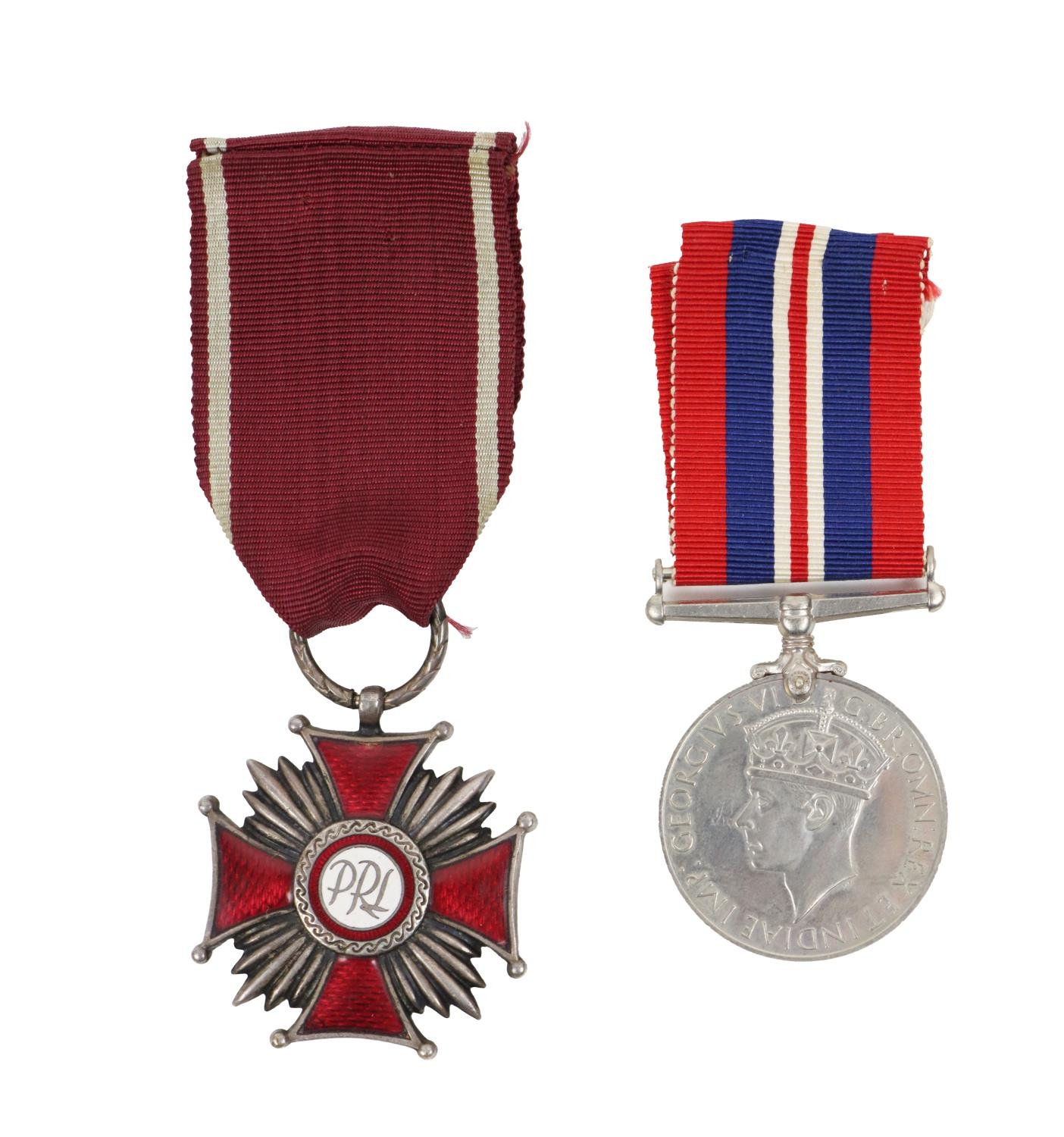 Militaria: Medals, [W.W.II] a 1939-45 Medal, with red, blue and white ribbon; also a 'Krzyz Zaslugi - PRL (Peoples Republic of Poland) Cross of Merit, with red enamel and ribbon. (2)