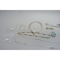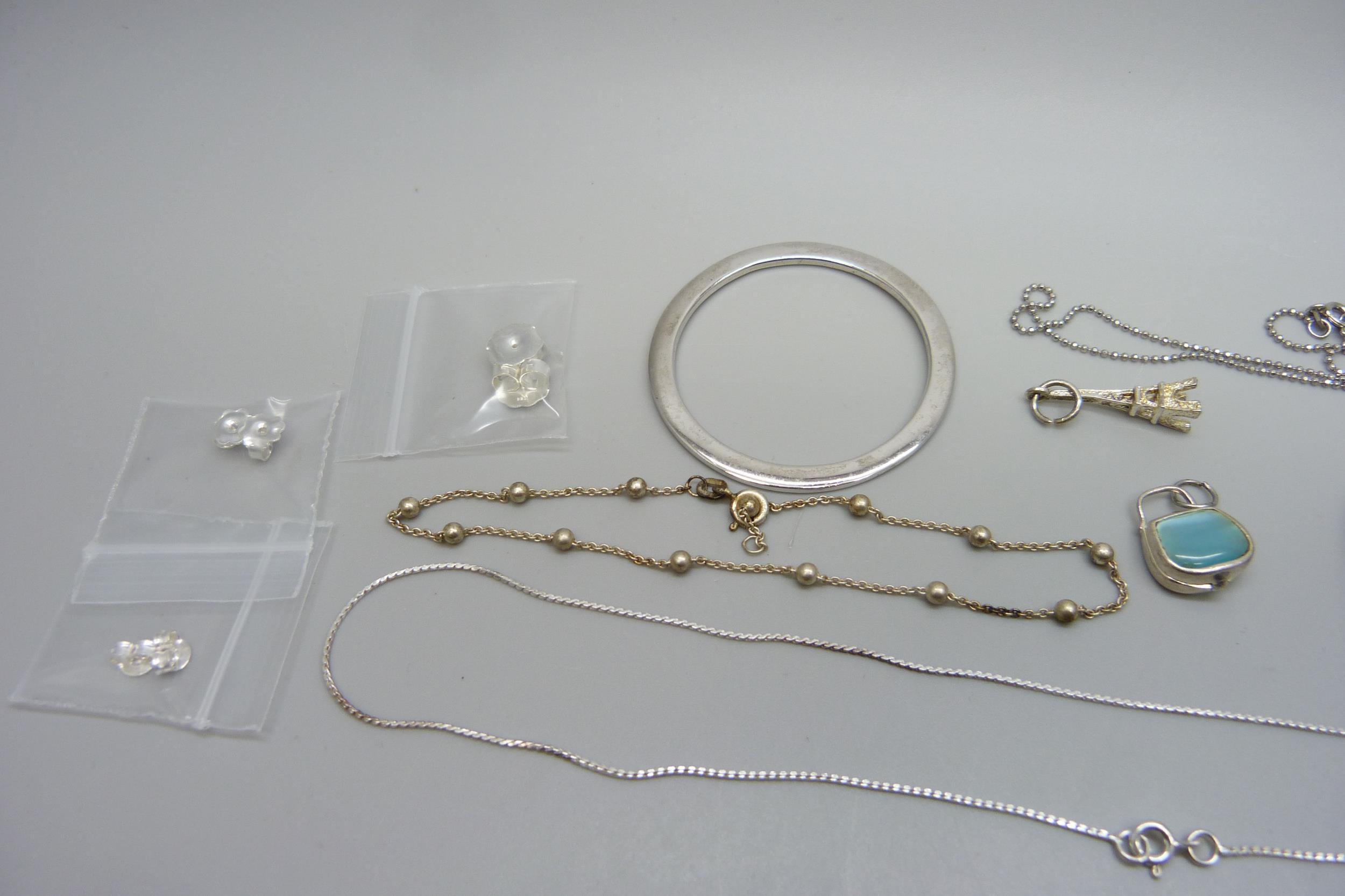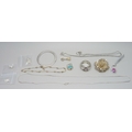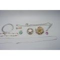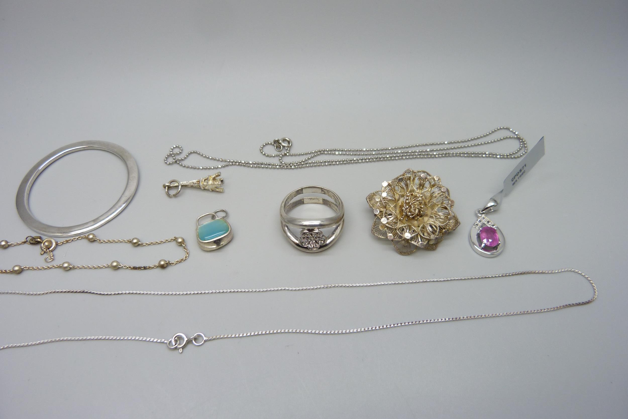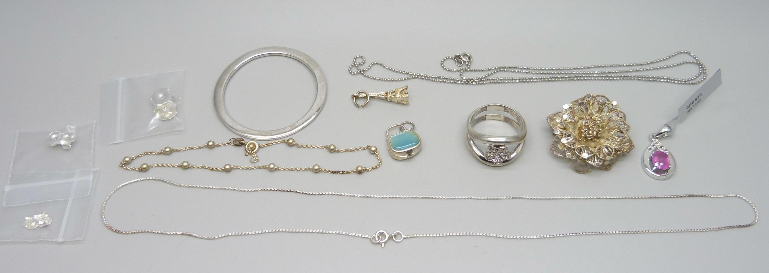 A collection of silver jewellery together with a white metal filigree brooch, a plated handbag charm and a white metal Eiffel Tower charm