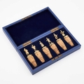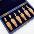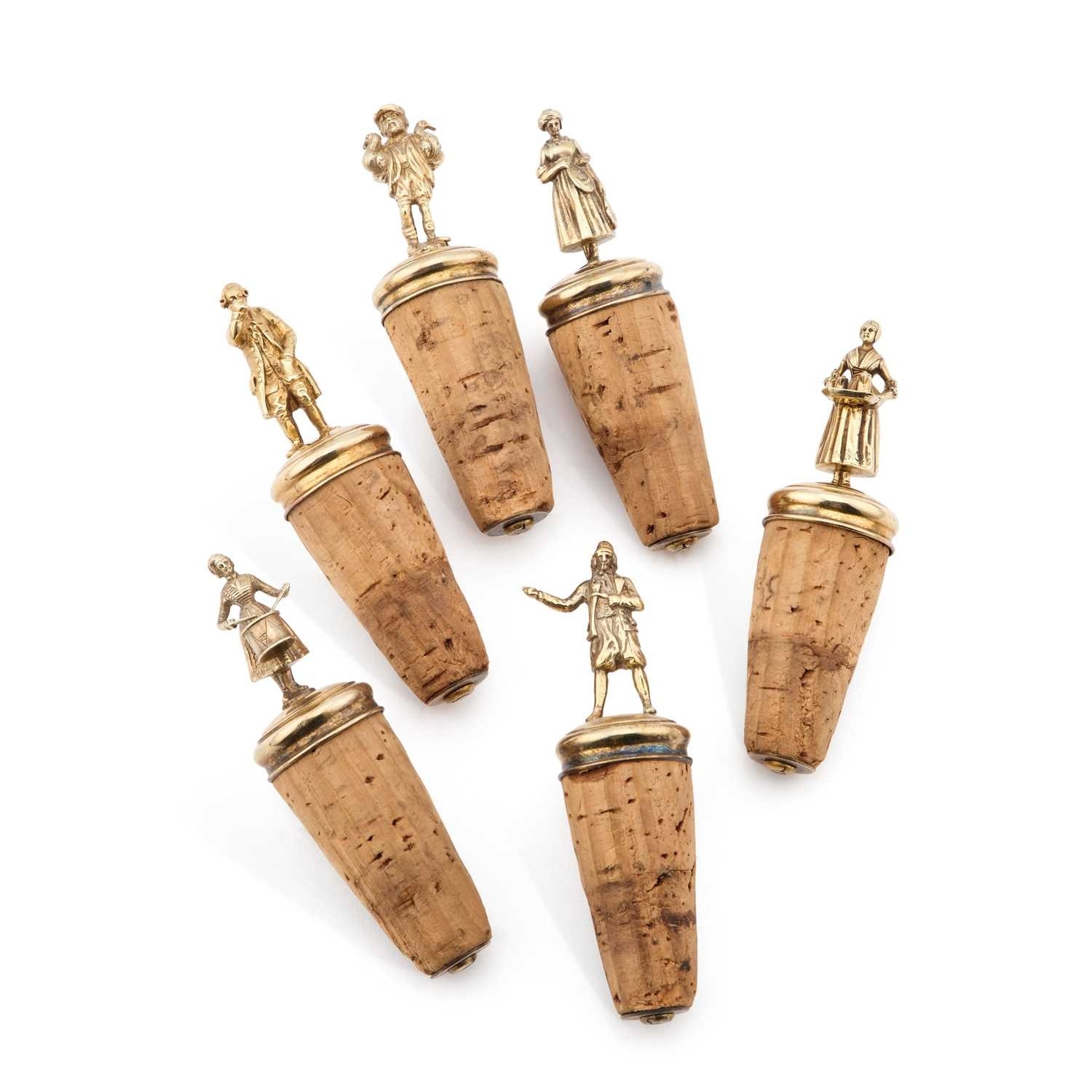 A CASED SET OF SIX VICTORIAN SILVER-GILT NOVELTY FIGURAL WINE BOTTLE STOPPERS