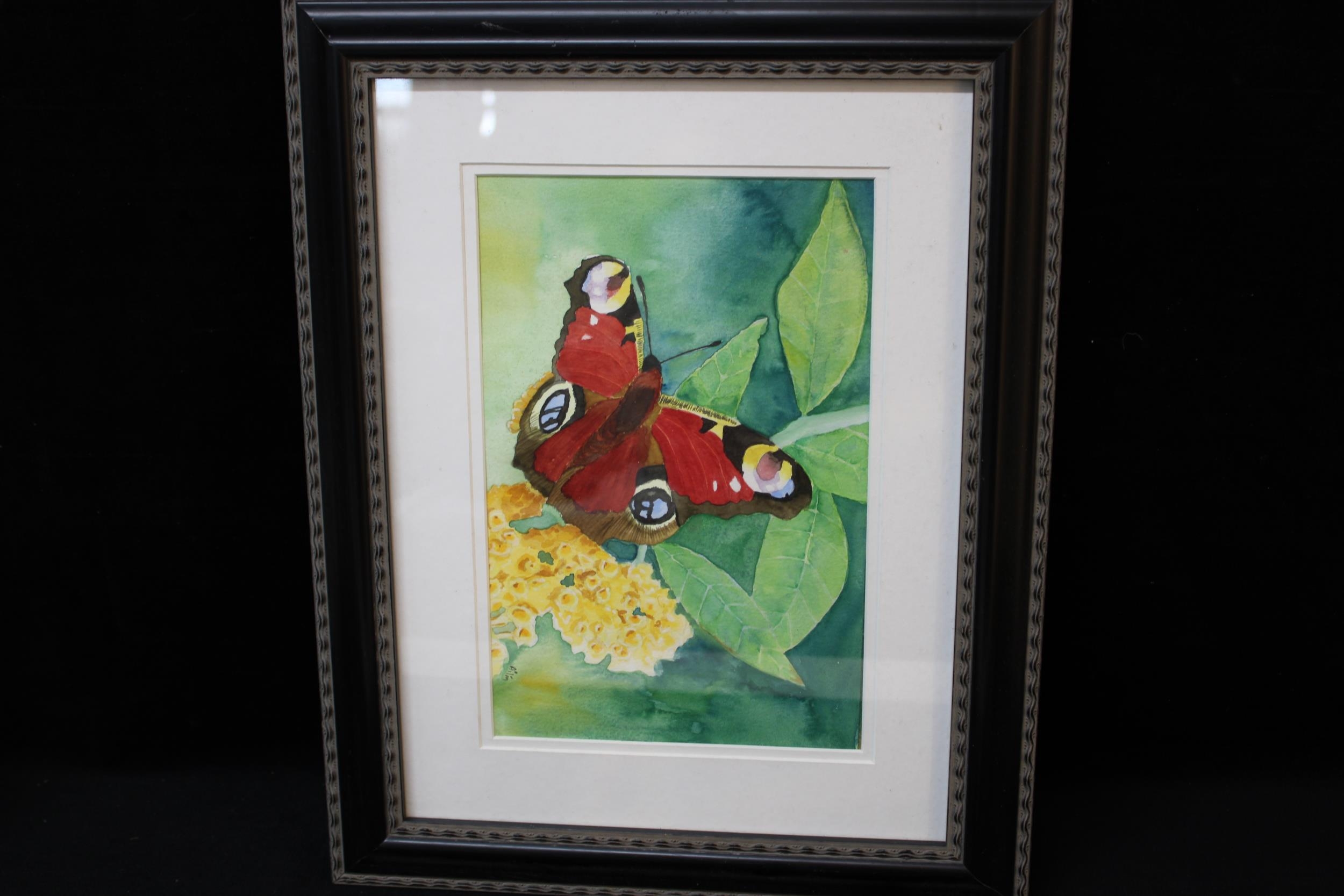 A framed picture of a peacock butterfly - 47cm x 37cm