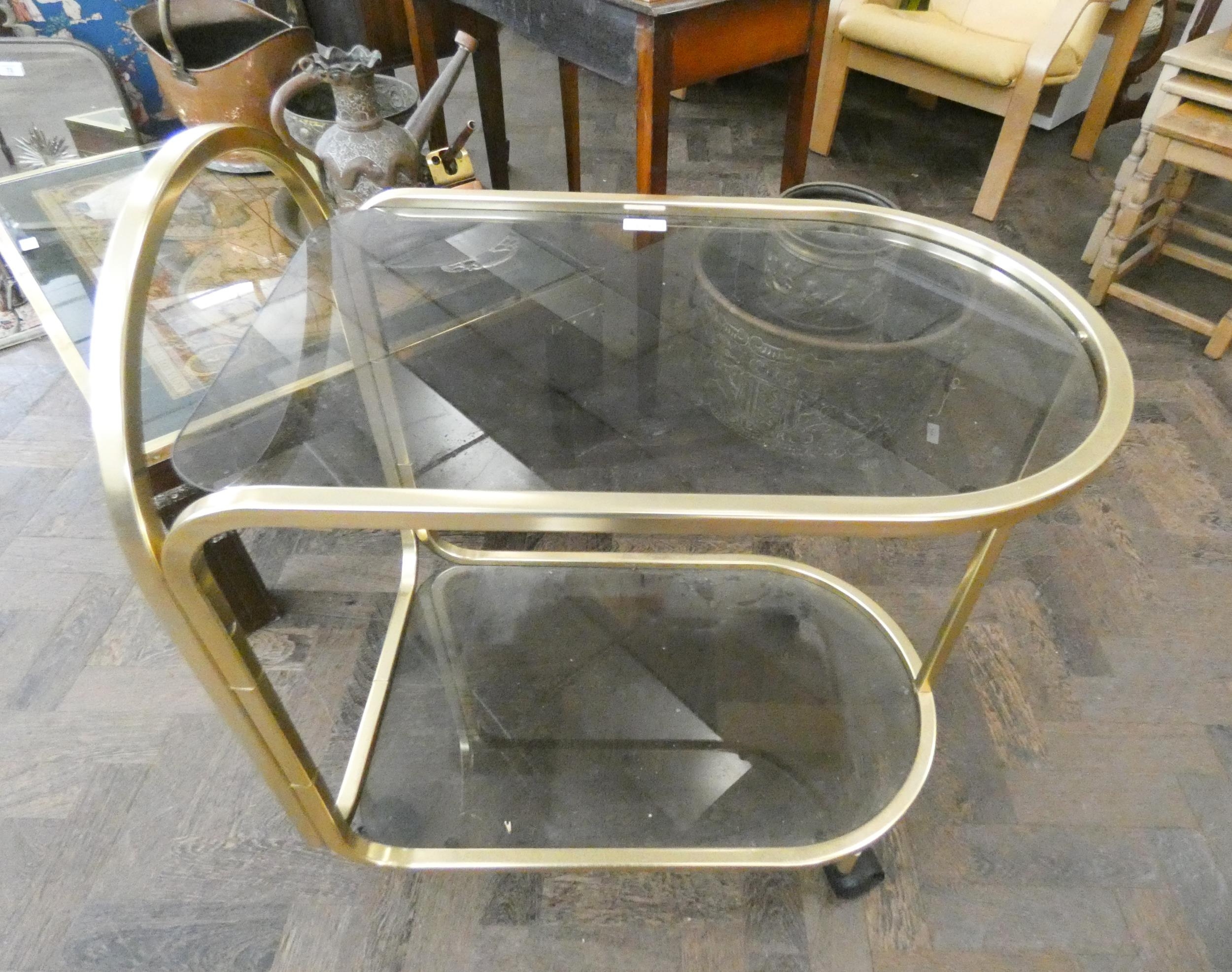 A gilt metal two tier drinks trolley