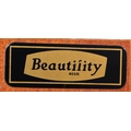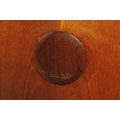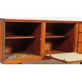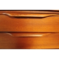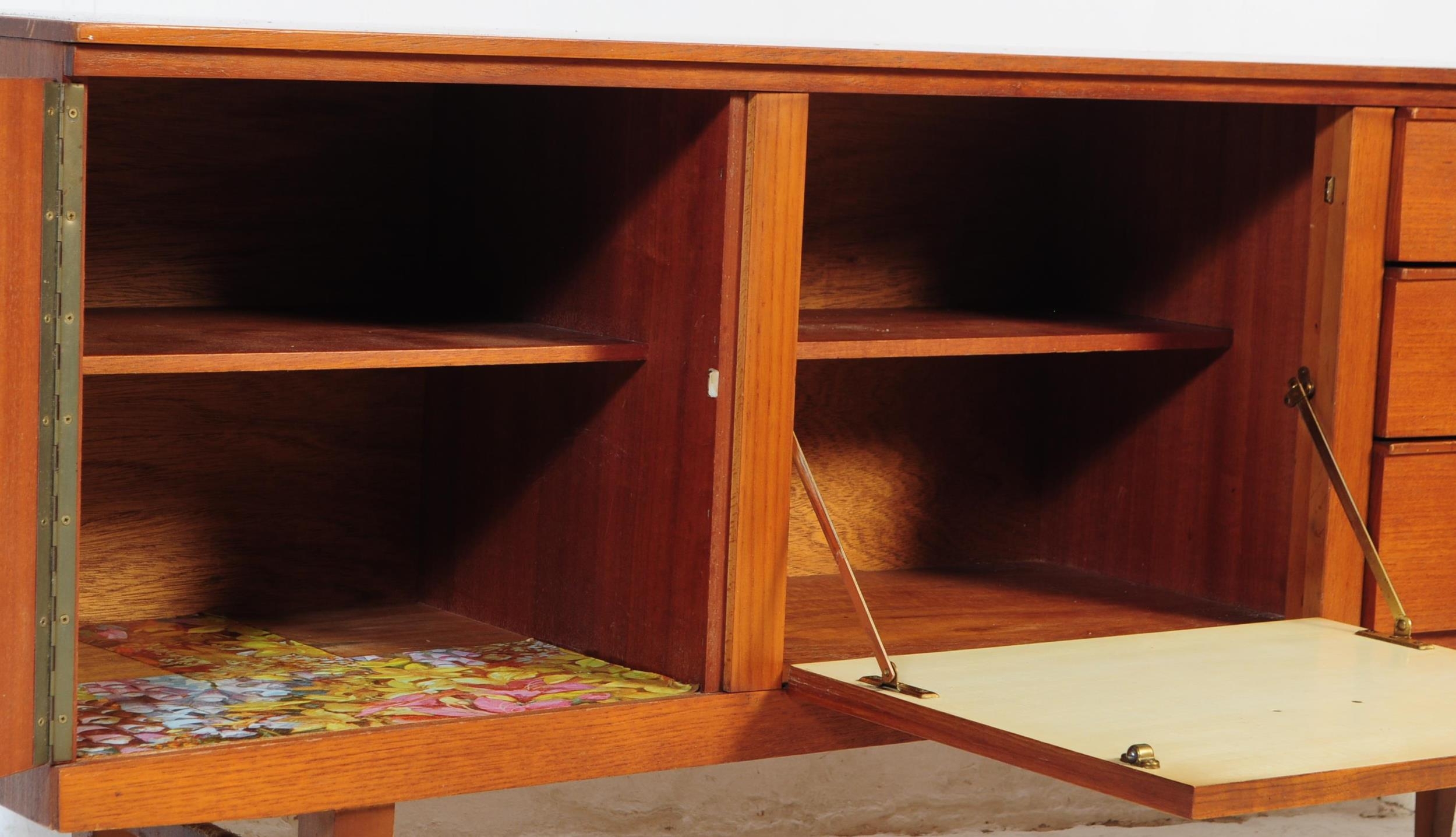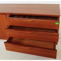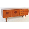 A retro mid 20th century teak sideboard credenza by Beautility. Of rectangular form with a bank of three drawers to right, flanked by twin doors either side - one hinged door and a drop down door, both with internal shelving. Raised on tapering legs united by stretcher with large circular shaped wooden pull handles. Measures approx. 78x184x46cm