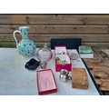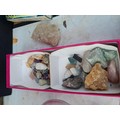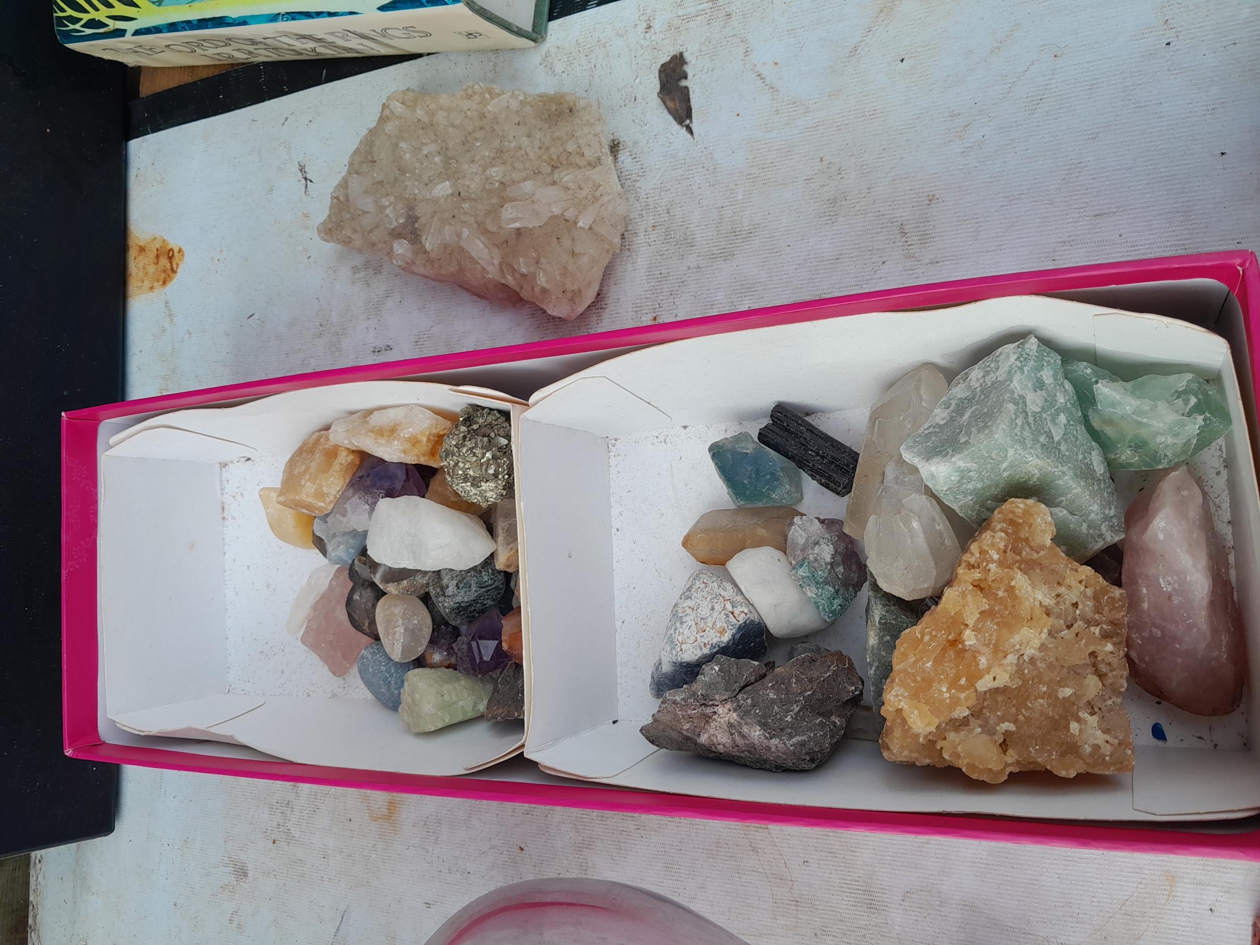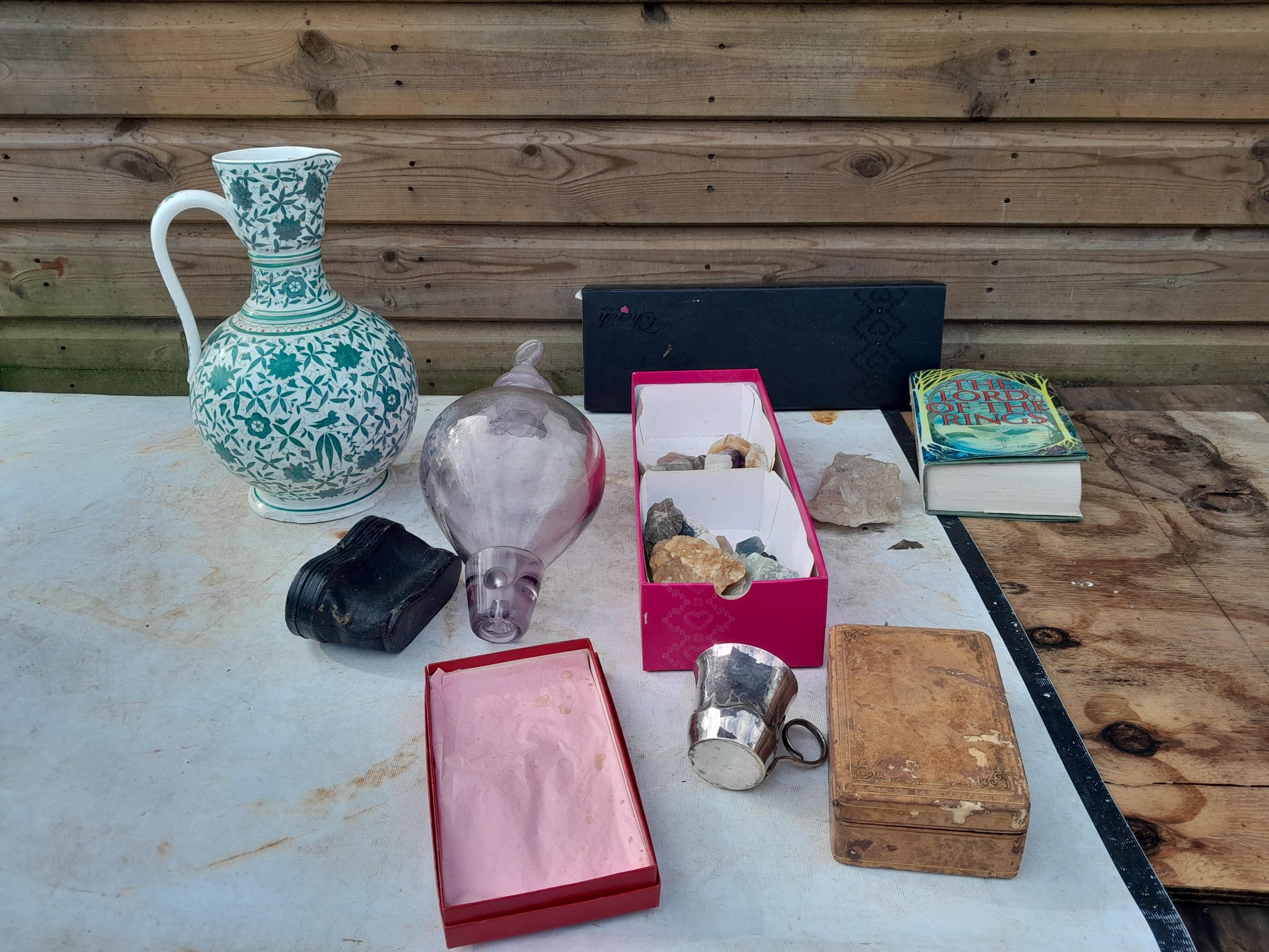 Box of oddments : collection of stones. and crystals, damaged Victorian jug and other items