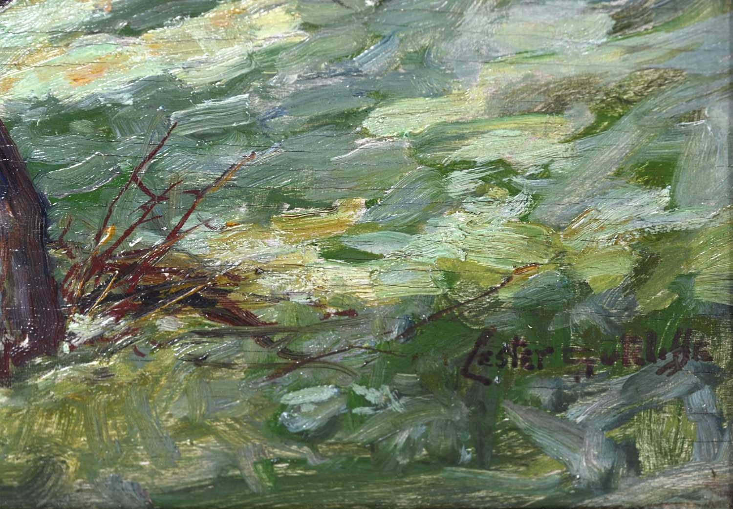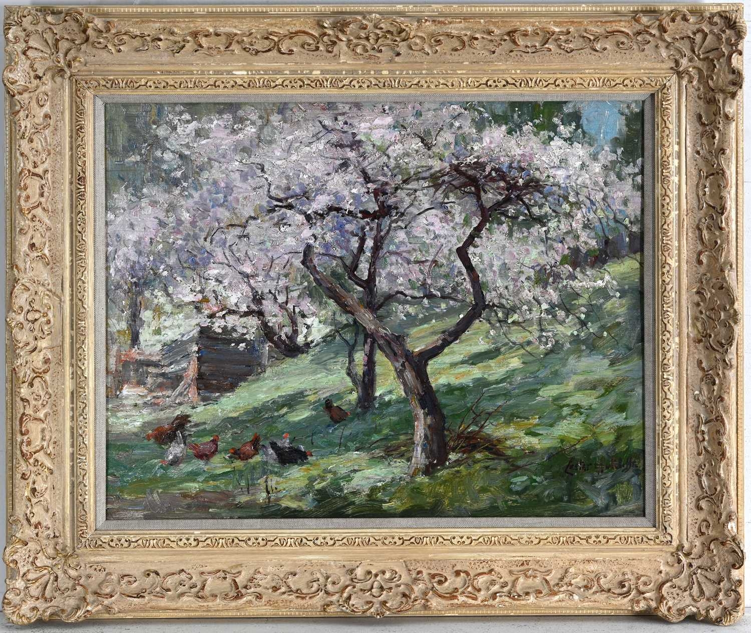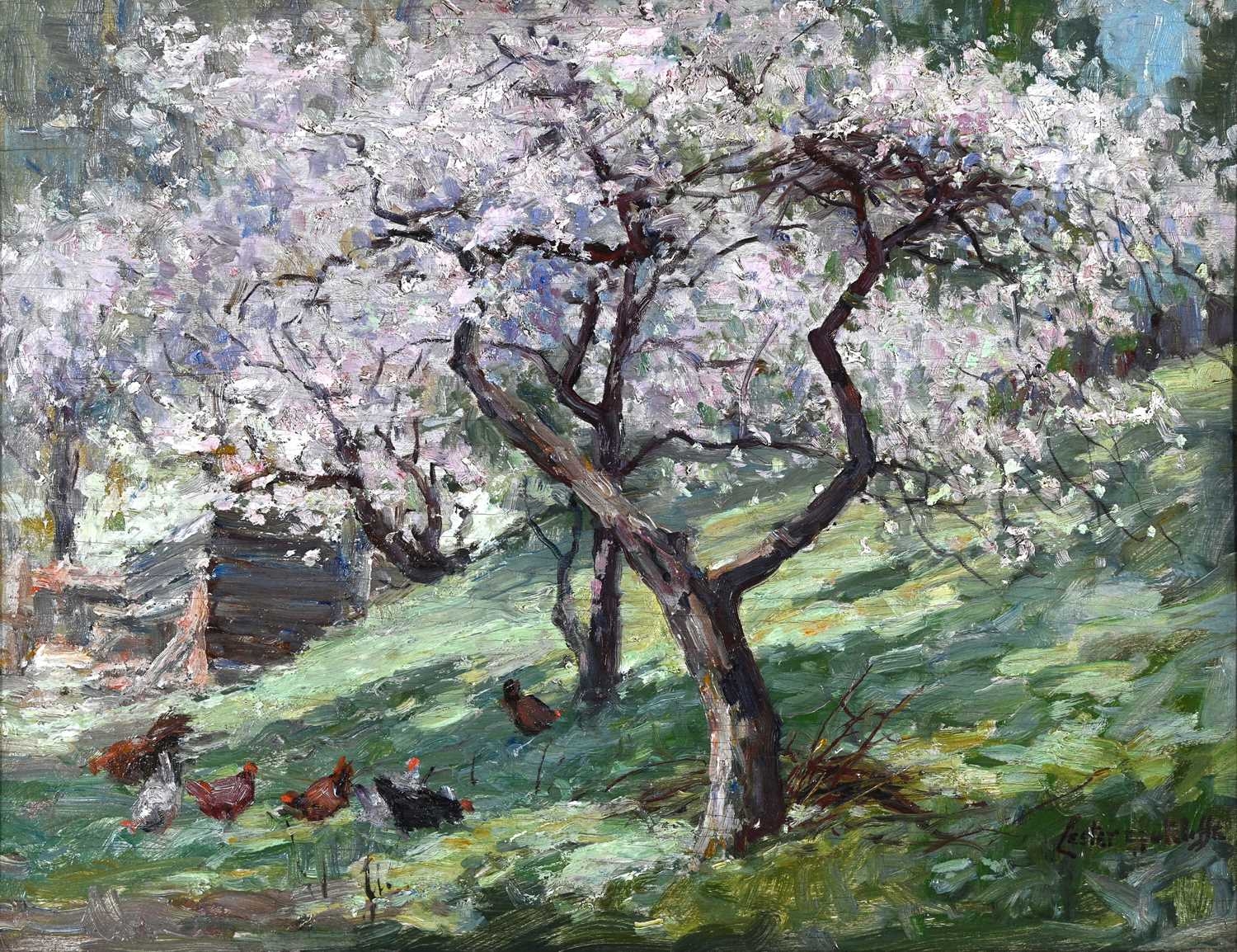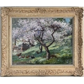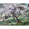 Lester Sutcliffe (British, 1848-1933), A Sun Lit Orchard, Shaw Lane, Headingly, signed l.r., titled verso, oil on board, 35 by 43cm, gilt frame. Provenance: with John Noott, Broadway