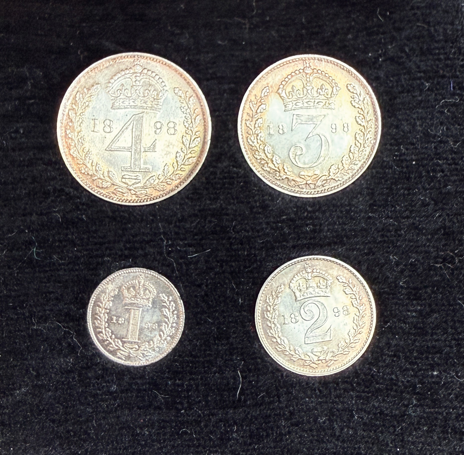 UK QV 1898 complete x4 coin silver Maundy set, comprising 1d, 2d, 3d, 4d, in good condition