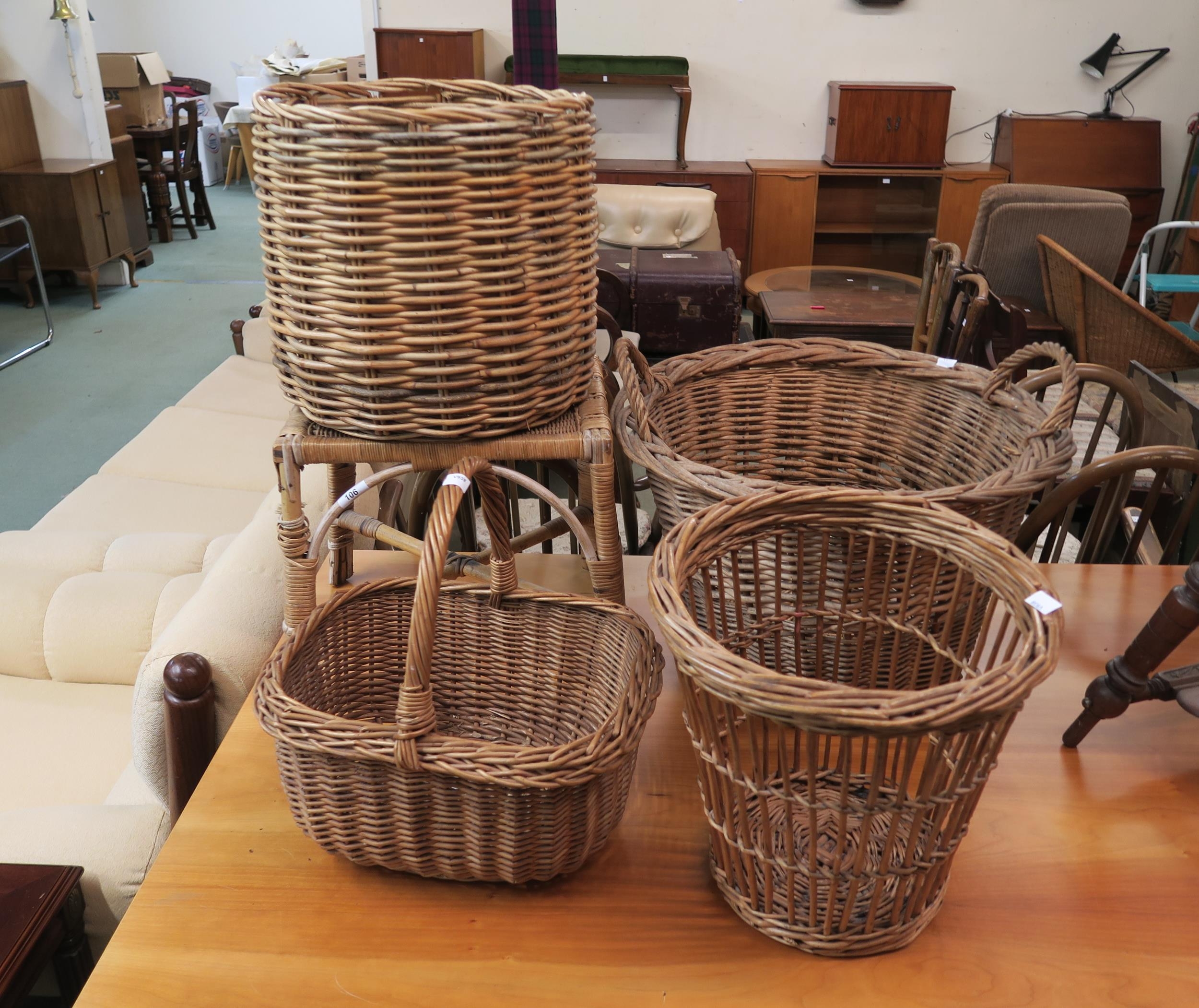 A lot of four wicker baskets and a wicker stool (5)