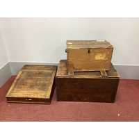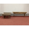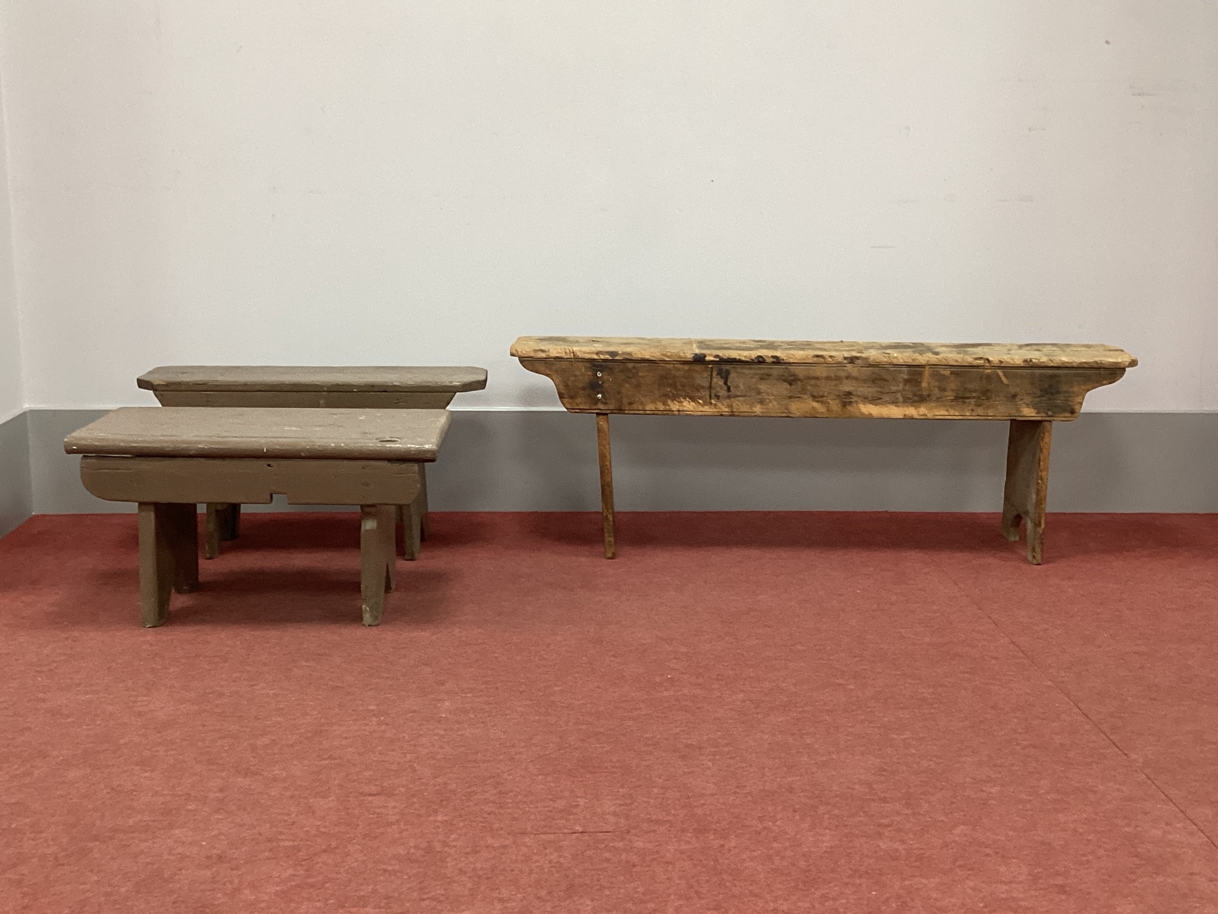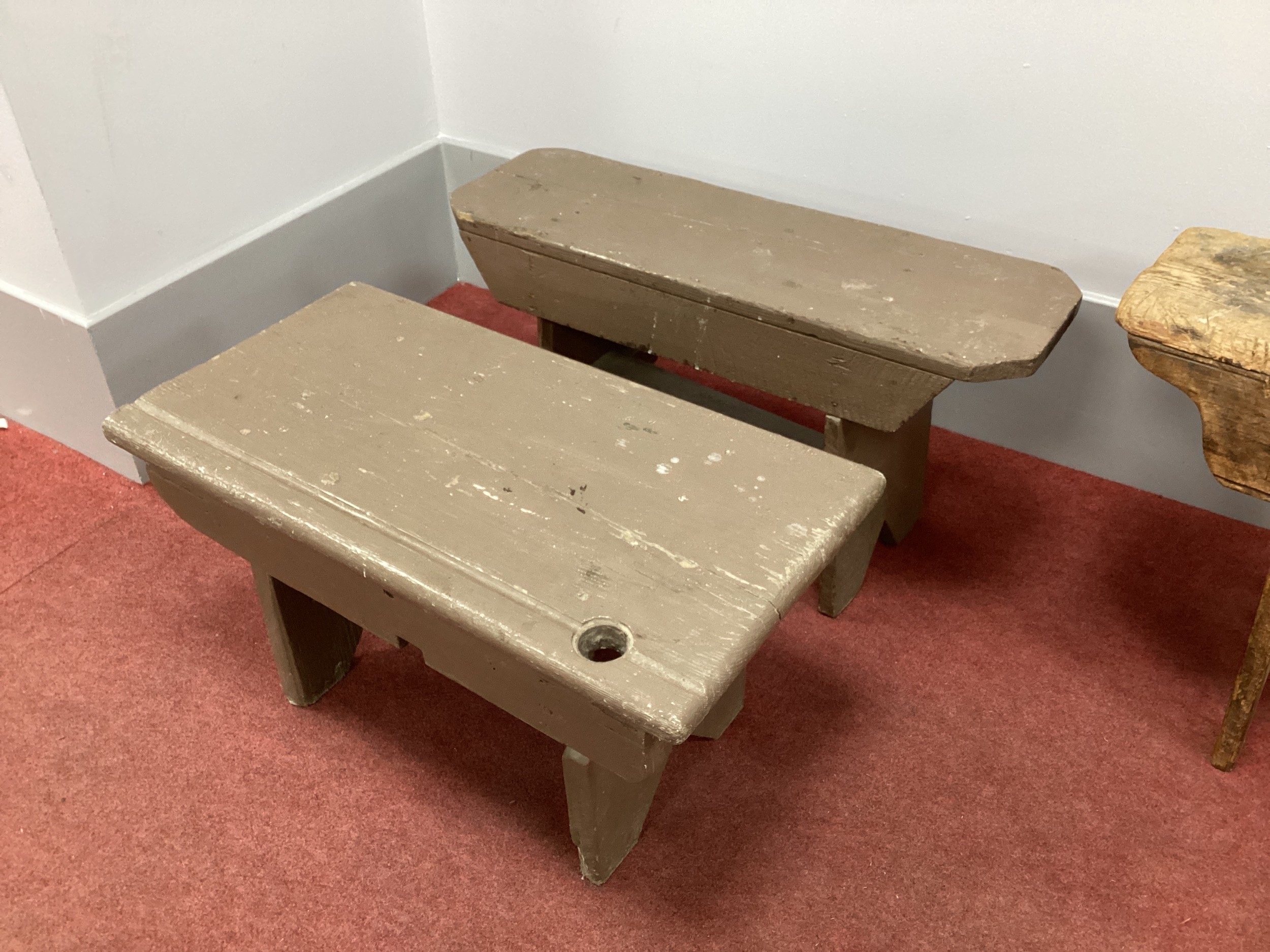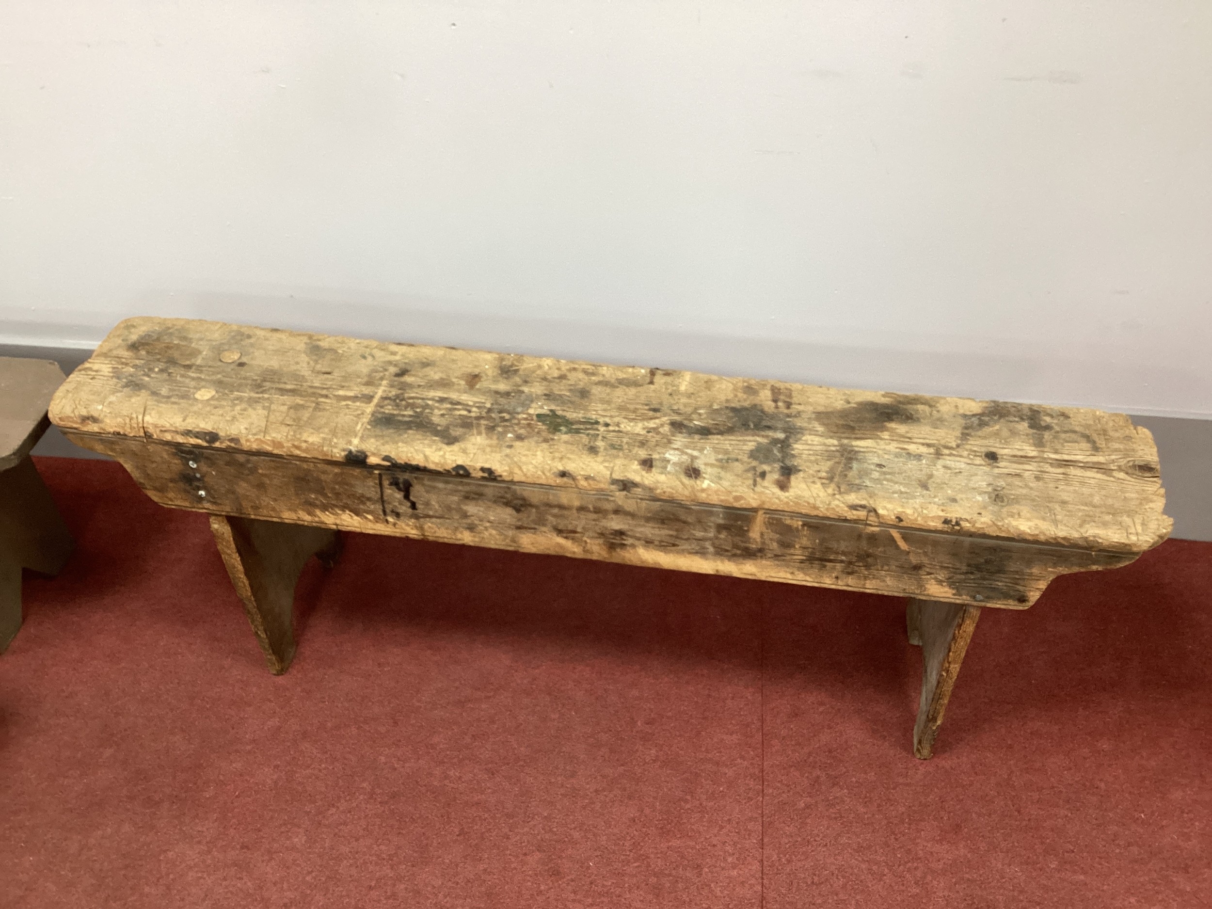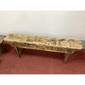 A Rustic Pine Bench, 130cm long; together with two painted stools. (3)