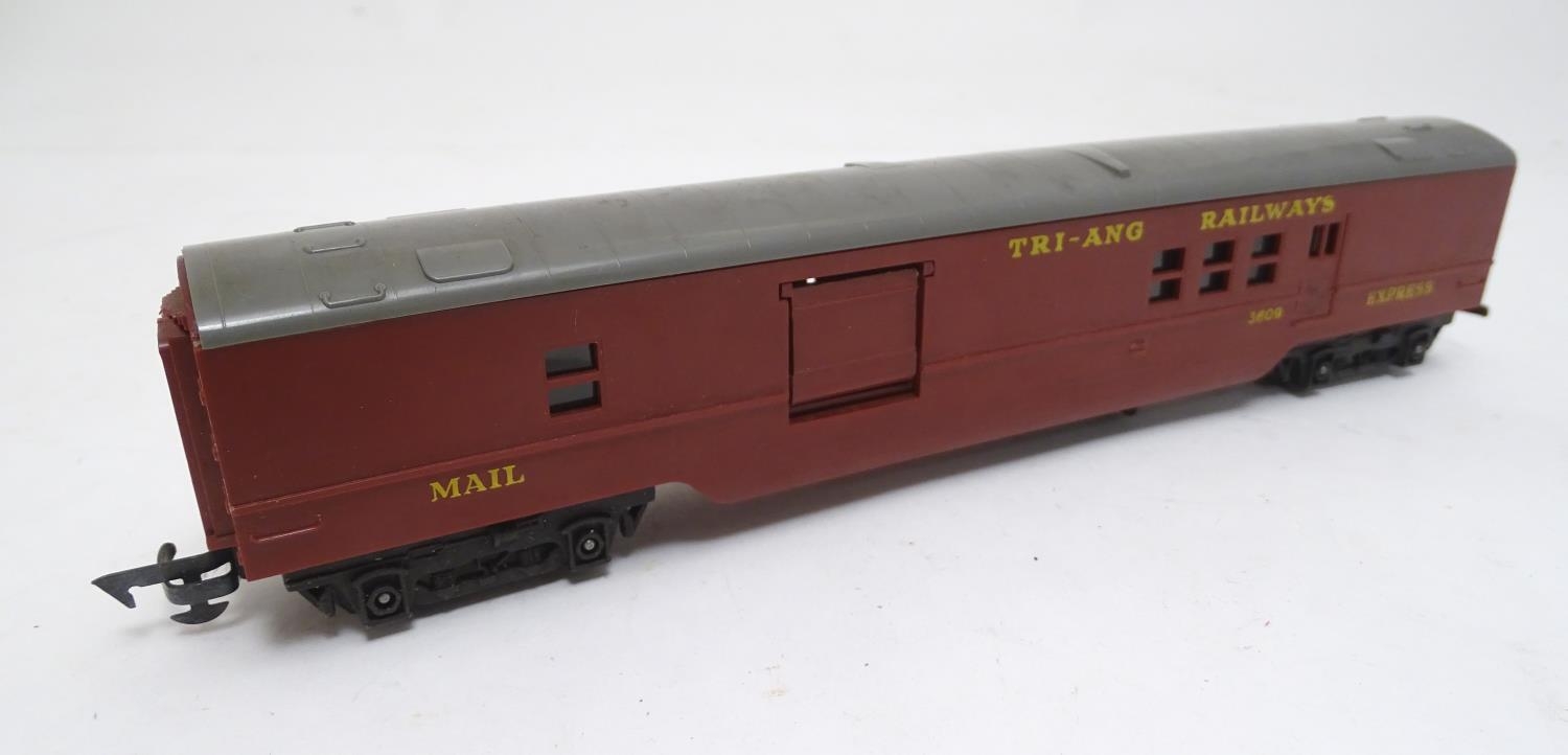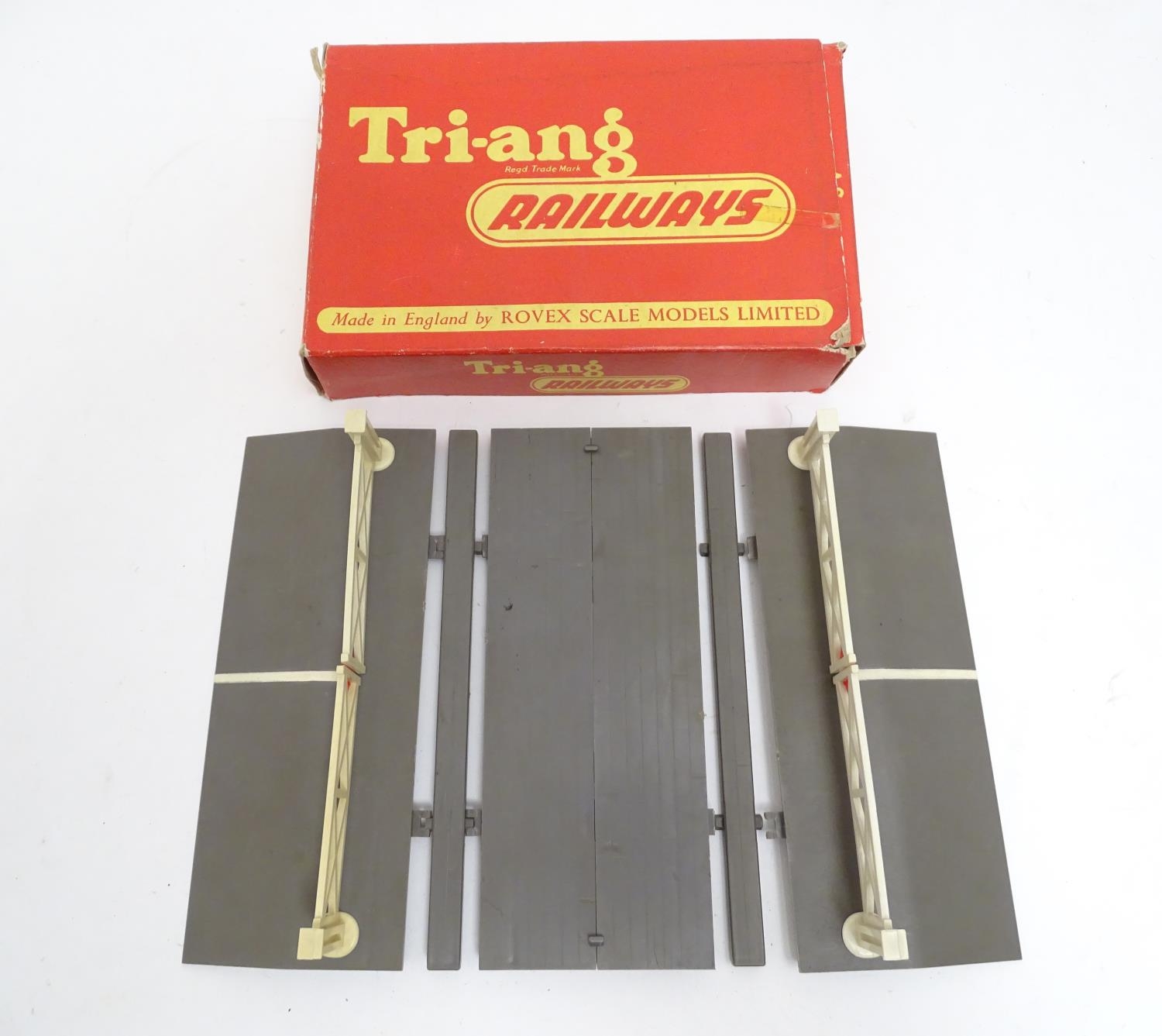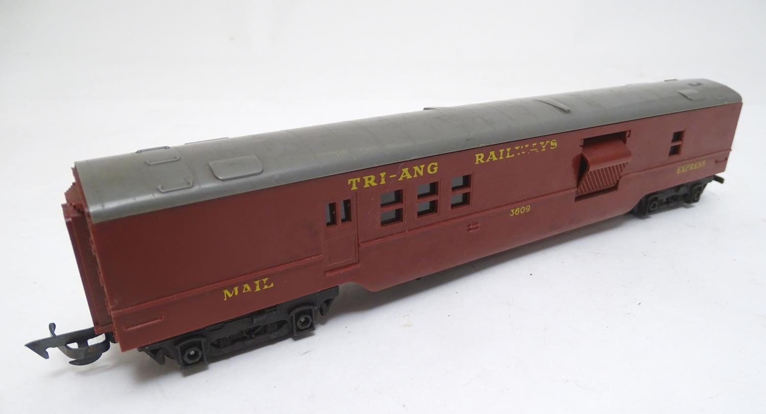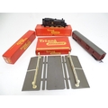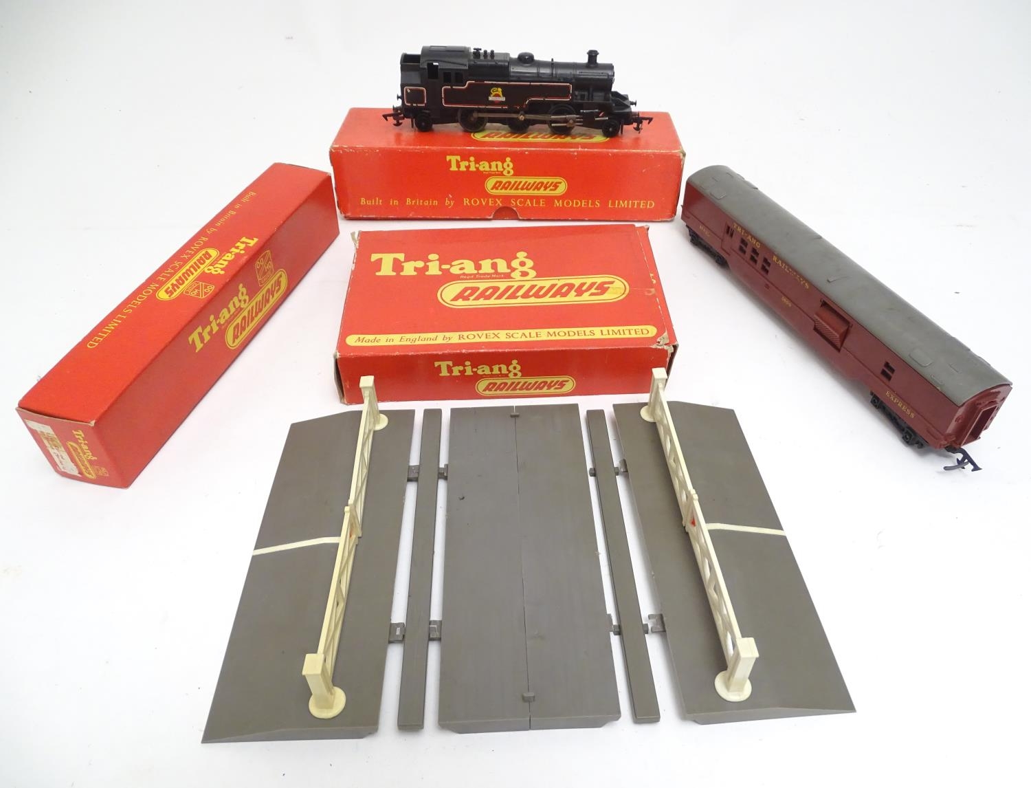A trio of Triang Railways 00 gauge models, comprising an R59 2-6-2 Tank Loco black livery (boxed), R1109 Mail Express 3609 carriage, and R70 level crossing (boxed), with a spare box (4)