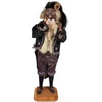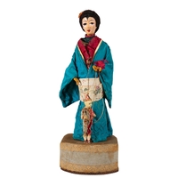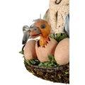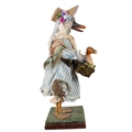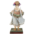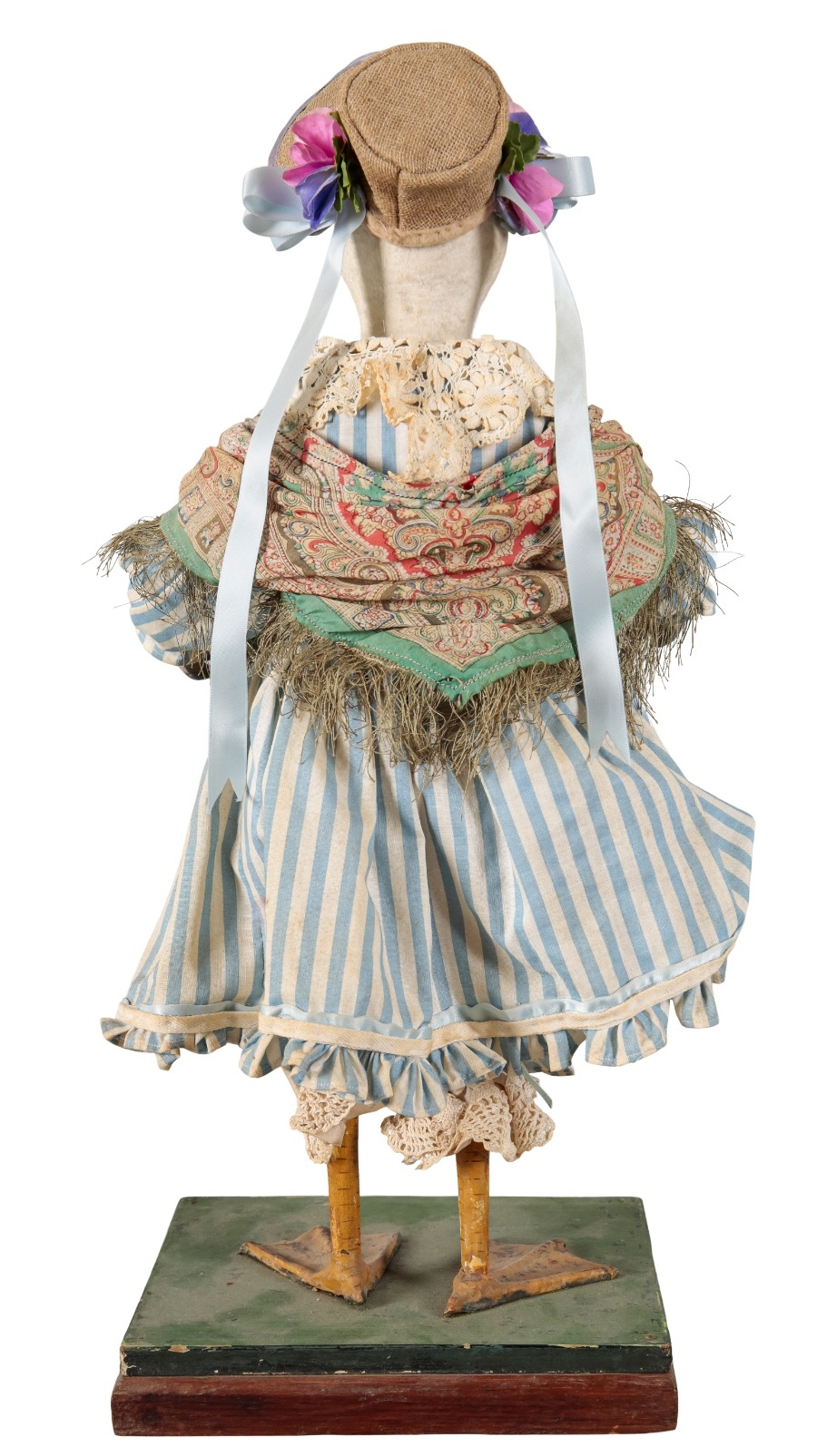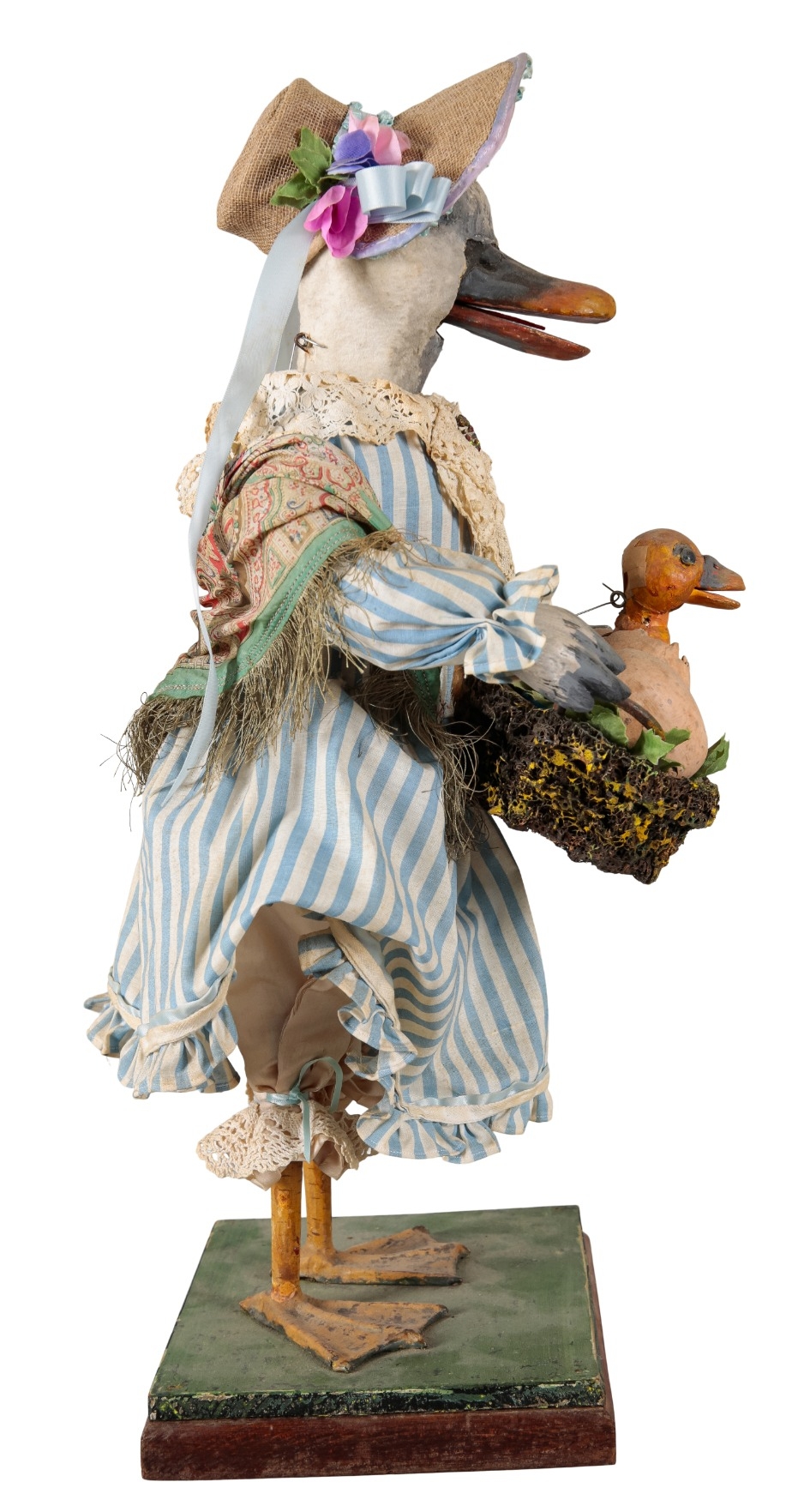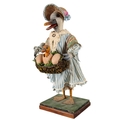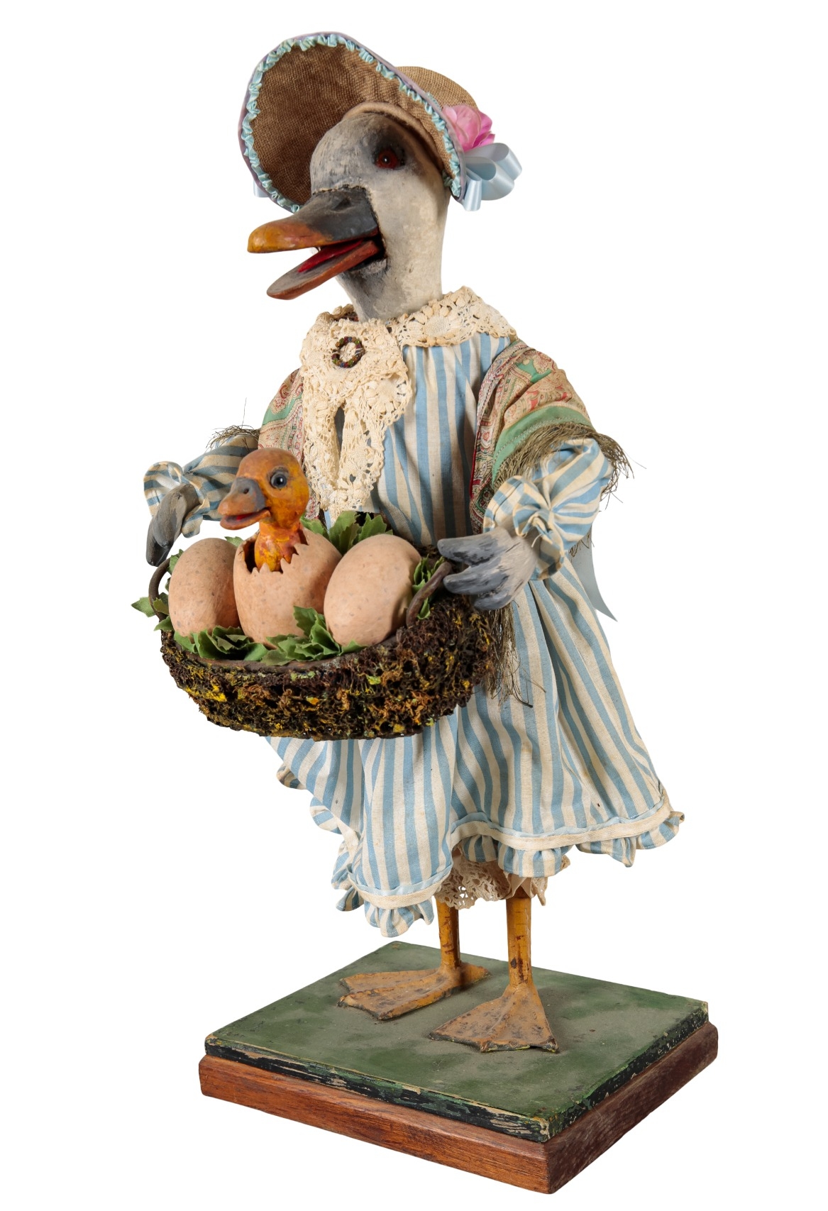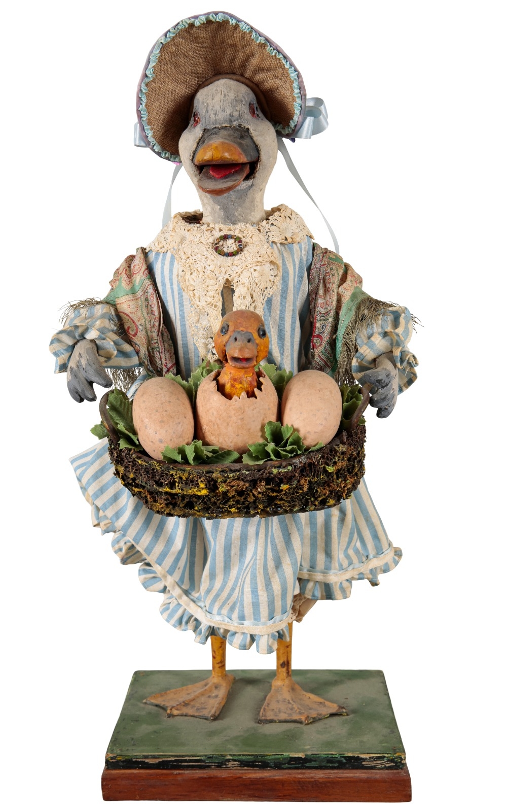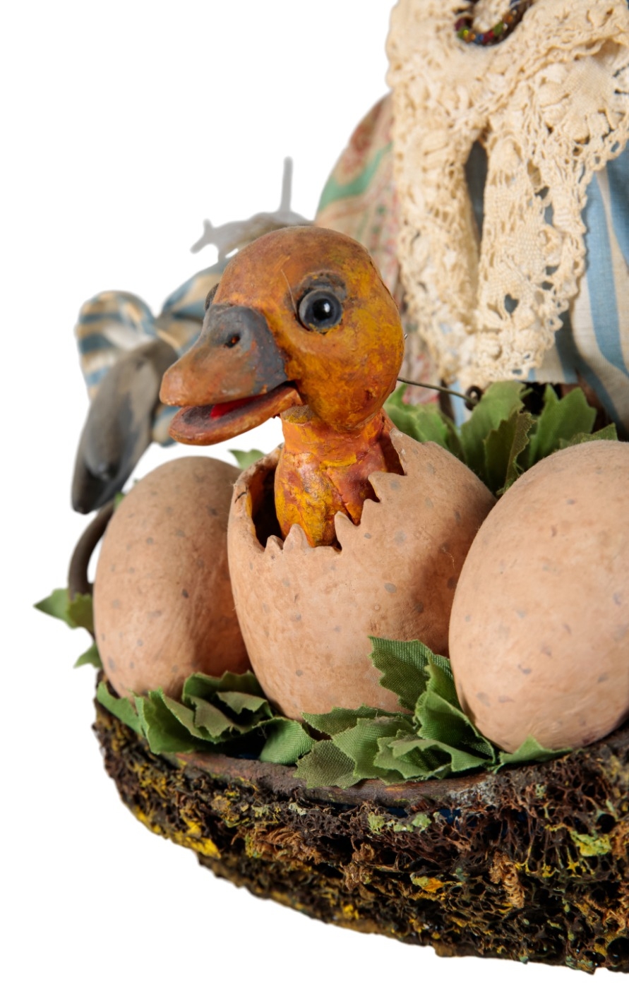 19th/20th century, modelled standing wearing a striped dress, holding a basket of eggs from which a duckling hatches, a winding key to the side, on a square plinth base, 56cm high overall