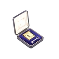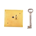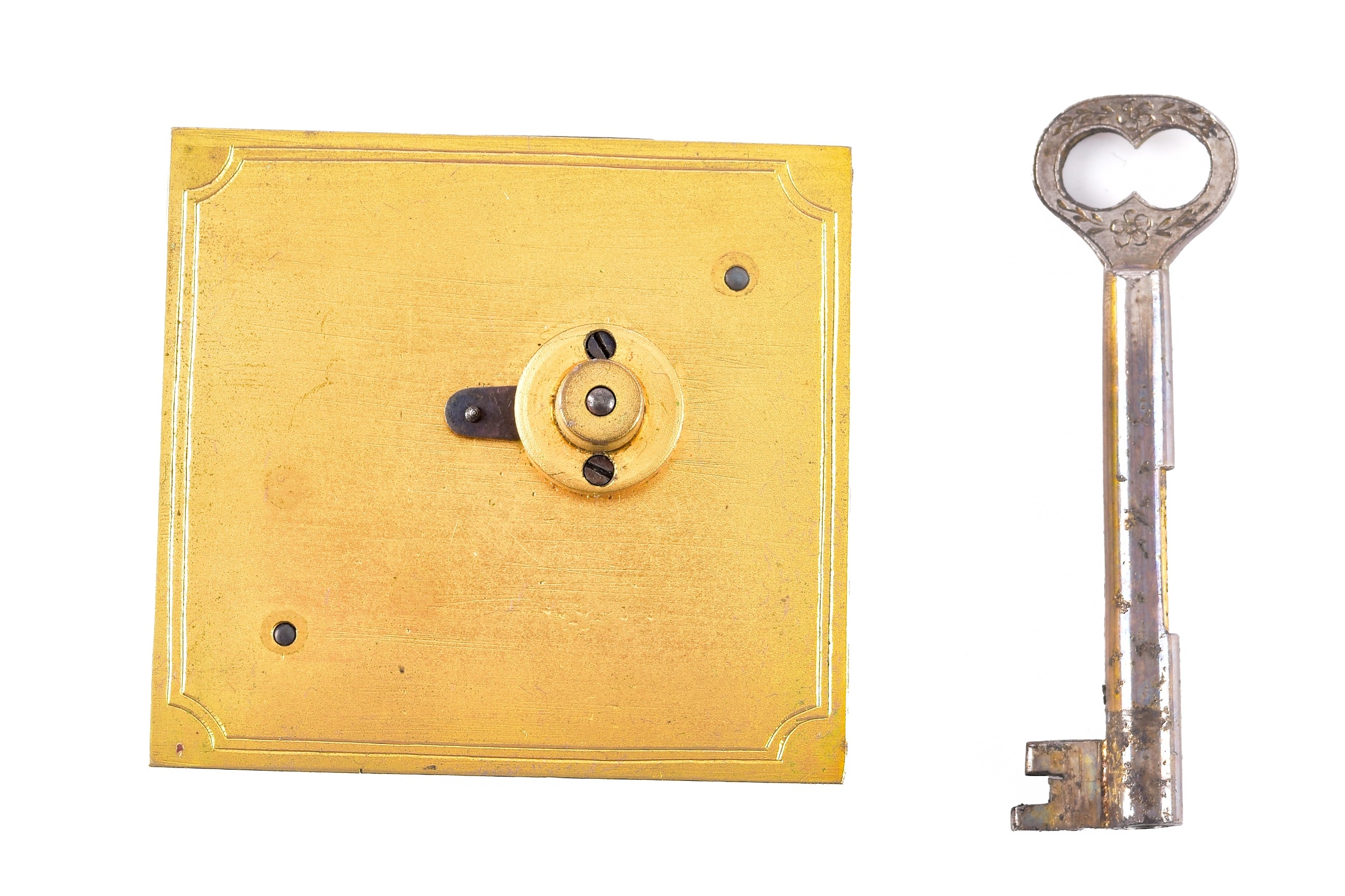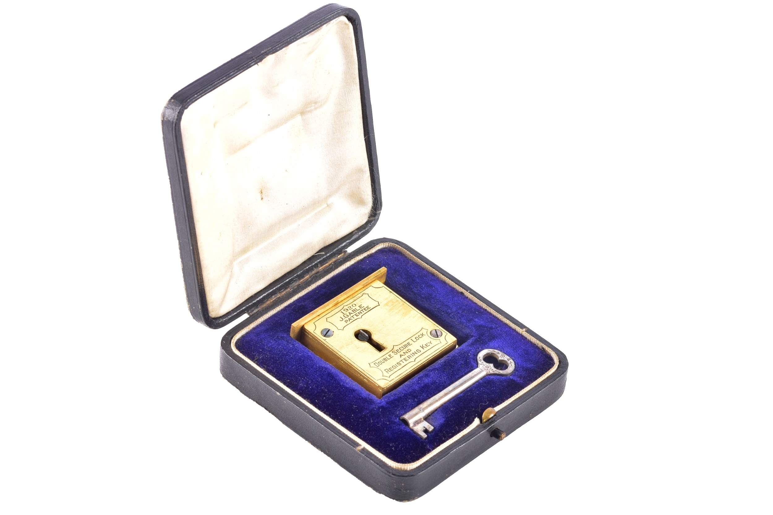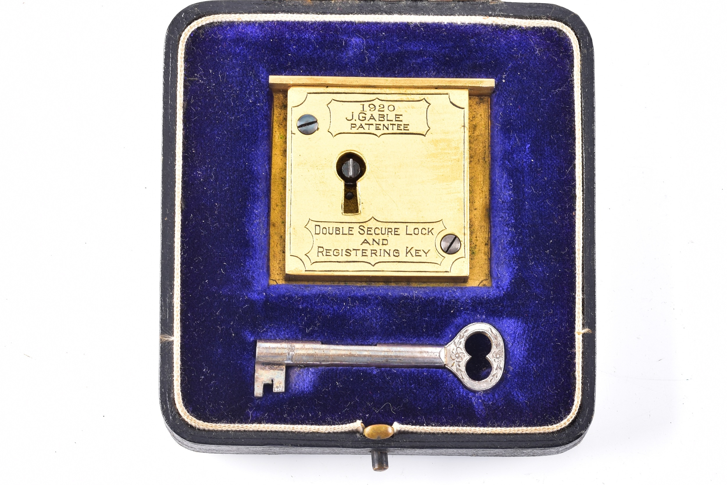 A 1920 J. Gable patented gilt brass double secure lock and registering key mechanism, of rectangular form with engraved decorative cartouche and keyhole aperture, secured by two screws, presented in its original fitted case with blue velvet lining and cream silk interior, together with steel key.