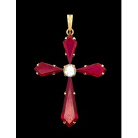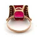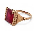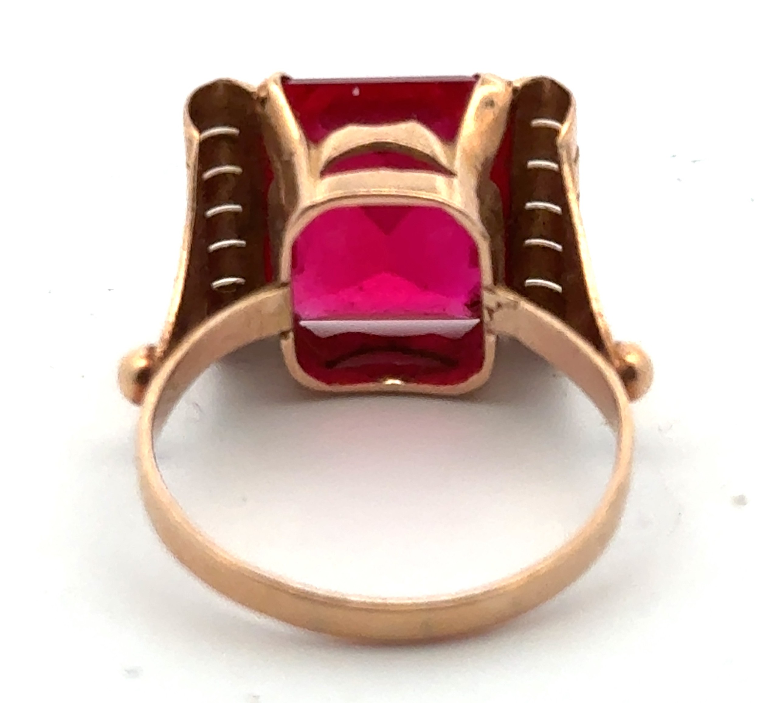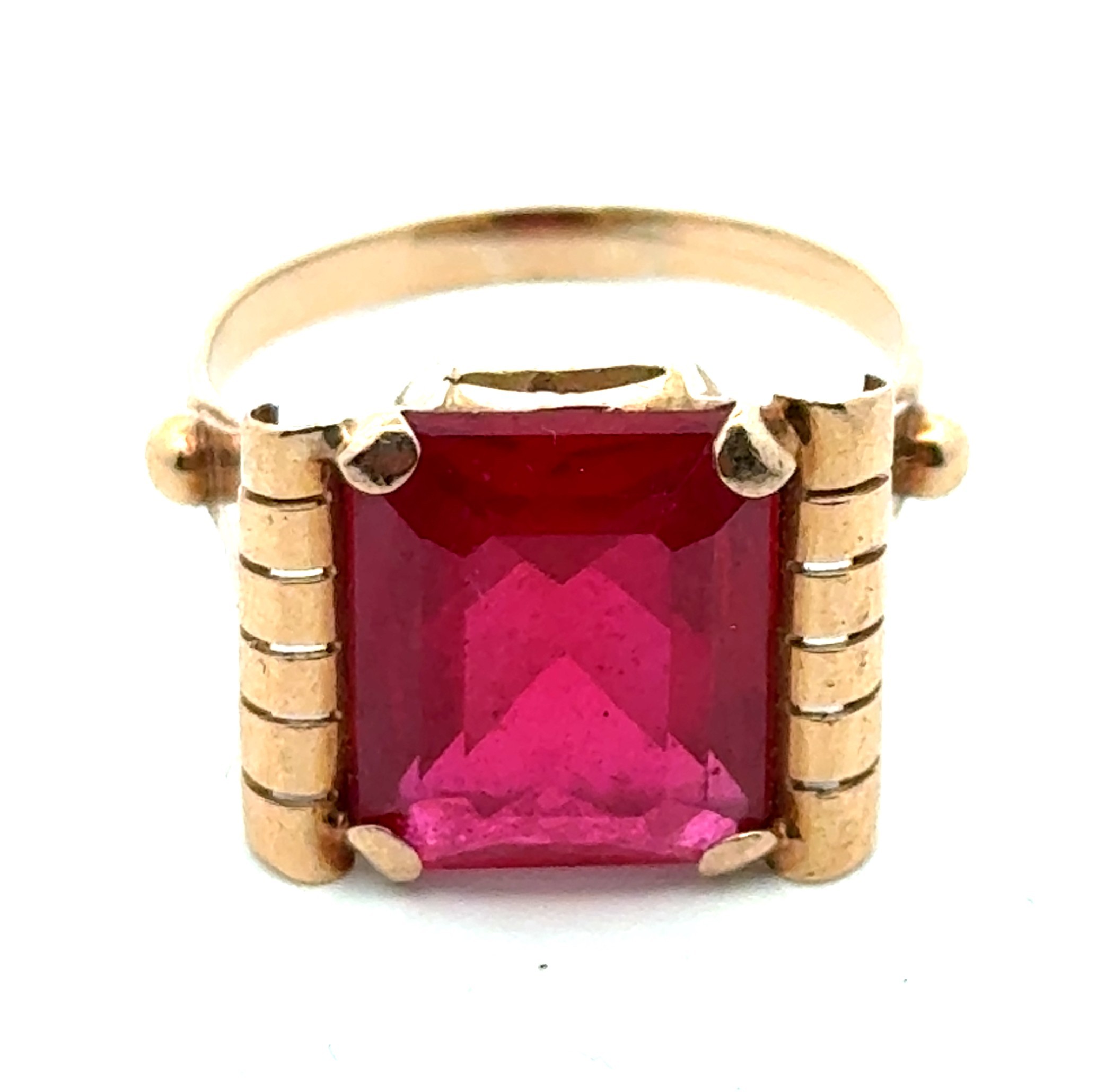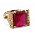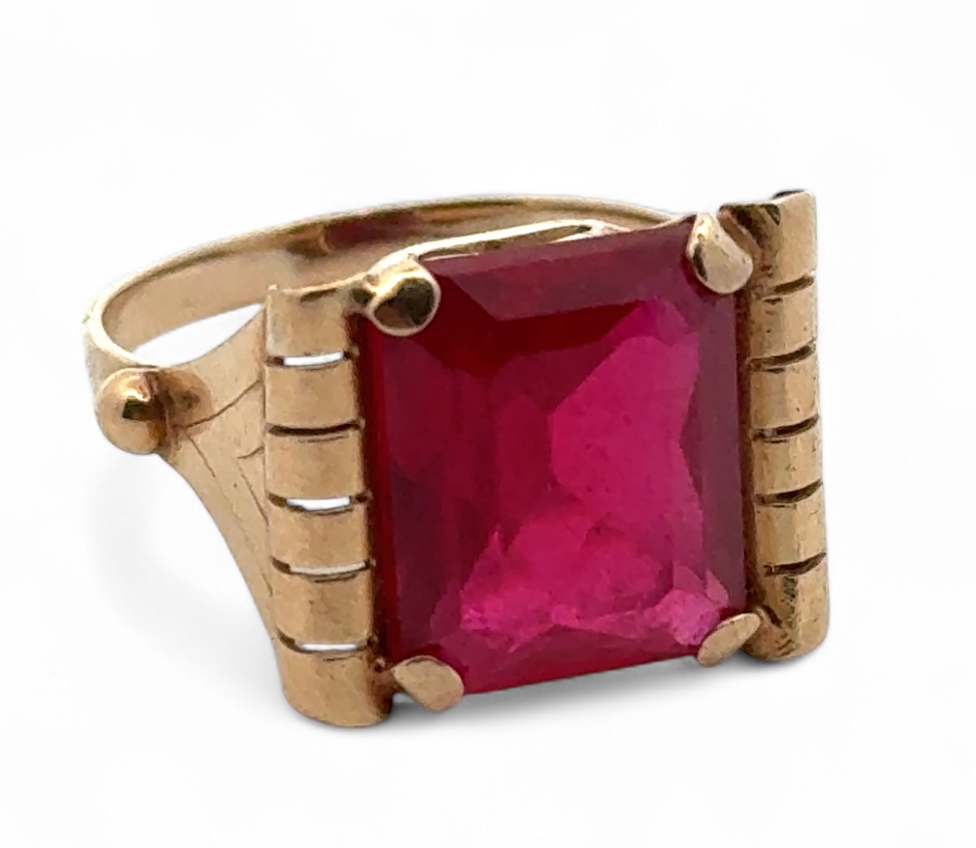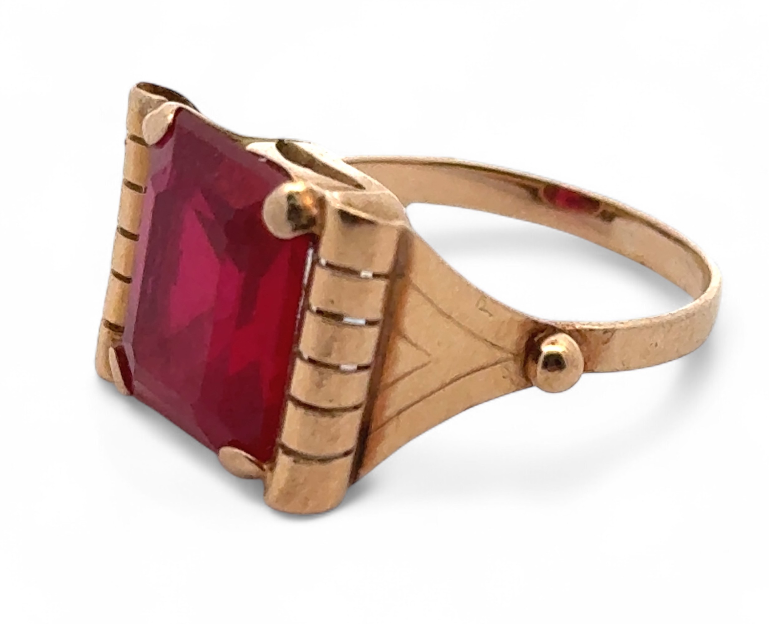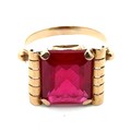 A synthetic ruby dress ring in unmarked metal stamped as 14ct. Size N. 4.12g