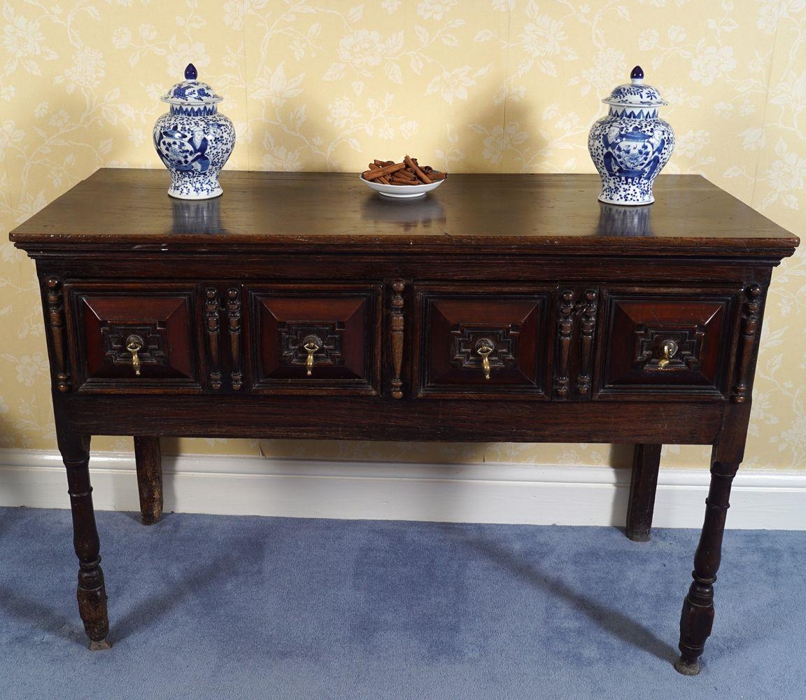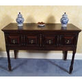 the rectangular shaped top with a moulded edge, above 3 frieze drawers furnished with teardrop brass handles, raised on turned legs. 86 cm high; 126 cm. wide; 54 cm. deep