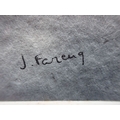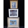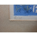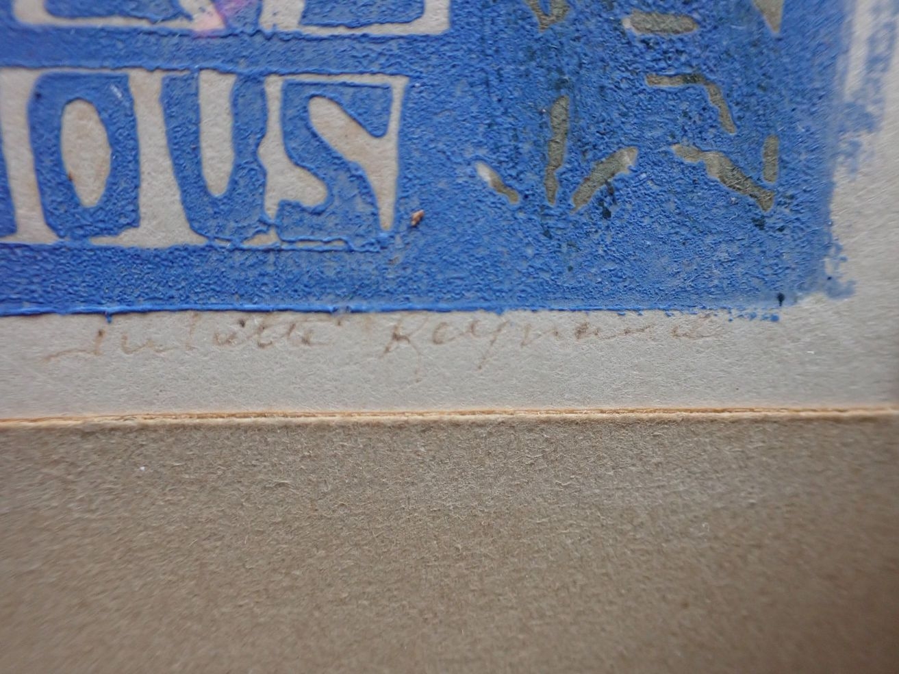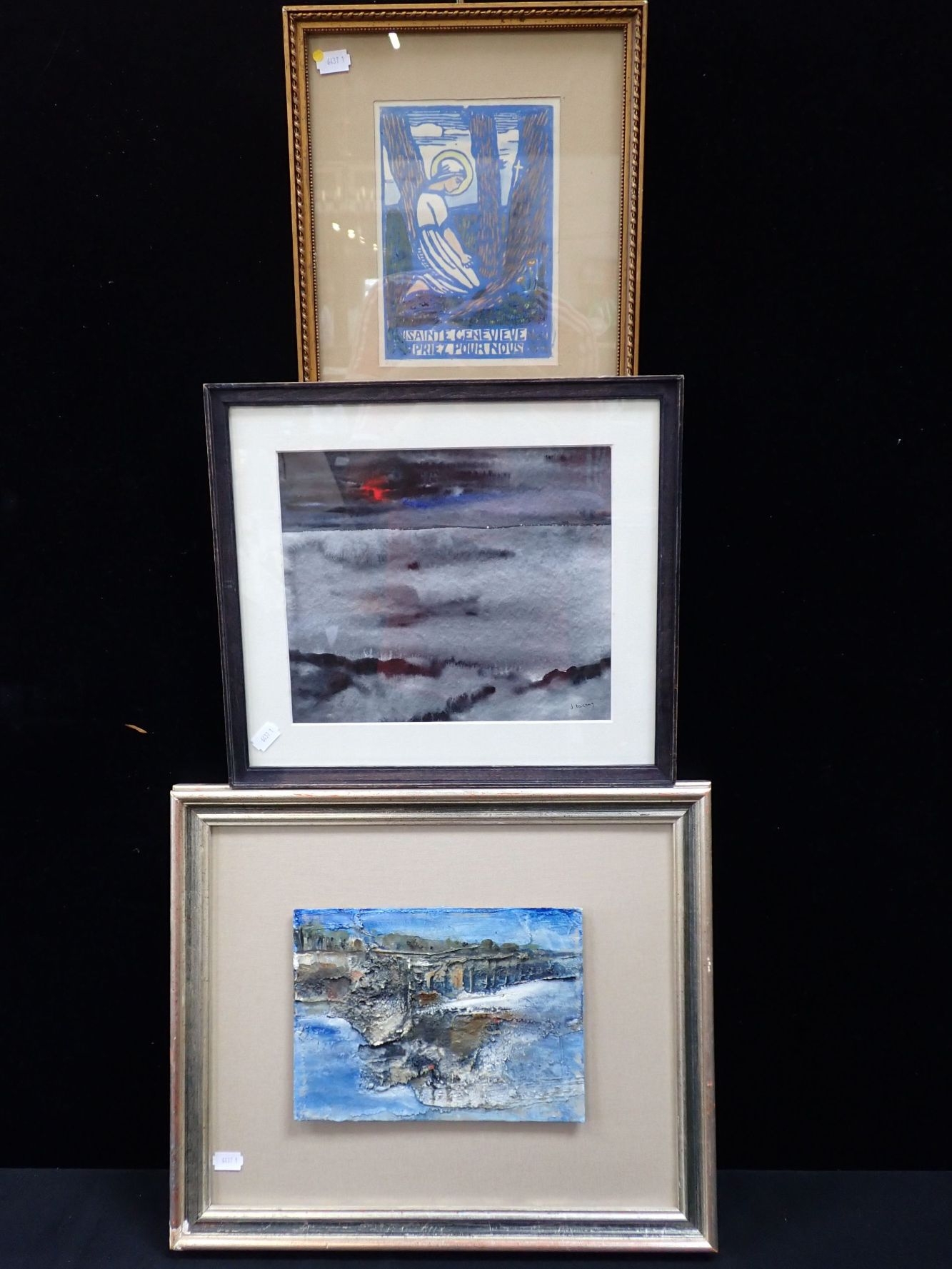 JULIETTE REYNAUD: 'SAINTE GENEVIEVE PRIEZ POUR NOUS' woodcut, c.1928, with an abstract oil on board inscribed 'Gert Schluter' to the back, and a watercolour by J. Fareng (3)