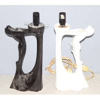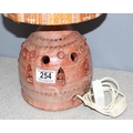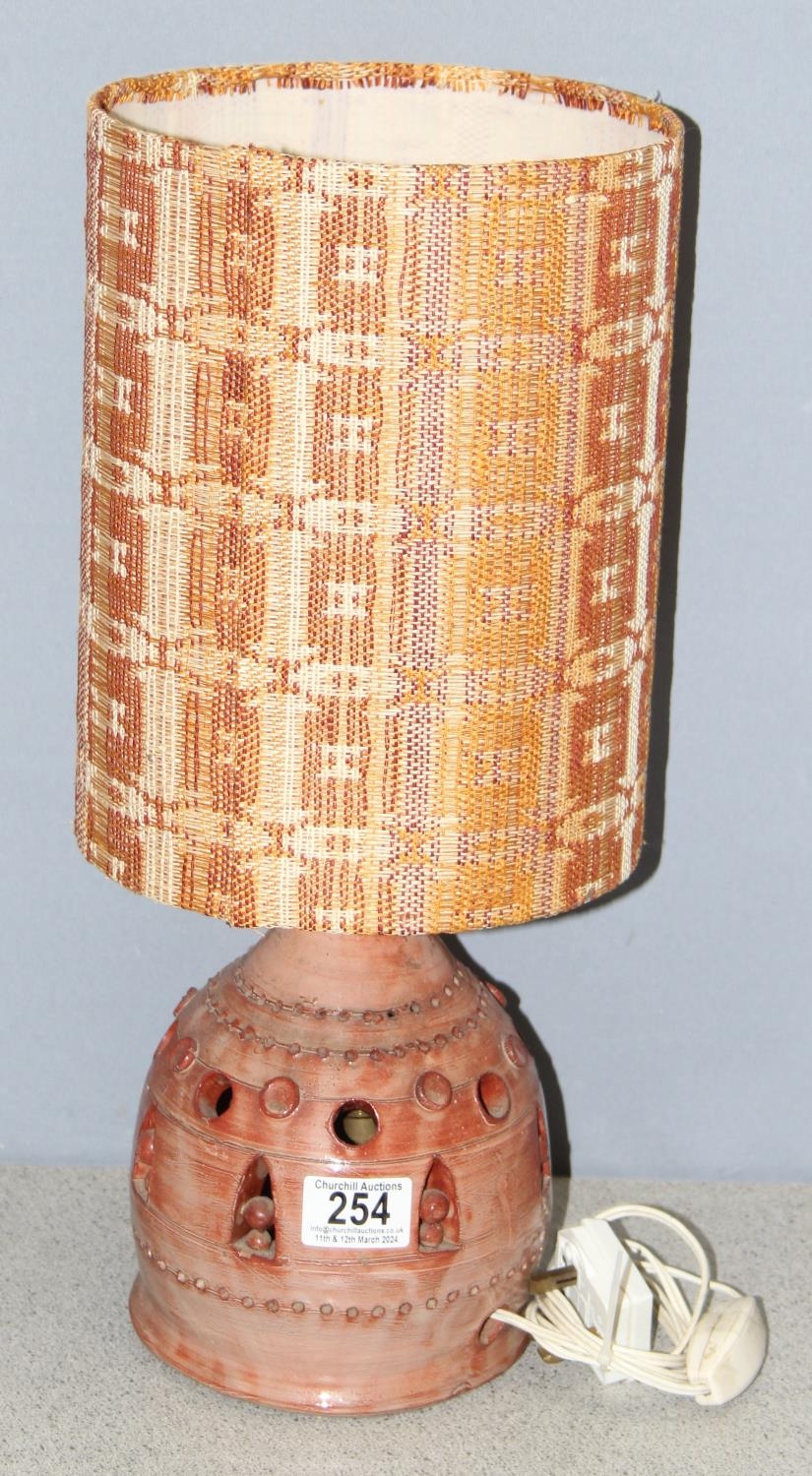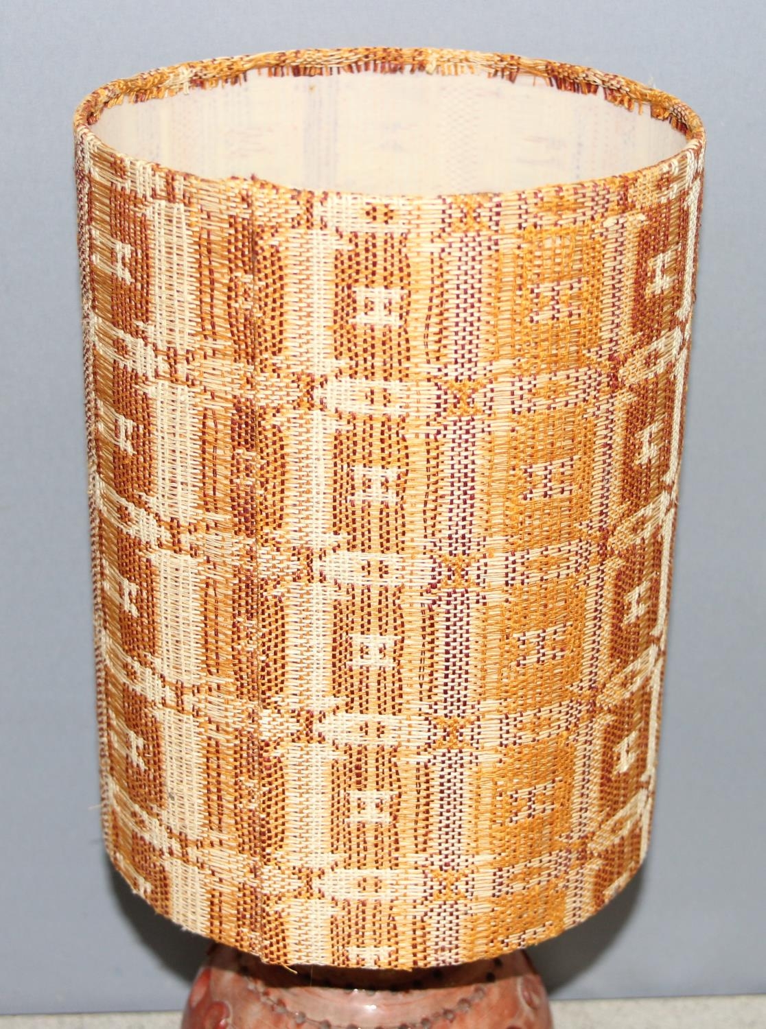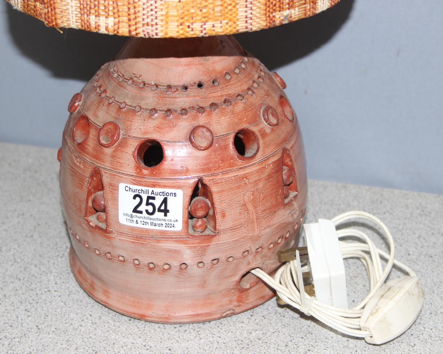 Glazed studio pottery lamp with retro woven shade, approx 47cm H
