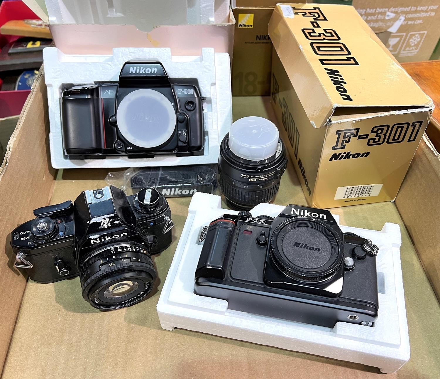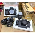 A Nikon EM SLR camera; 2 others; a Nikkor lens