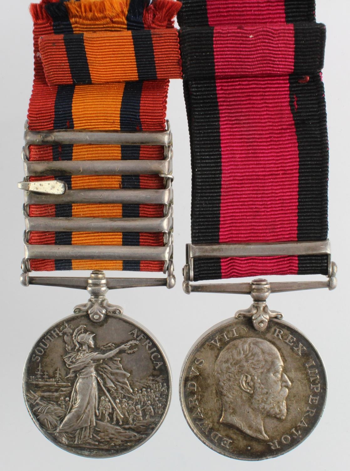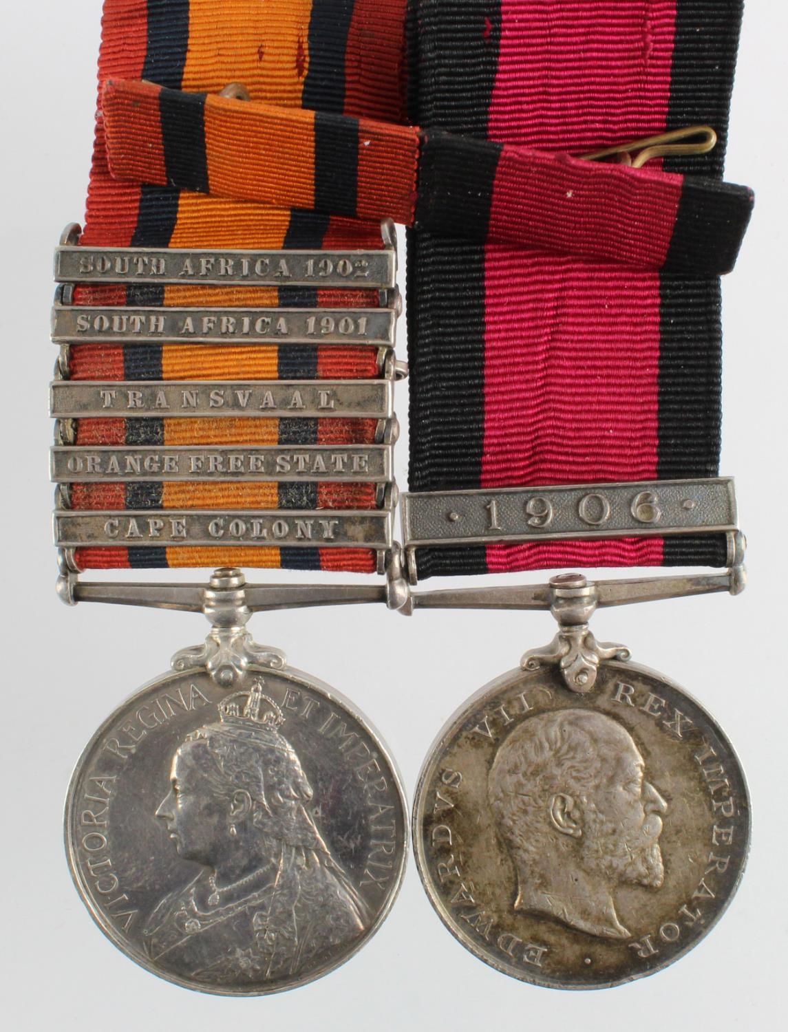 QSA with bars CC/OFS/Trans named (1159 3rd CL:Tpr: N Hutchings S.A.C.) served 'C' (Eastern) Division / Heidelberg South African Constabulary. Plus Natal Medal EDVII with 1906 clasp (Pte N Hutchings, Natal Rangers). (2)