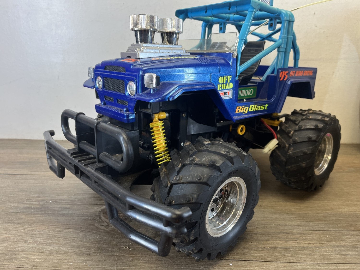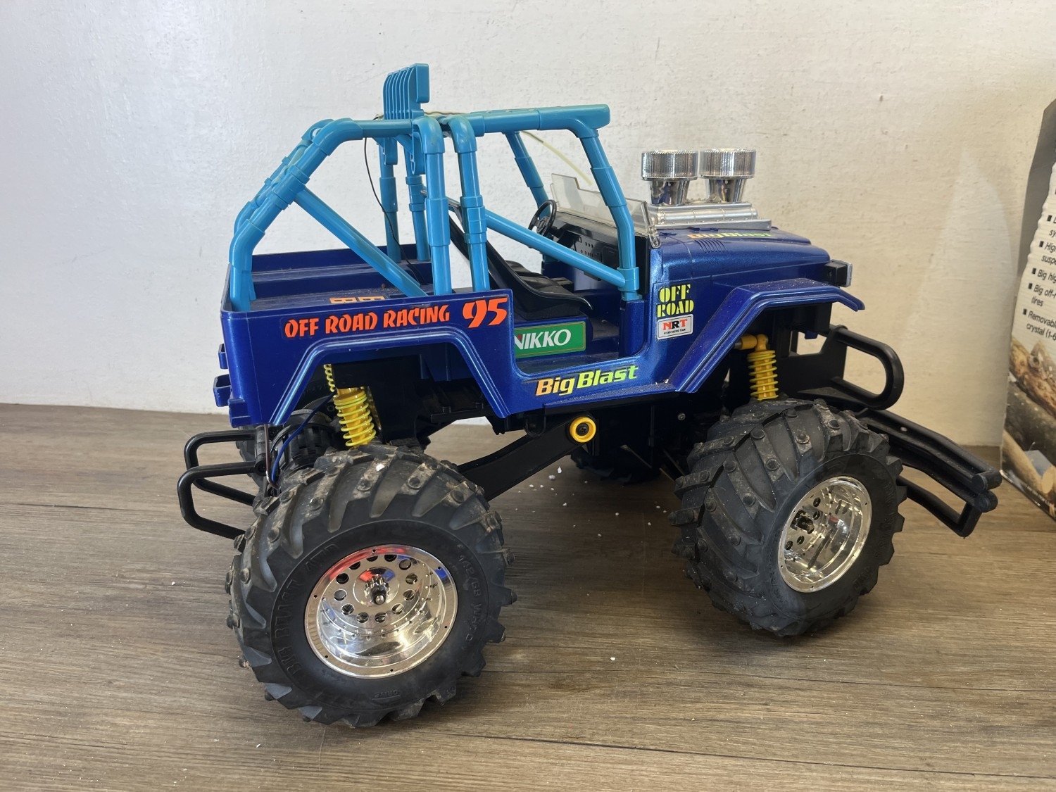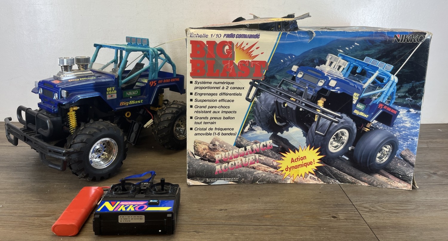 A boxed Nikko 1/10 scale radio control Big Blast off road truck