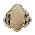 A VINTAGE 18CT GOLD OPAL AND DIAMOND RING The central oval c...
